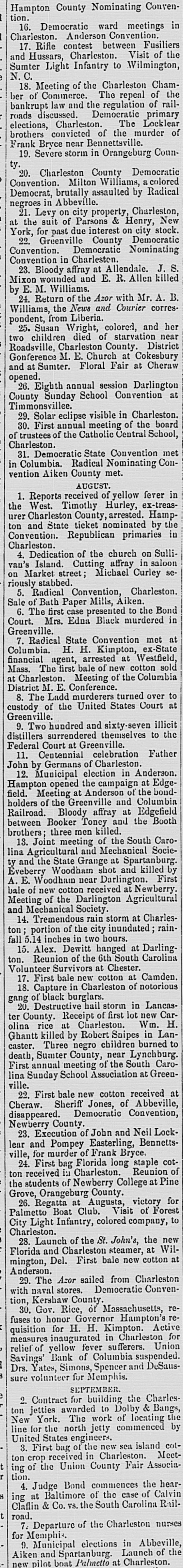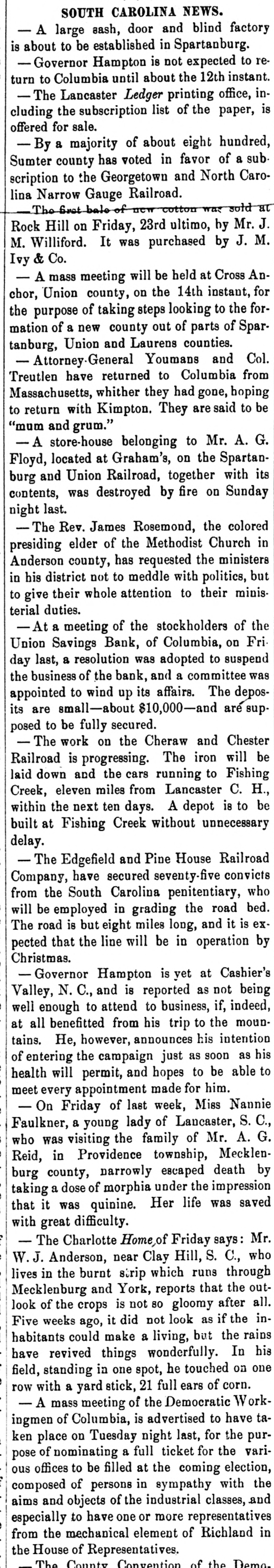 SOUTH CAROLINA NEWS. - A large sash, door and blind factory is about to be established in Spartanburg. - Governor Hampton is not expected to return to Columbia until about the 12th instant. - The Lancaster Ledger printing office, including the subscription list of the paper, is offered for sale. - By a majority of about eight hundred, Sumter county has voted in favor of a sub. scription to the Georgetown and North Carolina Narrow Gauge Railroad. The first bale of was sold at Rock Hill on Friday, 23rd ultimo, by Mr. J. M. Williford. It was purchased by J. M. Ivy & Co. - A mass meeting will be held at Cross Anchor, Union county, on the 14th instant, for the purpose of taking steps looking to the formation of a new county out of parts of Spartanburg, Union and Laurens counties. - Attorney-General Youmans and Col. Treutlen have returned to Columbia from Massachusetts, whither they had gone, hoping to return with Kimpton. They are said to be "mum and grum." - A store-house belonging to Mr. A. G. Floyd, located at Graham's, on the Spartanburg and Union Railroad, together with its contents, was destroyed by fire on Sunday night last. - The Rev. James Rosemond, the colored presiding elder of the Methodist Church in Anderson county, has requested the ministers in his district not to meddle with politics, but to give their whole attention to their ministerial duties. - At a meeting of the stockholders of the Union Savings Bank, of Columbia, on Friday last, a resolution was adopted to suspend the business of the bank, and a committee was appointed to wind up its affairs. The deposits are small-about $10,000-and are supposed to be fully secured. - The work on the Cheraw and Chester Railroad is progressing. The iron will be laid down and the cars running to Fishing Creek, eleven miles from Lancaster C. H., within the next ten days. A depot is to be built at Fishing Creek without unnecessary delay. - The Edgefield and Pine House Railroad Company, have secured seventy-five convicts from the South Carolina penitentiary, who will be employed in grading the road bed. The road is but eight miles long, and it is expected that the line will be in operation by Christmas. - Governor Hampton is yet at Cashier's Valley, N. C., and is reported as not being well enough to attend to business, if, indeed, at all benefitted from his trip to the mountains. He, however, announces his intention of entering the campaign just as soon as his health will permit, and hopes to be able to meet every appointment made for him. - On Friday of last week, Miss Nannie Faulkner, a young lady of Lancaster, S. C., who was visiting the family of Mr. A. G. Reid, in Providence township, Mecklenburg county, narrowly escaped death by taking a dose of morphia under the impression that it was quinine. Her life was saved with great difficulty. - The Charlotte Home of Friday says: Mr. W.J. Anderson, near Clay Hill, S. C., who lives in the burnt strip which runs through Mecklenburg and York, reports that the outlook of the crops is not 80 gloomy after all. Five weeks ago, it did not look as if the inhabitants could make a living, but the rains have revived things wonderfully. In his field, standing in one spot, he touched on one row with a yard stick, 21 full ears of corn. - A mass meeting of the Democratic Workingmen of Columbia, is advertised to have taken place on Tuesday night last, for the purpose of nominating a full ticket for the various offices to be filled at the coming election, composed of persons in sympathy with the aims and objects of the industrial classes, and especially to have one or more representatives from the mechanical element of Richland in the House of Representatives. The County Convention of the Demo-