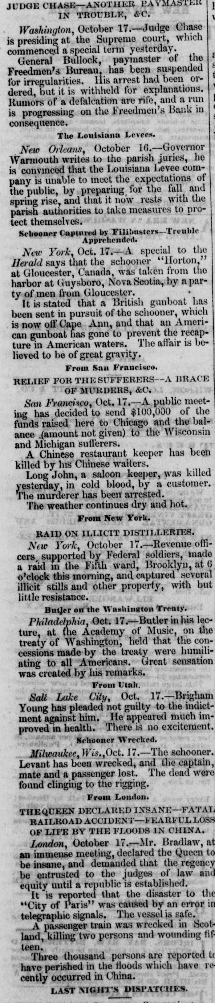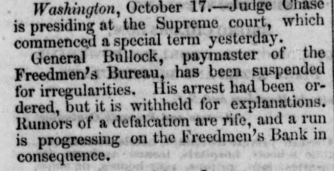 General Bullock, paymaster of the Freedmen's Bureau, has been suspended for irregularities. His arrest had been ordered, but it is withheld for explanations. Rumors of a defalcation are rife, and a run is progressing on the Freedmen's Bank in consequence.