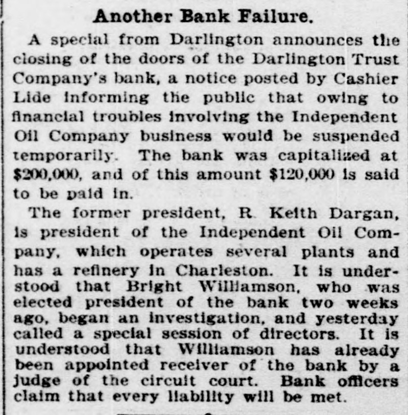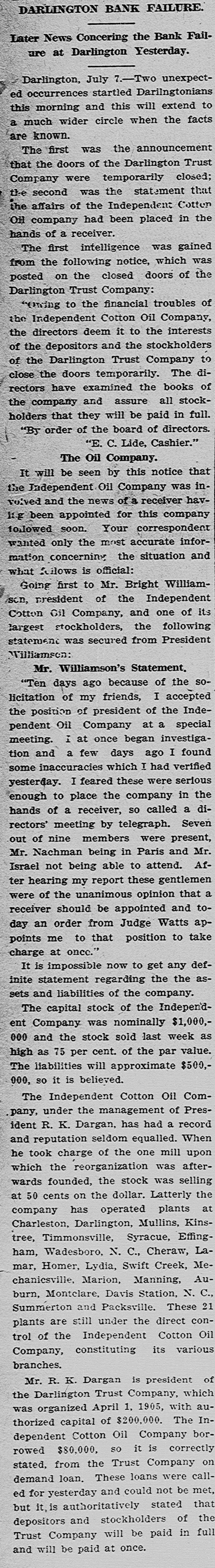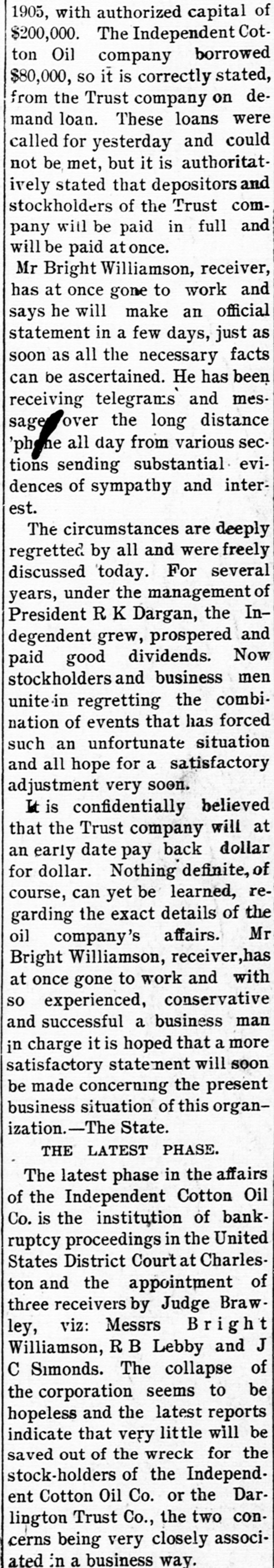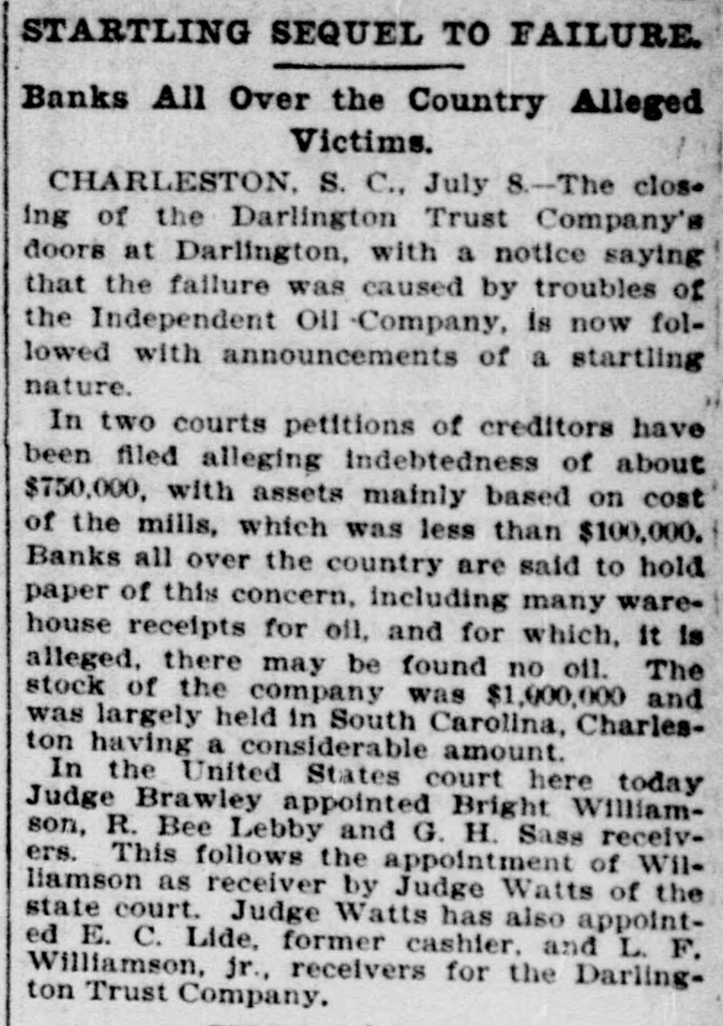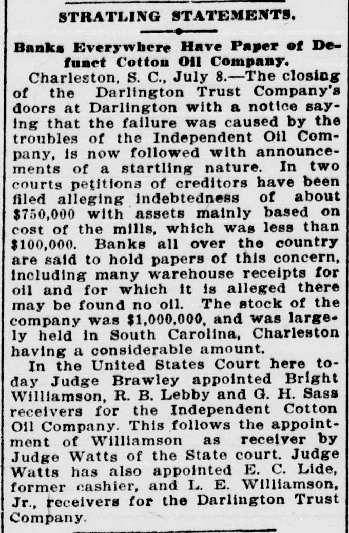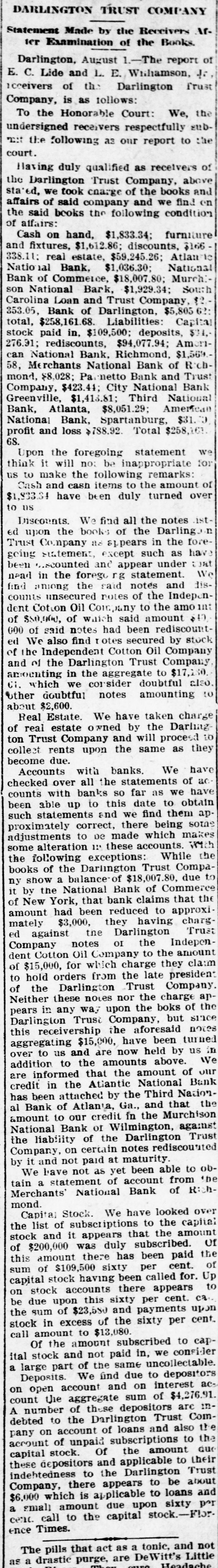 C. Lide and L. E. Wishamson, 1: , reivers of the Darlington Trust ompany, is as follows: To the Honorable Court: We, the adersigned receivers respectfully subthe following as our report to the Having duly qualified as receivers of Darlington Trust Company, above we took charge of the books and of said company and we find on said books the following condition affairs: Cash on hand, $1,833.34; furniture fixtures, $1,612.86; discounts, $166 real estate, $59,245.26; Atlantic al Bank, $1,036.30; National of Commerce, $18,007.80; Murch:National Bark, $1,929.34; South arolina Loan and Trust Company, 12.3.05, Bank of Darlington, $5,805 62: $258,161.68. Liabilities: Capital paid in, $109,500; deposits, $31,6.91; rediscounts, $94,077.94; AmeriNational Bank, Richmond, $1,569.Merchants National Bank of R:ch$8,028; netto Bank and Trust ompany, $423.44; City National Bank reenville, $1,413.81; Third National Atlanta, $8,051.29; American ational Bank, Spartanburg, $31.00 and loss $788.92. Total $258,161. Upon the foregoing statement we it will no: be inappropriate for to make the following remarks: Cash and cash items to the amount of have been duly turned over us Discounts. We find all the notes listupon the books of the Darling n Company as spears in the forestatement, except such as have ...scounted and appear under that in the forego rg statement. We among the said notes and disunsecured notes of the IndepenCotton Oil Company to the amo int $80,000, of which said amount $10,of said notes had been rediscountWe also find rotes secured by stock the Independent Cotton Oil Company of the Darlington Trust Company moenting in the aggregate to $17,180. which we corsider doubtful also doubtful notes amounting to $2,600. Real Estate. We have taken charge real estate owned by the Darling Trust Company and will proceed to bllect rents upon the same as they due. ecome Accounts with banks. We have necked over all the statements of ac with banks SO far as we have able up to this date to obtain statements and we find them ap coximately correct, there being sotas djustments to De made which makes alteration 12' these accounts. With following exceptions: While the of the Darlington Trust Compa show a balance of $18,007.80, due to by the National Bank of Commerce New York, that bank claims that the mount had been reduced to approxi $3,000, they having charg against the Darlington Trust ompany notes OI the Indepen Cotton Oil Company to the amount $15,000, for which charge they claim hold orders from the late presiden the Darlington Trust Company Jeither these notes nor the charge an in any way upon the boks of the Darlington Trust Company, but since receivership the aforesaid note ggregating $15,000, have been turne: to us and are now held by us a ddition to the amounts above. W informed that the amount of on redit in the Atlantic National Banl been attached by the Third Nation Bank of Atlania, Ga., and that th mount to our credit in the Murchisor National Bank of Wilmington, agains he liability of the Darlington Trus tompany, on certain notes rediscounte it and not paid at maturity. We have not as yet been able to ob a statement of account from 1b ferchants' National Bank of Rich