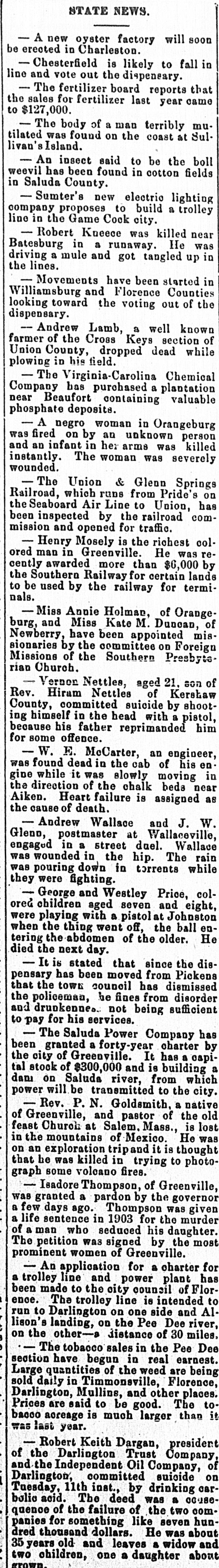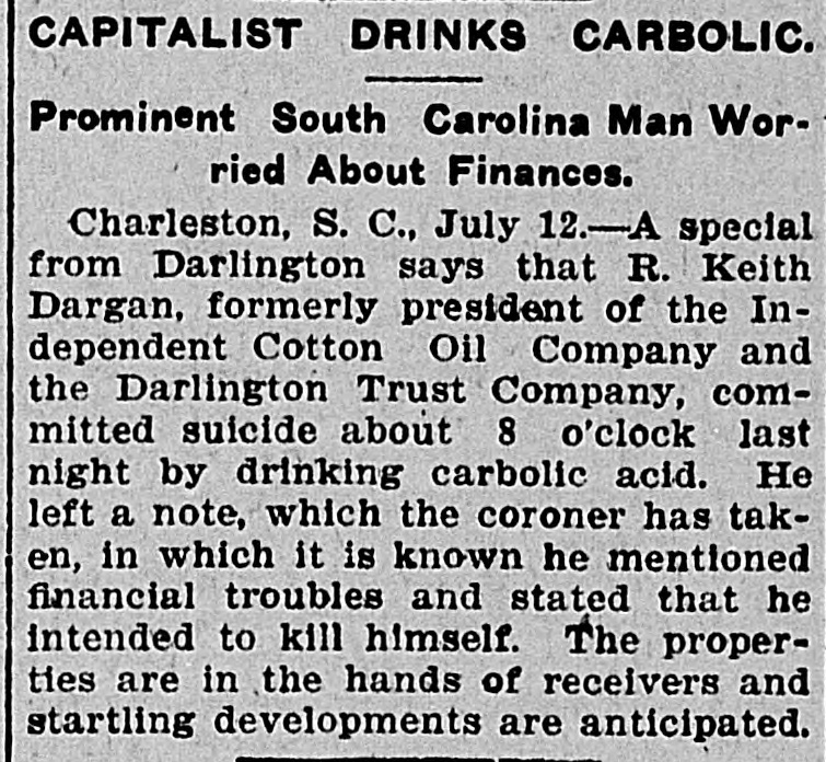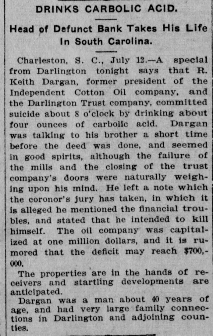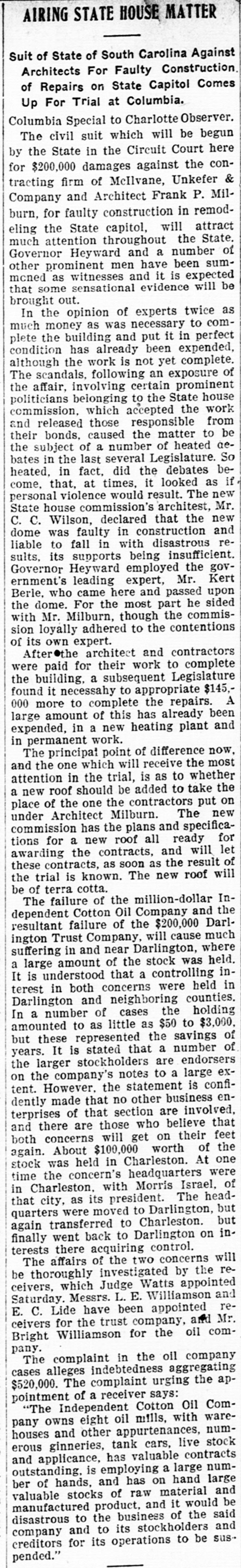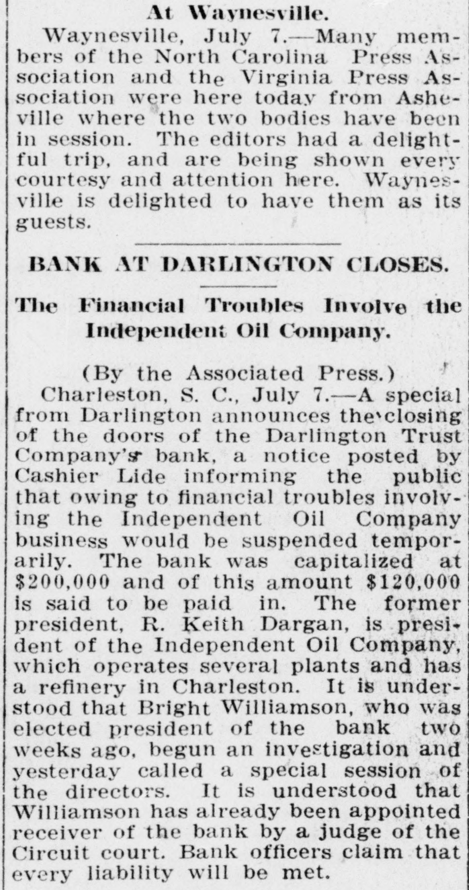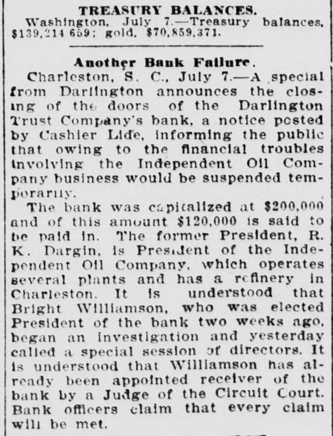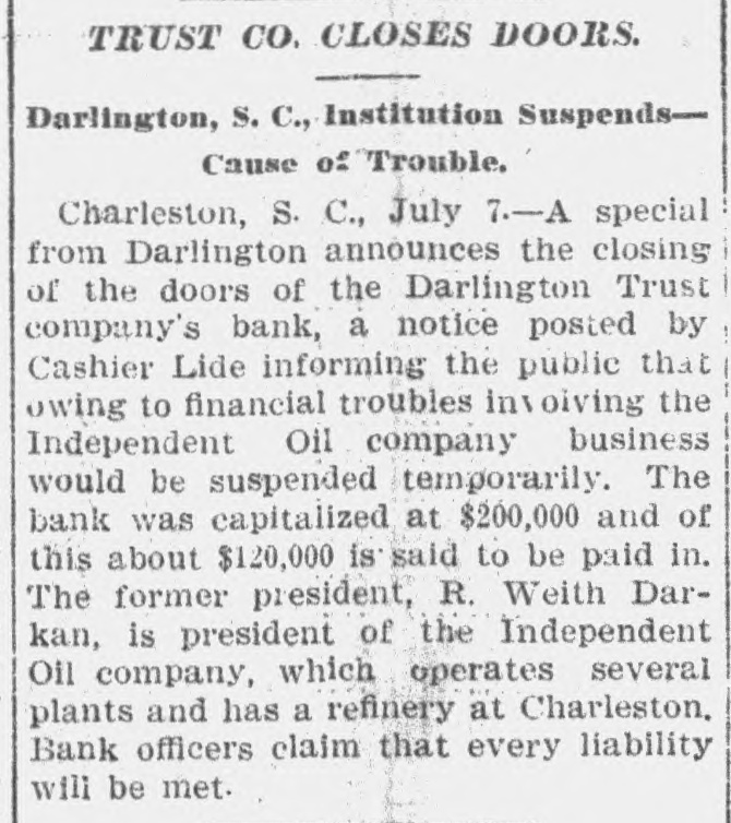 C. Lide and L. E. Wishamson, 1: , reivers of the Darlington Trust ompany, is as follows: To the Honorable Court: We, the adersigned receivers respectfully subthe following as our report to the Having duly qualified as receivers of Darlington Trust Company, above we took charge of the books and of said company and we find on said books the following condition affairs: Cash on hand, $1,833.34; furniture fixtures, $1,612.86; discounts, $166 real estate, $59,245.26; Atlantic al Bank, $1,036.30; National of Commerce, $18,007.80; Murch:National Bark, $1,929.34; South arolina Loan and Trust Company, 12.3.05, Bank of Darlington, $5,805 62: $258,161.68. Liabilities: Capital paid in, $109,500; deposits, $31,6.91; rediscounts, $94,077.94; AmeriNational Bank, Richmond, $1,569.Merchants National Bank of R:ch$8,028; netto Bank and Trust ompany, $423.44; City National Bank reenville, $1,413.81; Third National Atlanta, $8,051.29; American ational Bank, Spartanburg, $31.00 and loss $788.92. Total $258,161. Upon the foregoing statement we it will no: be inappropriate for to make the following remarks: Cash and cash items to the amount of have been duly turned over us Discounts. We find all the notes listupon the books of the Darling n Company as spears in the forestatement, except such as have ...scounted and appear under that in the forego rg statement. We among the said notes and disunsecured notes of the IndepenCotton Oil Company to the amo int $80,000, of which said amount $10,of said notes had been rediscountWe also find rotes secured by stock the Independent Cotton Oil Company of the Darlington Trust Company moenting in the aggregate to $17,180. which we corsider doubtful also doubtful notes amounting to $2,600. Real Estate. We have taken charge real estate owned by the Darling Trust Company and will proceed to bllect rents upon the same as they due. ecome Accounts with banks. We have necked over all the statements of ac with banks SO far as we have able up to this date to obtain statements and we find them ap coximately correct, there being sotas djustments to De made which makes alteration 12' these accounts. With following exceptions: While the of the Darlington Trust Compa show a balance of $18,007.80, due to by the National Bank of Commerce New York, that bank claims that the mount had been reduced to approxi $3,000, they having charg against the Darlington Trust ompany notes OI the Indepen Cotton Oil Company to the amount $15,000, for which charge they claim hold orders from the late presiden the Darlington Trust Company Jeither these notes nor the charge an in any way upon the boks of the Darlington Trust Company, but since receivership the aforesaid note ggregating $15,000, have been turne: to us and are now held by us a ddition to the amounts above. W informed that the amount of on redit in the Atlantic National Banl been attached by the Third Nation Bank of Atlania, Ga., and that th mount to our credit in the Murchisor National Bank of Wilmington, agains he liability of the Darlington Trus tompany, on certain notes rediscounte it and not paid at maturity. We have not as yet been able to ob a statement of account from 1b ferchants' National Bank of Rich