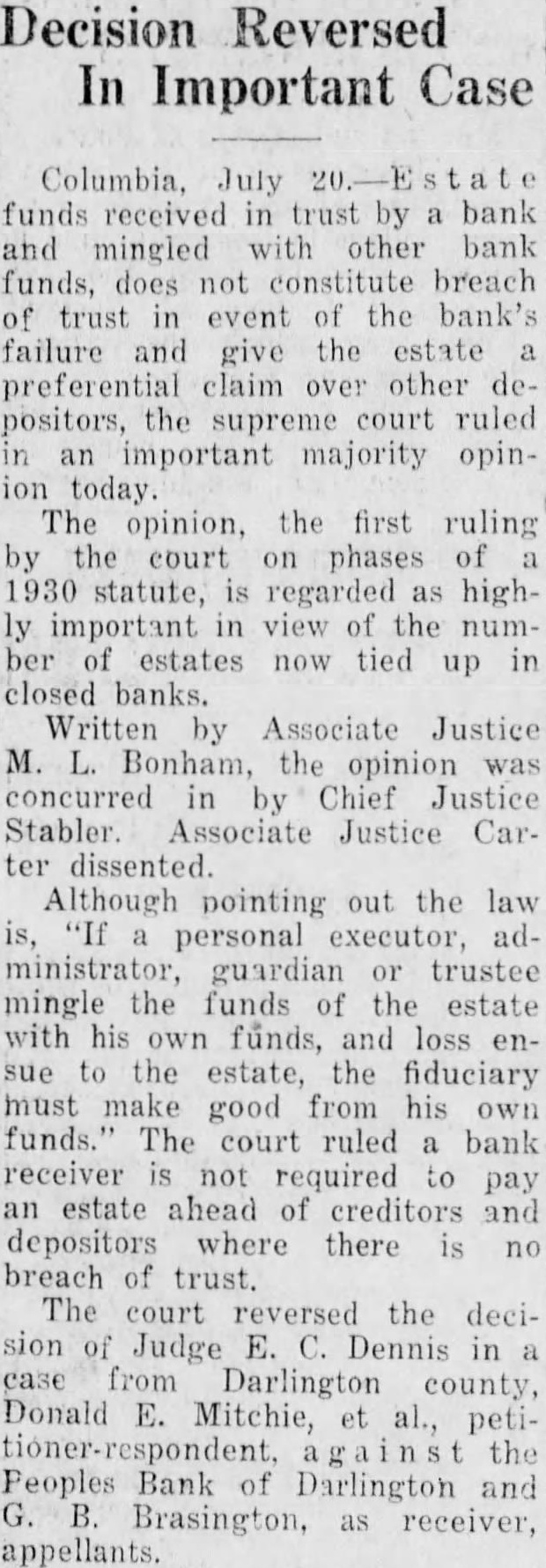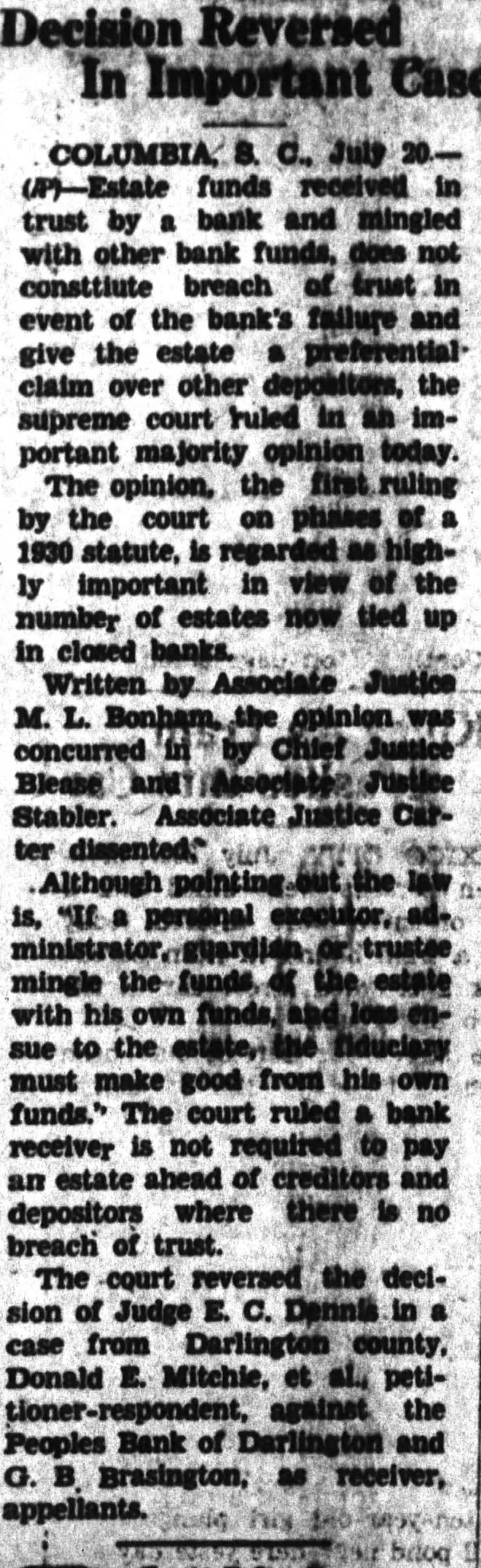 Decision Reversed In Important Case (/P)-Estate funds received in trust by bank and mingled with other bank funds. does not constttute breach of trust in event of the bank's failure and give the estate a preferential claim over other the court ruled in imsupreme portant majority opinion today. The opinion, the ruling by the court on phases of 1930 statute, is regarded as highly important in view of the number of estates now tied up in closed banks. Written by Associate Justice M. L. Bonham, was concurred Blease Stabler. Associate Justice carter Although law a personal ministrator, mingle the with his own sue to the estate, must make good from his own funds." The court ruled a bank receiver is not required to pay an estate ahead of creditors and depositors where there is no breach of trust. The court reversed the decision of Judge E. C. Dennis in a case from Darlington county. Donald E. Mitchie, et al., peti-respondent, against the Peoples Bank of Darlington and G. B. Brasington, as receiver, appellants.