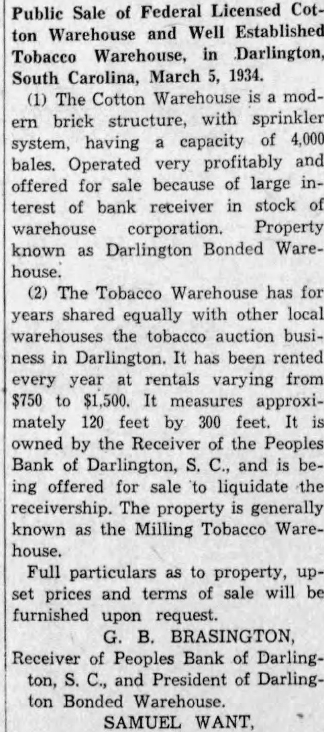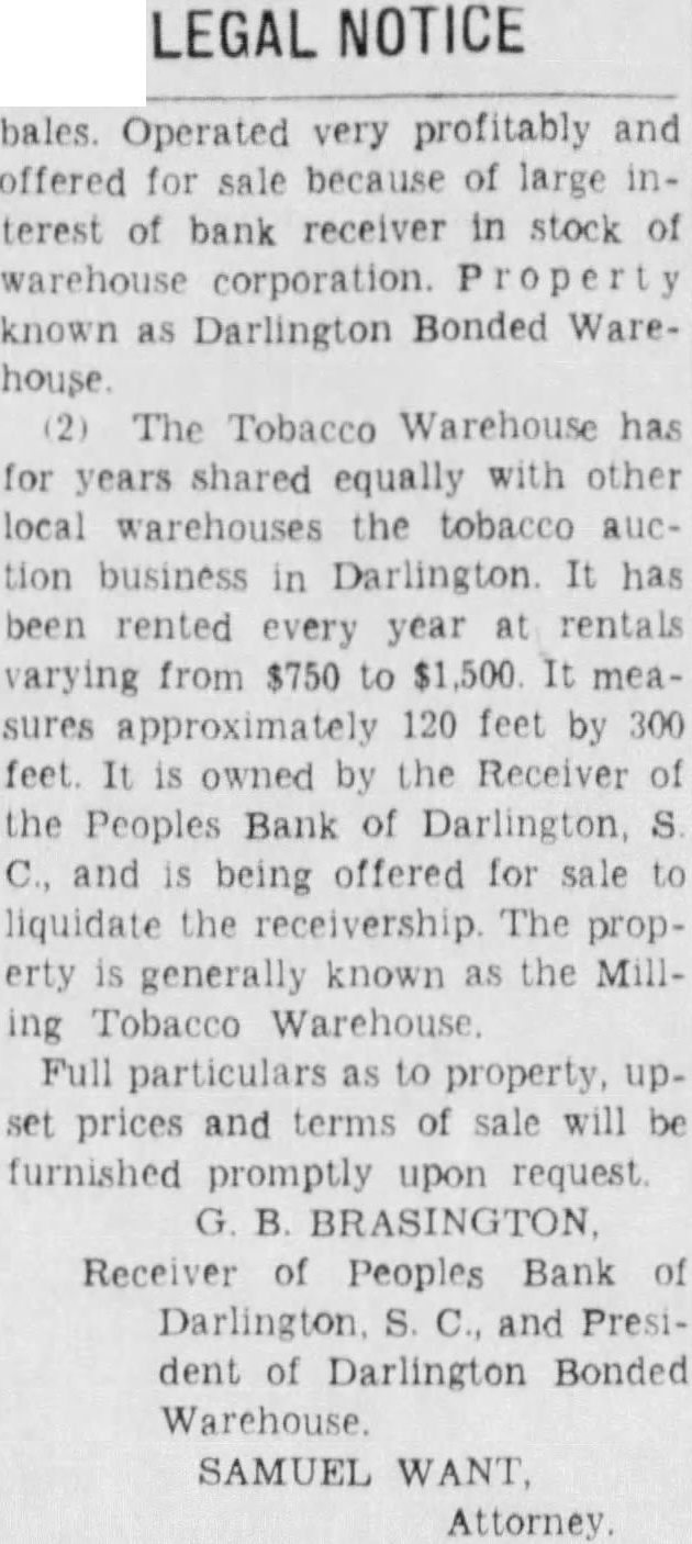LEGAL NOTICE bales. Operated very profitably and offered sale because of large interest of bank receiver in stock of known as Darlington Bonded Warehouse The Tobacco Warehouse has for years shared equally with other local warehouses the tobacco auc tion business in Darlington It has been rented every year rentals varying from $750 $1,500 mea 120 feet by 300 feet. It owned by the Receiver of the Peoples Bank of Darlington, S C., and being offered for sale liquidate the receivership The prop. erty generally known the Milling Tobacco Full property up. set prices terms of sale will be furnished promptly upon request B. BRASINGTON Receiver of Peoples Bank Darlington S. and Presiof Darlington Bonded Warehouse SAMUEL WANT Attorney