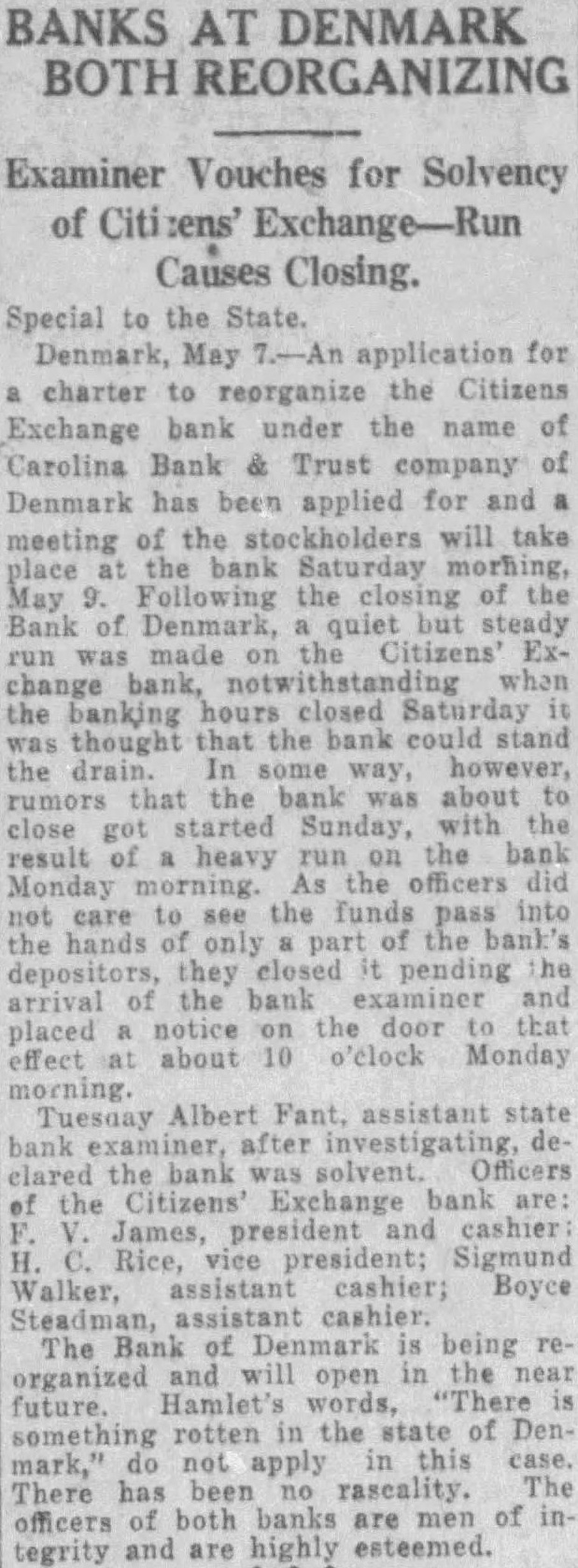 BANKS AT DENMARK BOTH REORGANIZING Examiner Vouches for Solvency of Citizens' Exchange-Run Causes Closing. Special to the State. Denmark, May 7.-An application for charter to reorganize the Citizens Exchange bank under the name of Carolina Bank & Trust company of Denmark has been applied for and meeting of the stockholders will take place the bank Saturday morhing, May Following the closing of the Bank of Denmark, quiet but steady made the change the banking hours closed was thought that the bank the drain. some way, however, rumors that the bank was about got started Sunday, with the result of heavy run the bank Monday As care see the funds into the hands only the bank's depositors, they pending arrival the bank examiner and placed notice the door that effect about o'clock Monday Tuesday Albert Fant, assistant state after investigating, de clared the bank Officers the Citizens' Exchange bank are James, president cashier Rice, vice Sigmund Walker, assistant cashier; The Bank of Denmark being reorganized and will open in the future. Hamlet's words, "There something rotten in the state of Den mark," do not apply this has been The There officers of both banks are men of integrity and are highly esteemed.