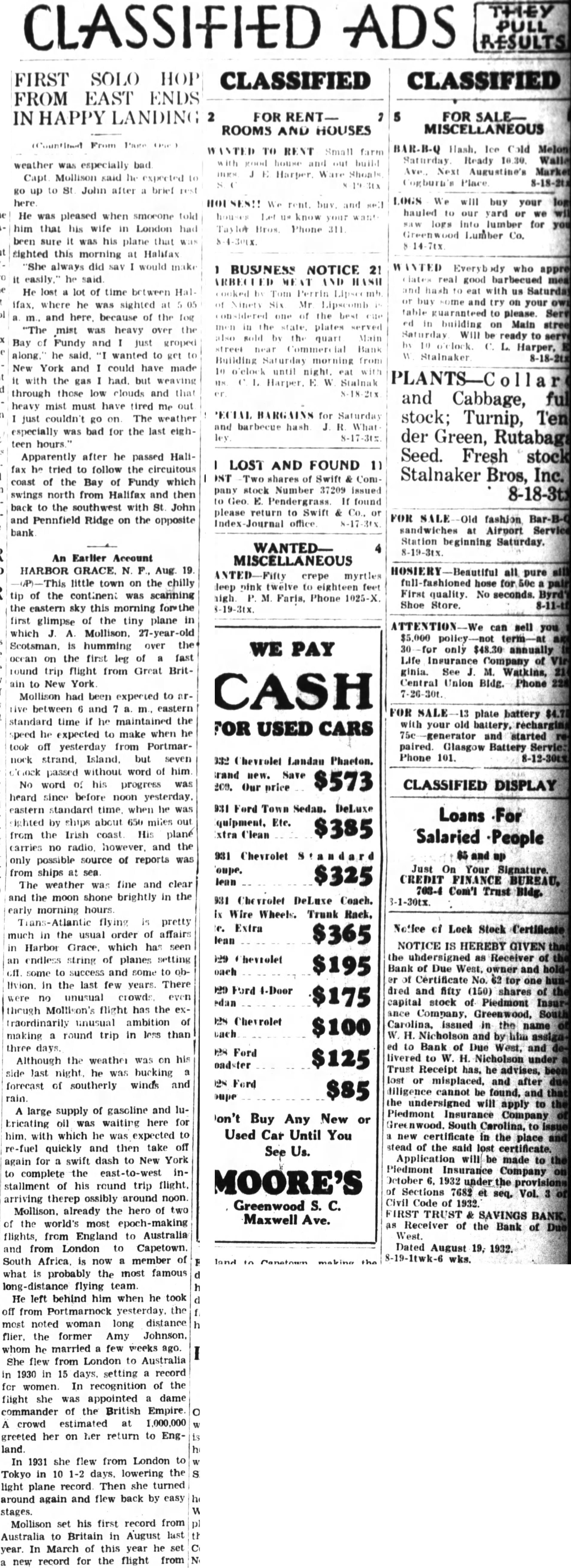 FIRST FROM EAST ENDS weather was bad Capt Mollison said up to John after brief He was pleased when smoeone him that his wife in London had been sure his plane that sighted this morning at Halifax always did would He lost lot of time ifax, where he was sighted and because of the fog mist was heavy over Bay of Fundy and just groped along. he wanted to get New York and could have made with the gas had. but through those low clouds and that heavy mist must have tired me out just couldn't go on The weather especially was bad for the last eighteen Apparently after he passed Halifax he tried to follow the circuitous coast of the Bay of Fundy which swings north from Halifax and then back to the southwest with John and Pennfield Ridge on the opposite bank An Earlier Account HARBOR Aug. 19 little town on the chilly tip of the continent was scanning the eastern sky this morning first glimpse of the tiny plane in which humming over on the first leg of fast round trip flight from Great Britain to New York Mollison had been expected to between and eastern standard time if he maintained the speed expected to make when he took off yesterday from Portmarnock strand, but seven passed without word of him No word his progress was heard since before noon yesterday. eastern standard time when he was sighted by ships about 650 miles from the Irish coast plane carries no radio, however, and the only possible source of reports was from ships sea weather was fine and clear and the moon shone brightly in the morning flying pretty much in the usual order of affairs Harbor which has seen an endless string of planes setting some to success and some to oblivion. the last few years. There were no unusual crowds even though Mollison's flight has the raordinarily unusual ambition of making round trip in less than three days. Although the weather was on his side last night, he was bucking forecast of southerly winds and rain large supply of gasoline and lubricating oil was waiting here for him. with which he was expected re-fuel quickly and then take off again for swift dash to New York to complete the east-to-west installment of his round trip flight. arriving therep ossibly around noon. Mollison, already the hero of two of the world's most epoch-making flights, from England to Australia and from London to Capetown. South Africa. is now member of what probably the most famous long-distance flying team. He left behind him when he took off from Portmarnock yesterday. the most noted woman long distance former Amy whom he married few weeks ago. She flew from London to Australia in 1930 15 days. setting a record for women. In recognition of the flight she was appointed dame commander of the British Empire crowd estimated at 1,000,000 greeted her on her return to England. In 1931 she flew from London Tokyo in 1-2 days, lowering the light plane record Then she turned around again and flew back by easy stages. Mollison set his first record from Australia Britain in August last the In March of this year he set year. new record for the flight from NOTICE IS HEREBY the Receiver Bank Due West, owner and Certificate No. for one and fifty (150) shares capital stock of Piedmont ance Company, Greenwood, Carolina, issued the Nicholson and by to Bank of Due West, and livered H. Nicholson under Trust Receipt has, he advises, lost or misplaced, and after diligence cannot found, and undersigned apply Piedmont Insurance Company South Carolina, to certificate in the place stead of the said lost certificate. Application will made to Piedmont Insurance Company October under the Sections 7682 Vol. seq. Civil Code of 1932 TRUST SAVINGS Receiver of the Bank West. Dated August 19, 1932. wks.
