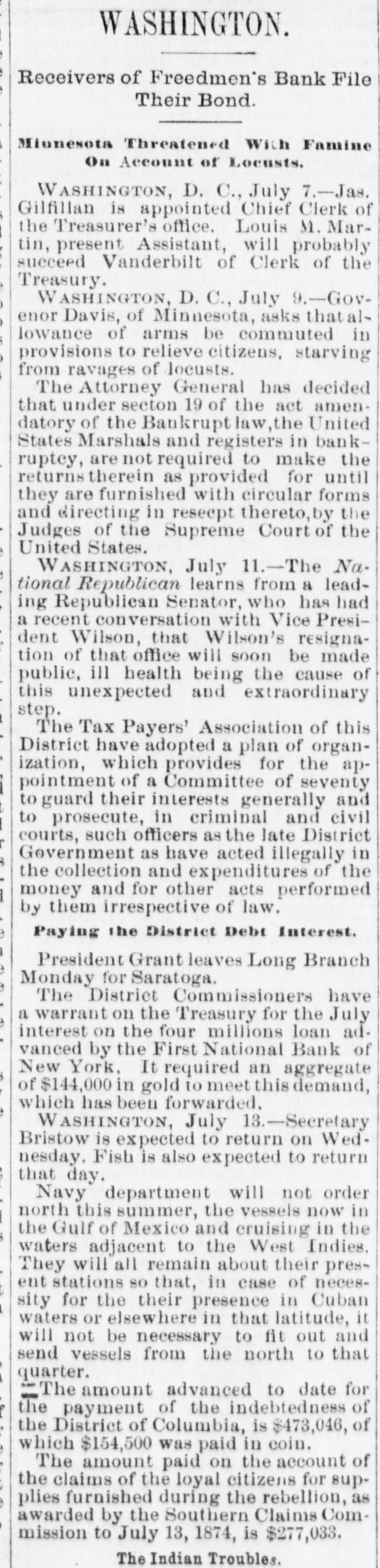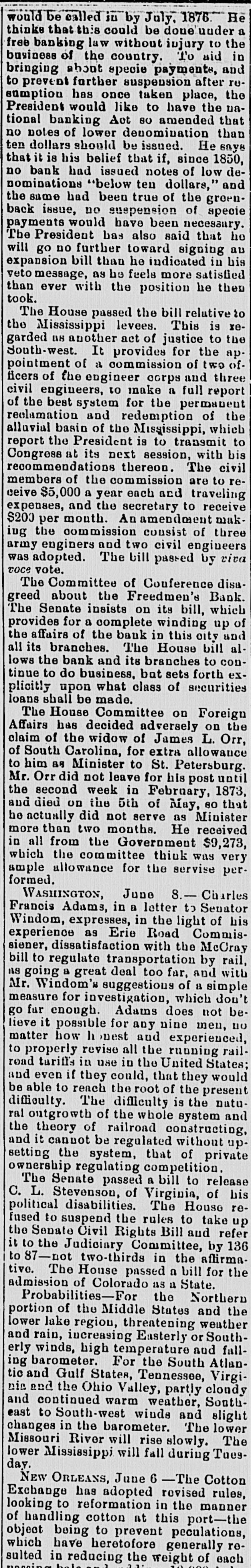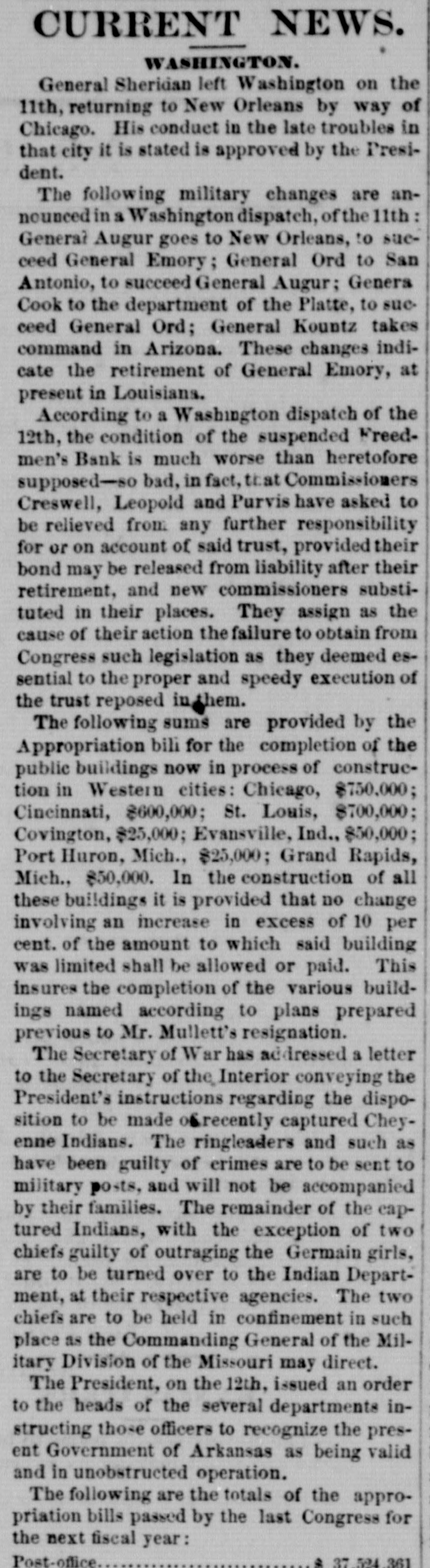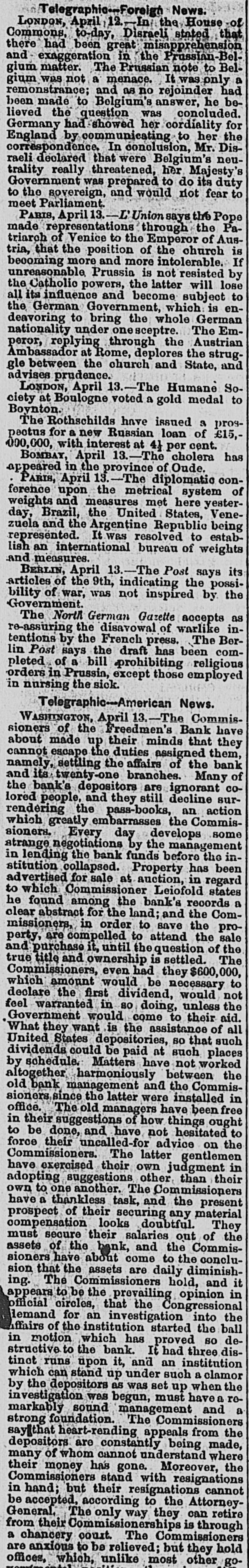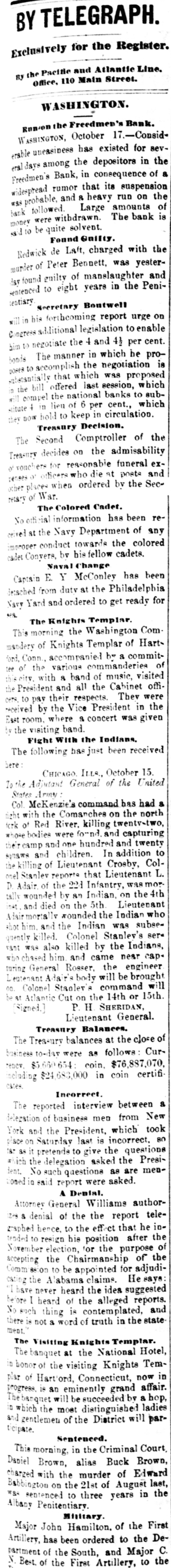 BY TELEGRAPH. Exclusively for the Register. By Pacitic and Atlantic Line. the Office. 110 Main Street. WASHINGTON. the Freedmen's Bank. Ranson October 17.-ConsidWASHINGTON, uneasiness has existed for sev- the erable among the depositors in eraldays Bank, in consequence of that its and 8 heavy run Large mas probable. Freedmen's widespread rumor amounts suspension on the of bank followed were withdrawn. The bank is money all 10 be quite solvent. Found entity. de Laft, charged with the Redwick of Peter Bennett, was yester- and munier guilty of manslaughter Penientenced found to eight years in the centiary secretary Boutwell his forthcoming report urge enable on willin additional legislation to the 4 and per to in him congress negotiate The manner which 41 he cent. pro- is accomplish the negotiation that which was offered last bonds session, proposed which subthe bill the national banks to which lieu of 6 per stitute t hold to keep in they will compel DOW in circulation. cent., Treasury Decision. Second Comptroller of the The decides on the admisability exTreasury for reasonable funeral and rouchers ticers who die at posts the Secpences other place when ordered by retary of War The Colored Cadet. ial information has been reNo orti Navy Department colored of any conduct towards the cadet improper Conyets by his fellow cadets. Naval change Captain E. Y McConley has been from duty at the Philadelphia for us Vary letched Yard and ordered to get ready The Knights Templar morning the Washington Hart- Com This of Knights Templar of mandery accompanied be a commit- of and Conn., the various commanderies visited see of with 8 band of music, scity. and all the the their respects. in President pay Cabinet Thev were offi- the cets to by the Vice President given East room. received where a concert was the visiting band. Fight with the Indians. The following has just been received here CHICAGO Itls. October 15. States Army To the Adjutant General of the United McKenzie's command has had north Col. with the Comanches on twentv-two, the fork of and right Red River. killing capturing and one hundred their camp home bodies and were children. found In addition and twenty Col- to squaws of Lieutenant Crosby, L. be killing Stanlev reports that Lieutenant wasmor onel of the 22d Infantry, the 4th D. tally Adair wounded by an Indian. 5th Lieutenant on net. and died on rounded the the Indian subse= Adair mortally and the Indian was ser* hot him. killed. Colonel Stanley's Indians, quently also killed by the caprant chased was him and came near engineer General Rosser. the be brought turing L'eatenant Ada r's body will command will Colonel Stanley . or 15th. Signed.] beat Atlantic Cut P on H the SHERIDAN, 14th Lieutenant General. Treasury Balances. Treasury balances at the close CurThe as follows: $5,660,654 coin. $76,887,070. certification cates ency. including $24,683,000 in coin Incorrect. a The reported interview between of business men delegation President, which from New took 80 York and the incorrect. place on Saturday last is questions pretends to give the Presiwhich as it the delegation asked the are menNo such questions asked. as dent. oned in said report were A Dental. Attorney General Williams author- teledenial of the the report he in229 & hence. to the effect that after the graphed resign his position of tended November to election, for the purpose of the the Chairmanship adjudiaccepting Commission to be appointed for e says cating the A 'abama claims. suggested never heard the idea reports. before I "I have heard of the contemplated, alleged and there No such is not thing a word is of truth in the state ment. The Visiting Knights Templar. Hotel, The banquet at the National Tembonor of the visiting Knights now in plan of Hart'ord, Connecticut, grand affair. progress. 18 an eminently bv a hop, will be succeeded ladies The banquet which the most dieringuished will parand gentlemen of the District ticipate. Sentenced. This morning, in the Criminal Brown, Court Daniel Brown, alias Buck Edward charged with the murder August of last, Babbington on the 21st of in the was sentenced to three years Albany Penitentiary. Military. Major John Hamilton. of the the First DeC. Artillery, has been ordered to Major partment of the South, and to the Rest the First Artillery,