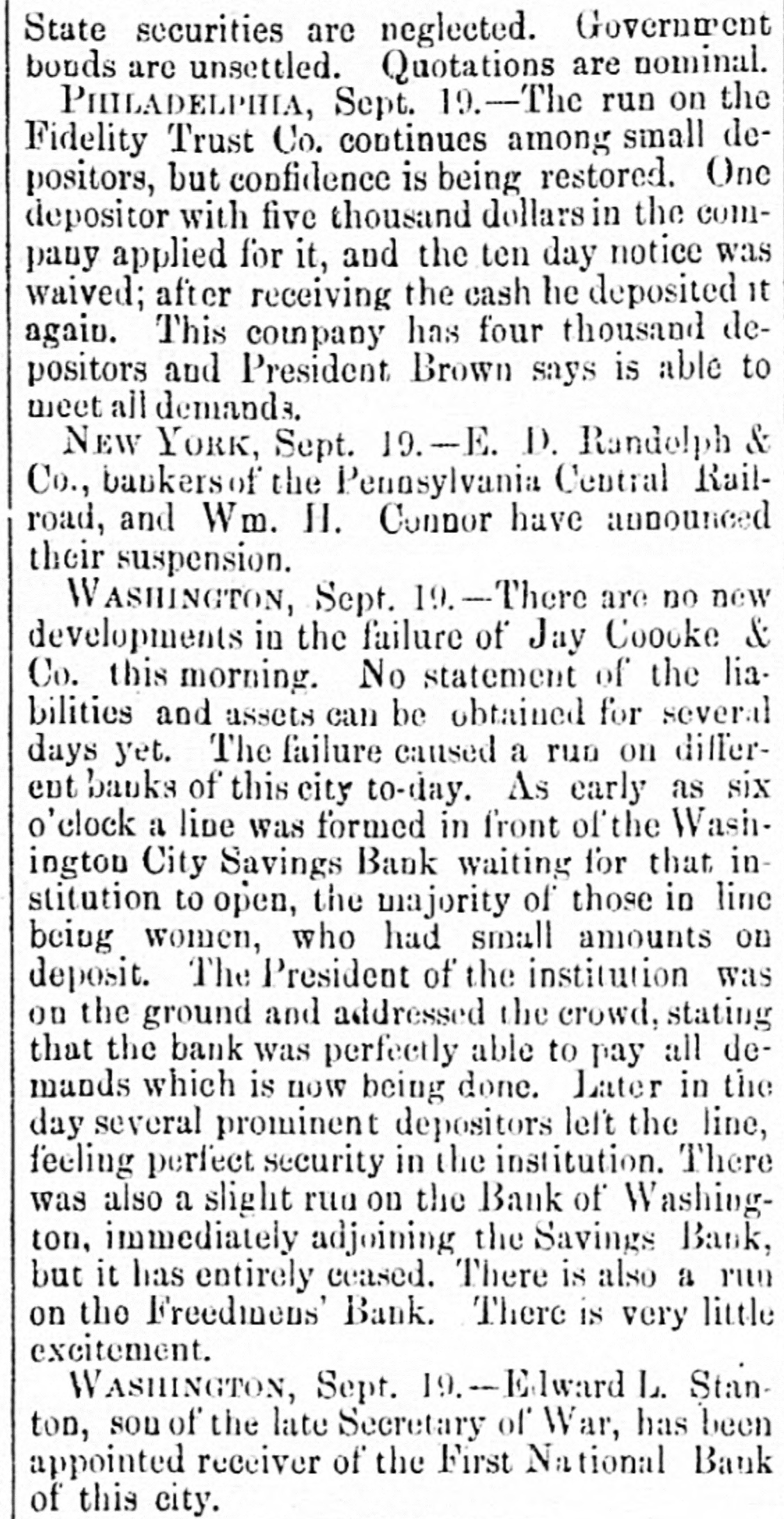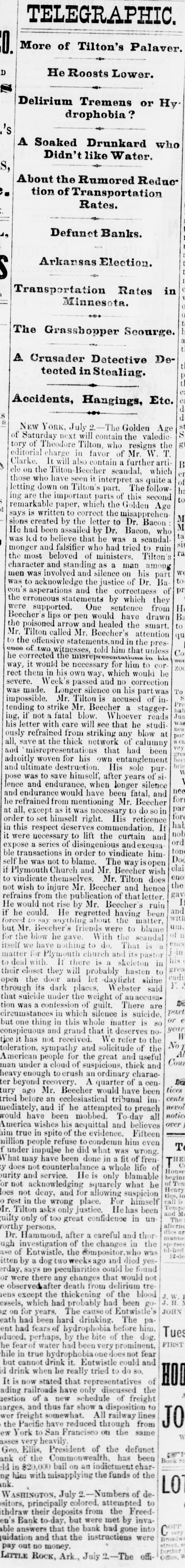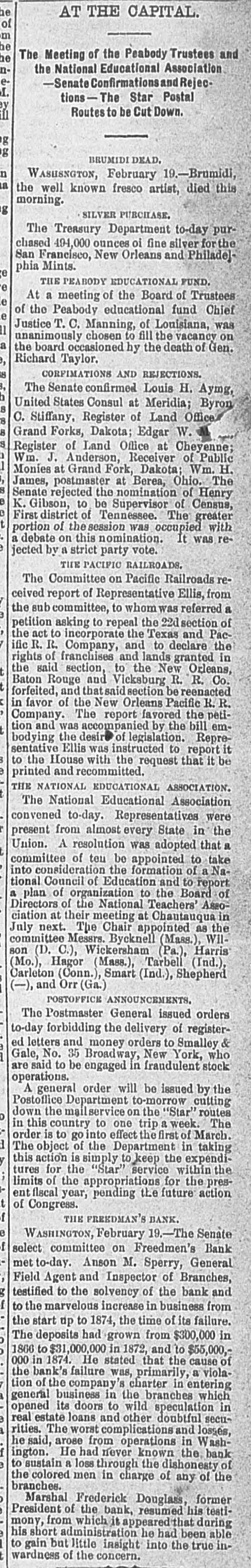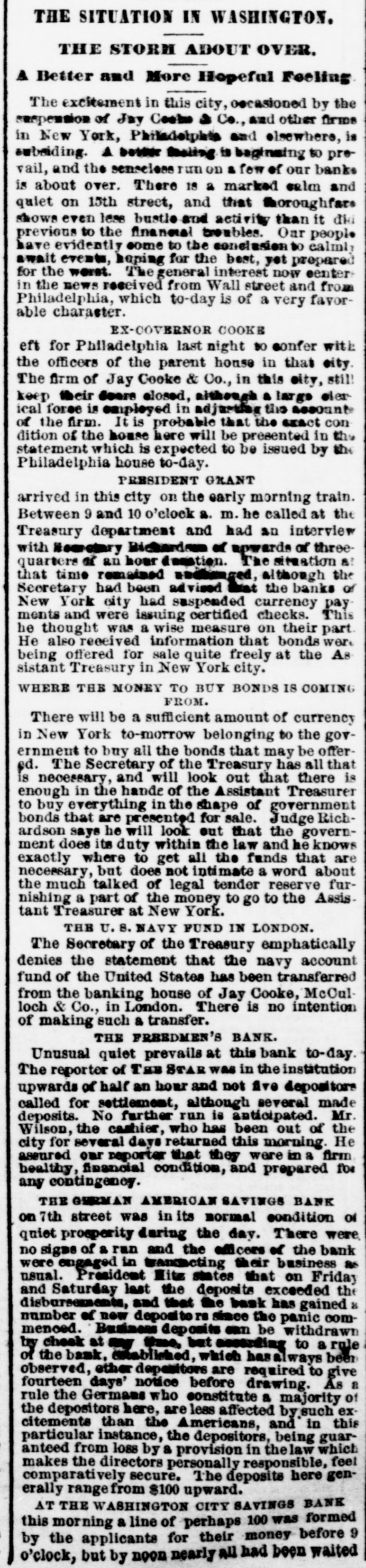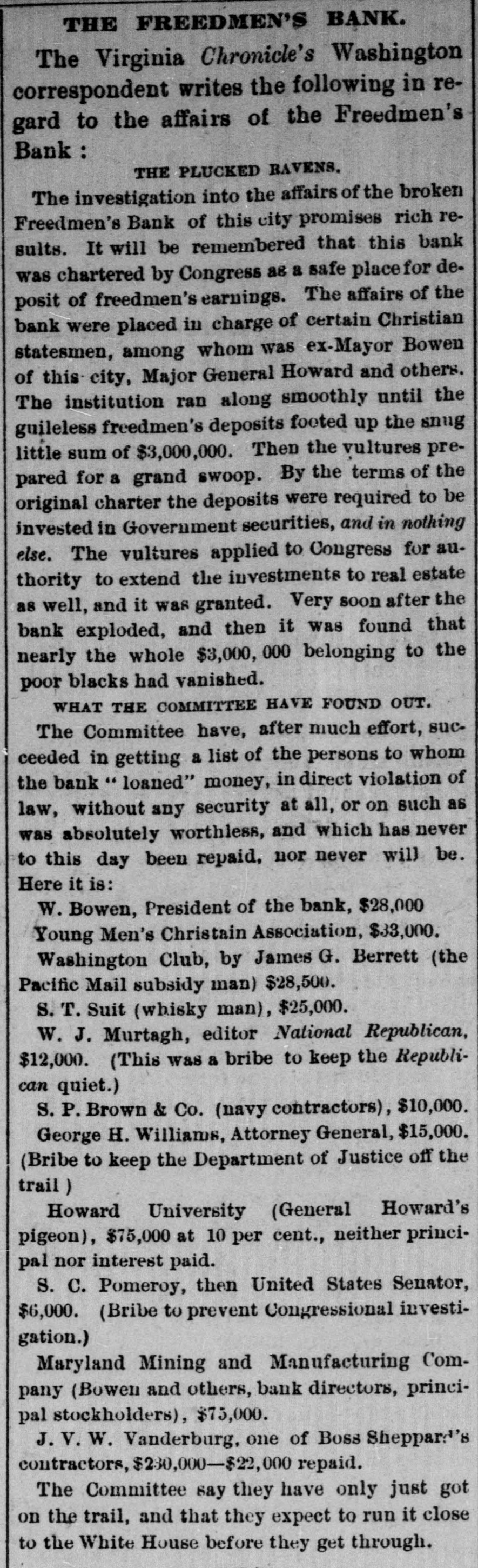 BY TELEGRAPH. Exclusively for the Register. By Pacitic and Atlantic Line. the Office. 110 Main Street. WASHINGTON. the Freedmen's Bank. Ranson October 17.-ConsidWASHINGTON, uneasiness has existed for sev- the erable among the depositors in eraldays Bank, in consequence of that its and 8 heavy run Large mas probable. Freedmen's widespread rumor amounts suspension on the of bank followed were withdrawn. The bank is money all 10 be quite solvent. Found entity. de Laft, charged with the Redwick of Peter Bennett, was yester- and munier guilty of manslaughter Penientenced found to eight years in the centiary secretary Boutwell his forthcoming report urge enable on willin additional legislation to the 4 and per to in him congress negotiate The manner which 41 he cent. pro- is accomplish the negotiation that which was offered last bonds session, proposed which subthe bill the national banks to which lieu of 6 per stitute t hold to keep in they will compel DOW in circulation. cent., Treasury Decision. Second Comptroller of the The decides on the admisability exTreasury for reasonable funeral and rouchers ticers who die at posts the Secpences other place when ordered by retary of War The Colored Cadet. ial information has been reNo orti Navy Department colored of any conduct towards the cadet improper Conyets by his fellow cadets. Naval change Captain E. Y McConley has been from duty at the Philadelphia for us Vary letched Yard and ordered to get ready The Knights Templar morning the Washington Hart- Com This of Knights Templar of mandery accompanied be a commit- of and Conn., the various commanderies visited see of with 8 band of music, scity. and all the the their respects. in President pay Cabinet Thev were offi- the cets to by the Vice President given East room. received where a concert was the visiting band. Fight with the Indians. The following has just been received here CHICAGO Itls. October 15. States Army To the Adjutant General of the United McKenzie's command has had north Col. with the Comanches on twentv-two, the fork of and right Red River. killing capturing and one hundred their camp home bodies and were children. found In addition and twenty Col- to squaws of Lieutenant Crosby, L. be killing Stanlev reports that Lieutenant wasmor onel of the 22d Infantry, the 4th D. tally Adair wounded by an Indian. 5th Lieutenant on net. and died on rounded the the Indian subse= Adair mortally and the Indian was ser* hot him. killed. Colonel Stanley's Indians, quently also killed by the caprant chased was him and came near engineer General Rosser. the be brought turing L'eatenant Ada r's body will command will Colonel Stanley . or 15th. Signed.] beat Atlantic Cut P on H the SHERIDAN, 14th Lieutenant General. Treasury Balances. Treasury balances at the close CurThe as follows: $5,660,654 coin. $76,887,070. certification cates ency. including $24,683,000 in coin Incorrect. a The reported interview between of business men delegation President, which from New took 80 York and the incorrect. place on Saturday last is questions pretends to give the Presiwhich as it the delegation asked the are menNo such questions asked. as dent. oned in said report were A Dental. Attorney General Williams author- teledenial of the the report he in229 & hence. to the effect that after the graphed resign his position of tended November to election, for the purpose of the the Chairmanship adjudiaccepting Commission to be appointed for e says cating the A 'abama claims. suggested never heard the idea reports. before I "I have heard of the contemplated, alleged and there No such is not thing a word is of truth in the state ment. The Visiting Knights Templar. Hotel, The banquet at the National Tembonor of the visiting Knights now in plan of Hart'ord, Connecticut, grand affair. progress. 18 an eminently bv a hop, will be succeeded ladies The banquet which the most dieringuished will parand gentlemen of the District ticipate. Sentenced. This morning, in the Criminal Brown, Court Daniel Brown, alias Buck Edward charged with the murder August of last, Babbington on the 21st of in the was sentenced to three years Albany Penitentiary. Military. Major John Hamilton. of the the First DeC. Artillery, has been ordered to Major partment of the South, and to the Rest the First Artillery,