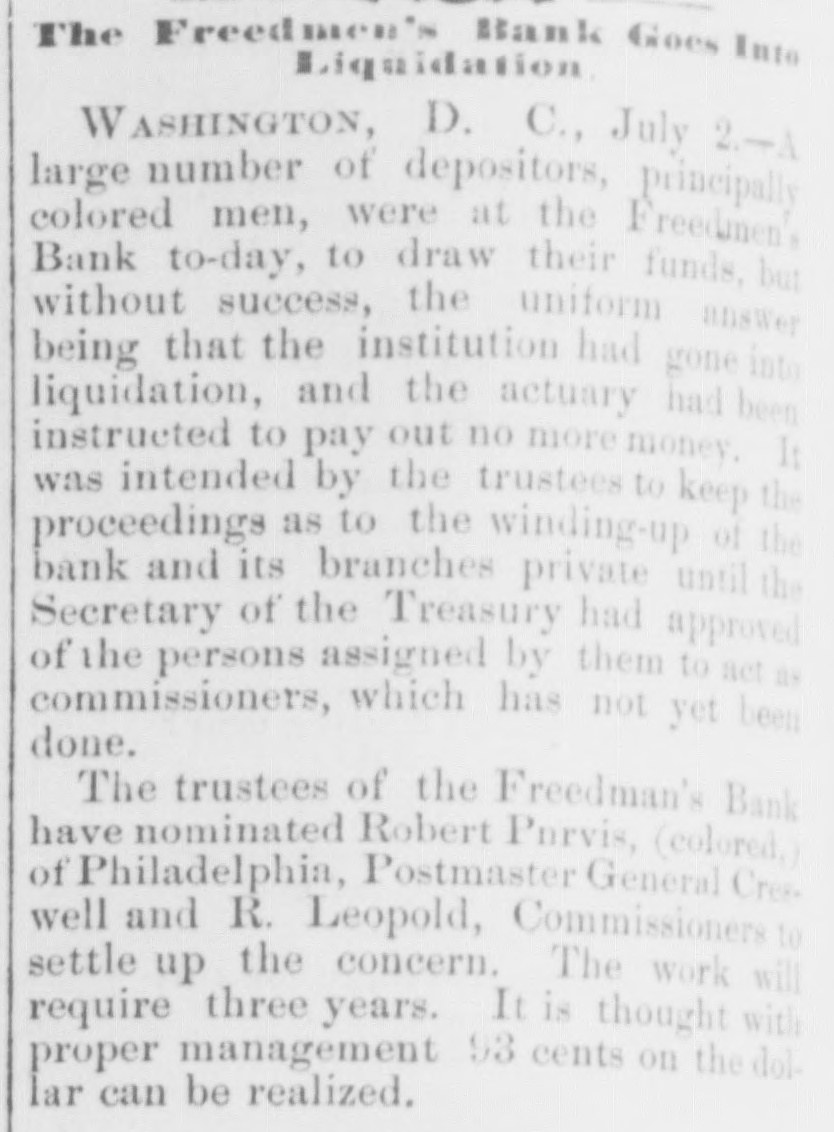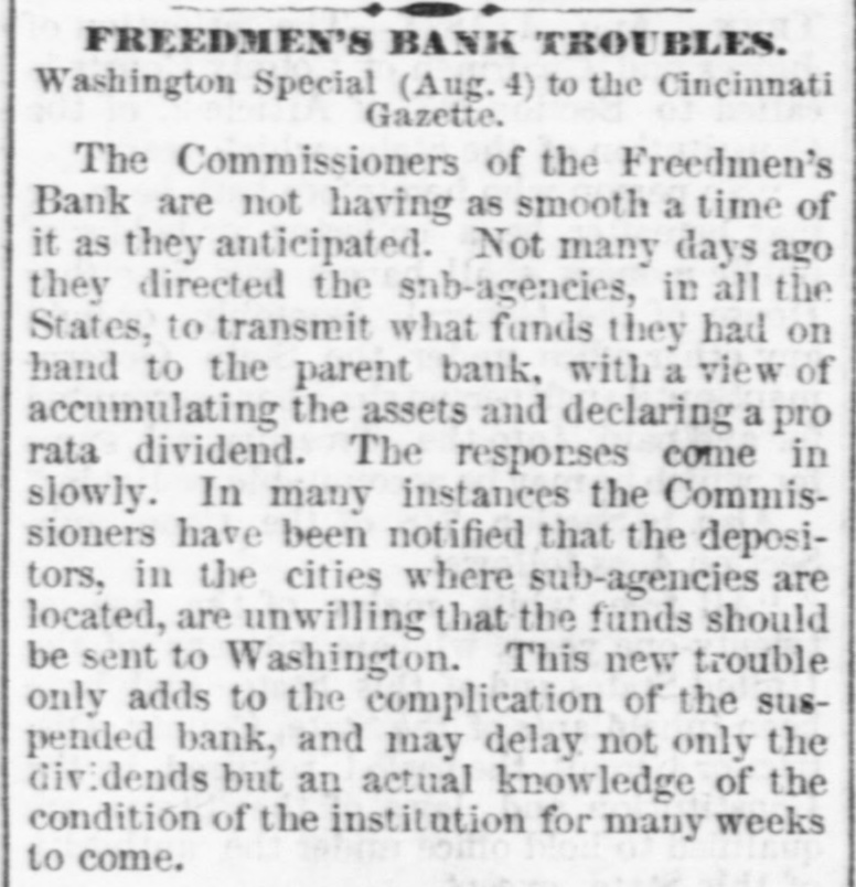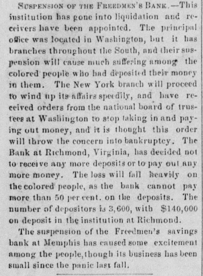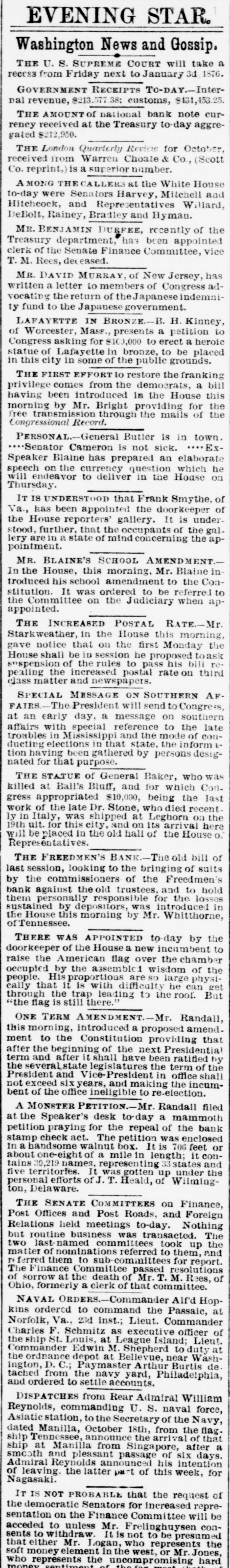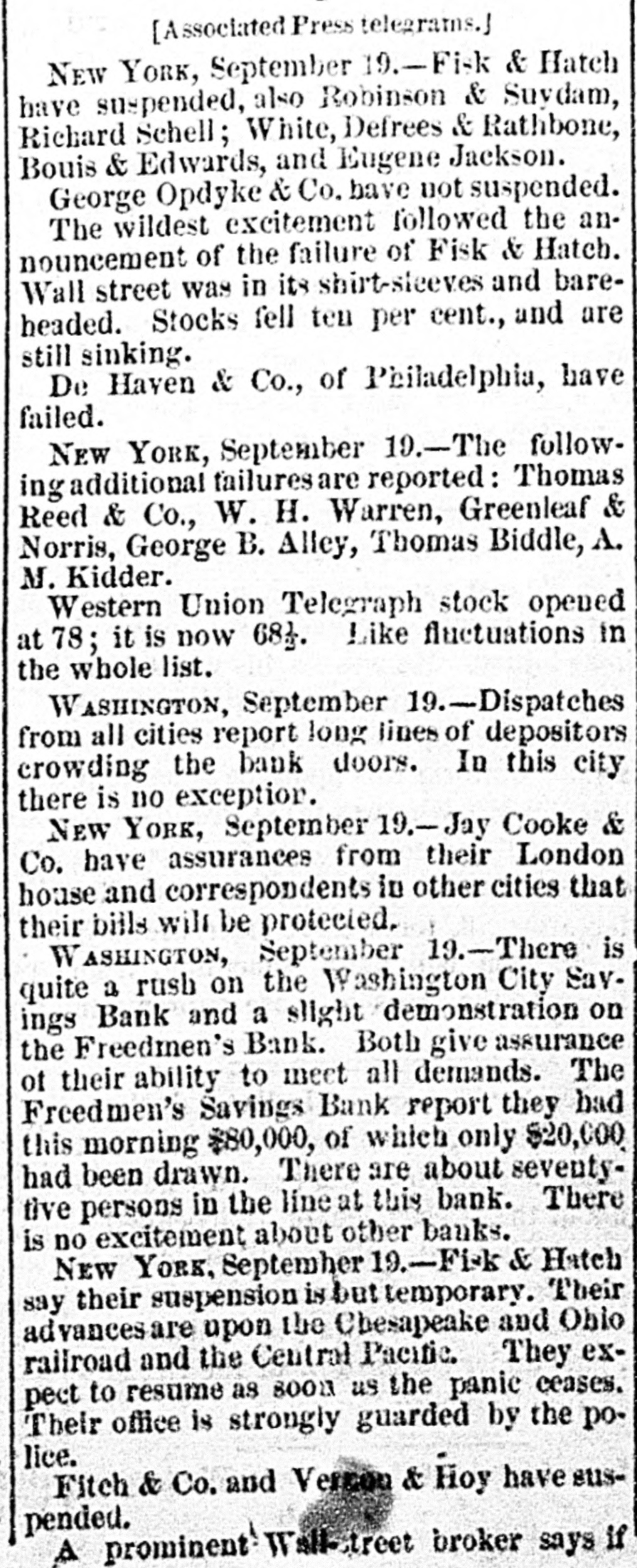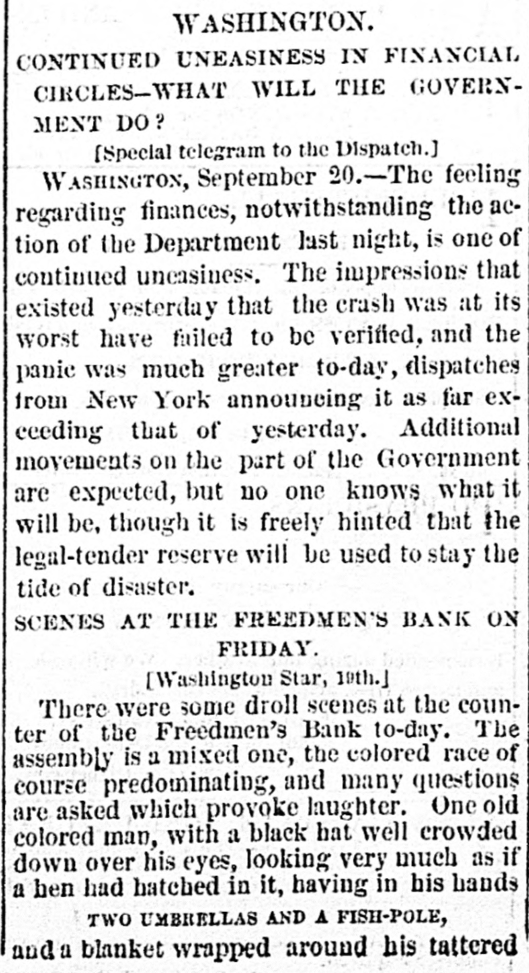 BY TELEGRAPH. Exclusively for the Register. By Pacitic and Atlantic Line. the Office. 110 Main Street. WASHINGTON. the Freedmen's Bank. Ranson October 17.-ConsidWASHINGTON, uneasiness has existed for sev- the erable among the depositors in eraldays Bank, in consequence of that its and 8 heavy run Large mas probable. Freedmen's widespread rumor amounts suspension on the of bank followed were withdrawn. The bank is money all 10 be quite solvent. Found entity. de Laft, charged with the Redwick of Peter Bennett, was yester- and munier guilty of manslaughter Penientenced found to eight years in the centiary secretary Boutwell his forthcoming report urge enable on willin additional legislation to the 4 and per to in him congress negotiate The manner which 41 he cent. pro- is accomplish the negotiation that which was offered last bonds session, proposed which subthe bill the national banks to which lieu of 6 per stitute t hold to keep in they will compel DOW in circulation. cent., Treasury Decision. Second Comptroller of the The decides on the admisability exTreasury for reasonable funeral and rouchers ticers who die at posts the Secpences other place when ordered by retary of War The Colored Cadet. ial information has been reNo orti Navy Department colored of any conduct towards the cadet improper Conyets by his fellow cadets. Naval change Captain E. Y McConley has been from duty at the Philadelphia for us Vary letched Yard and ordered to get ready The Knights Templar morning the Washington Hart- Com This of Knights Templar of mandery accompanied be a commit- of and Conn., the various commanderies visited see of with 8 band of music, scity. and all the the their respects. in President pay Cabinet Thev were offi- the cets to by the Vice President given East room. received where a concert was the visiting band. Fight with the Indians. The following has just been received here CHICAGO Itls. October 15. States Army To the Adjutant General of the United McKenzie's command has had north Col. with the Comanches on twentv-two, the fork of and right Red River. killing capturing and one hundred their camp home bodies and were children. found In addition and twenty Col- to squaws of Lieutenant Crosby, L. be killing Stanlev reports that Lieutenant wasmor onel of the 22d Infantry, the 4th D. tally Adair wounded by an Indian. 5th Lieutenant on net. and died on rounded the the Indian subse= Adair mortally and the Indian was ser* hot him. killed. Colonel Stanley's Indians, quently also killed by the caprant chased was him and came near engineer General Rosser. the be brought turing L'eatenant Ada r's body will command will Colonel Stanley . or 15th. Signed.] beat Atlantic Cut P on H the SHERIDAN, 14th Lieutenant General. Treasury Balances. Treasury balances at the close CurThe as follows: $5,660,654 coin. $76,887,070. certification cates ency. including $24,683,000 in coin Incorrect. a The reported interview between of business men delegation President, which from New took 80 York and the incorrect. place on Saturday last is questions pretends to give the Presiwhich as it the delegation asked the are menNo such questions asked. as dent. oned in said report were A Dental. Attorney General Williams author- teledenial of the the report he in229 & hence. to the effect that after the graphed resign his position of tended November to election, for the purpose of the the Chairmanship adjudiaccepting Commission to be appointed for e says cating the A 'abama claims. suggested never heard the idea reports. before I "I have heard of the contemplated, alleged and there No such is not thing a word is of truth in the state ment. The Visiting Knights Templar. Hotel, The banquet at the National Tembonor of the visiting Knights now in plan of Hart'ord, Connecticut, grand affair. progress. 18 an eminently bv a hop, will be succeeded ladies The banquet which the most dieringuished will parand gentlemen of the District ticipate. Sentenced. This morning, in the Criminal Brown, Court Daniel Brown, alias Buck Edward charged with the murder August of last, Babbington on the 21st of in the was sentenced to three years Albany Penitentiary. Military. Major John Hamilton. of the the First DeC. Artillery, has been ordered to Major partment of the South, and to the Rest the First Artillery,