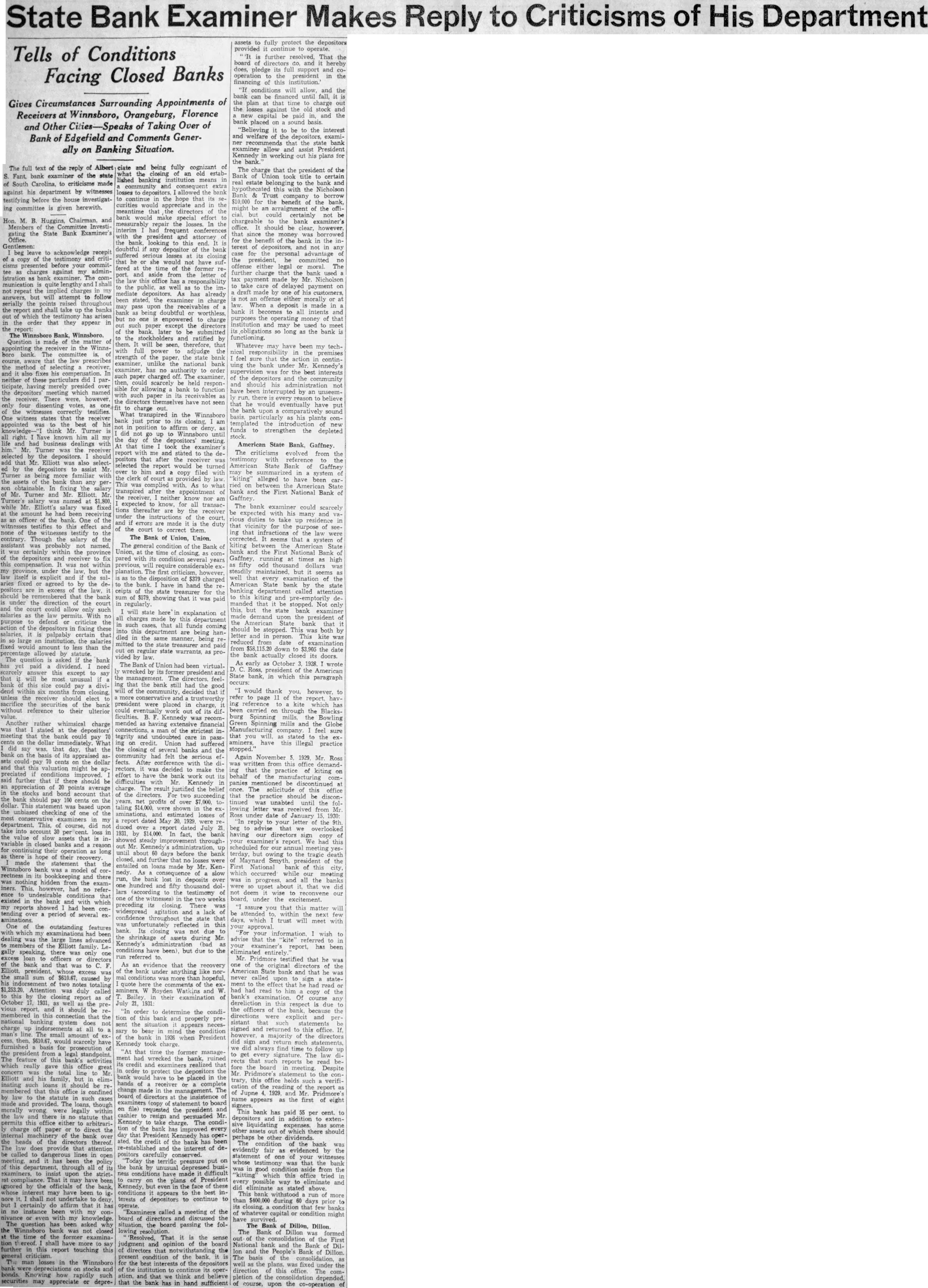 State Bank Examiner Makes Reply to Criticisms of His Department Tells of Conditions Facing Closed Banks Gives Circumstances Surrounding Appointments of Winnsboro, Florence Receivers at Orangeburg, and Other Cities-Speaks of Taking Over of Bank of Edgefield and Comments Generally on Banking Situation. The full text of the reply of Albert what S. Fant, bank of the state South Carolina, to criticisms made against his department by witnesses testifying the house investigatcurities ing committee is given herewith. M. B. Huggins, Chairman, and Investigating the State Bank Examiner's Office. Gentlemen: beg acknowledge recepit copy the testimony and before your commitcharges against my administration examiner. The communication and repeat the answers, attempt follow serially the take the banks which the has arisen the they appear Bank, Winnsboro. Question made the matter appointing receiver the Winnsbank. The committee course, prescribes the method selecting receiver, also neither participate, having merely the depositors' meeting which named receiver. There however four the testifies. witness states that receiver appointed best his think Mr Turner right. known him all my and had business dealings the receiver selected should Elliott the assist Mr. with the the any obtainable. fixing the Mr. Turner and Mr. Elliott Mr. Turner's named at while Mr. Elliott's salary fixed the amount he had receiving officer the bank. One witnesses testifies to effect and none testify contrary. the assistant not certainly within the the depositors and fix this was province, under law, but the explicit and aries fixed agreed to the positors are excess of the should be that the under the direction the court allow such salaries permits. With purpose defend criticize action the depositors fixing salaries, palpably certain large the to less than the allowed by The question asked the bank yet paid dividend. need scarcely answer this except unusual could pay diviunless receiver sacrifice the the without their ulterior value. Another rather whimsical charge that the meeting that bank could pay the dollar What did day, that the bank of its appraised could cents the dollar that this valuation might be apconditions said further should stocks and bank 100 the dollar. This based the unbiased checking the examiners department. This, course, account 30 loss assets that variable closed banks reason long there their made the that the Winnsboro was rectness and there hidden the examiners. This, however, reference that existed in the with which reports showed been tending period of several One the outstanding features dealing the gally speaking, excess officers the and that was small caused indorsement of two notes $1,253.20 Attention duly totaling called this closing report as October preand this national banking system does charge man's $610.67 scarcely furnished for prosecution president standpoint. feature this activities which really office line Mr Elliott and family inating this the though merally legally the law and statute that permits this office either to arbitraricharge off paper direct internal the over heads of directors thereof provide that attention be called and the this through the ignored by the officials the whose interest may have been not certainly affirm that instance my question has asked the the the former shall further this report touching this general losses in the Winnsboro stocks bonds. Knowing how such securities appreciate or depre- ciate and being fully cognizant the established banking consequent the hope that and in meantime the directors would special effort measurably repair the losses. In the interim had frequent the president and attorney the looking doubtful any depositor the bank suffered its closing he she would not at the the former the letter the law has the public, well to the As has already stated, the charge pass the being doubtful worthless, but no one enpowered charge except the directors the ratified that full adjudge the strength the the examiner, examiner, has such paper charged The examiner, then, could scarcely held responsible for allowing bank to function such paper receivables the directors themselves have not charge What in the Winnsboro just am did the day meeting. the report with stated the positors that after the selected the report would be turned over him and copy filed clerk court provided by This As transpired appointment the expected for transacare by receiver under the made the duty the The Bank of Union, Union. The kiting the Bank of the National pared with several as high fifty planation. however, steadily but well of the $379 charged the bank. have hand the American State the state ceipts state for banking the showing this kiting depaid regularly manded that stopped. the examiner will state here explanation demand the charges by president department the bank such that all coming should be stopped. This was both by this are being hanletter kite the manner, was mitted to the treasurer and paid the regular state warrants, as the bank its by early as October wrote The Bank Union had been virtualwrecked its former American president State bank, in which this paragraph The directors, feelthat bank still had the community, thank trustworthy of the report, were placed charge, its through the ficulties. Bowling mended as financial and Manufacturing feel tegrity stated credit. Union suffered have illegal practice the closing several banks and the stopped. had felt the serious Again November 1929 Mr. Ross fects. After conference with rectors, was decided make the practice kiting effort have out behalf panies charge the belief once. this office the For two be disconyears, net taling Ross date report dated May were reply by $14,000 fact, the showed steady had this out Kennedy until about before the owing tragic closed, and further Maynard president of the entailed loans made by Mr. Ken- First National consequence our the deposits the progress, banks one hundred fifty thousand dol- 