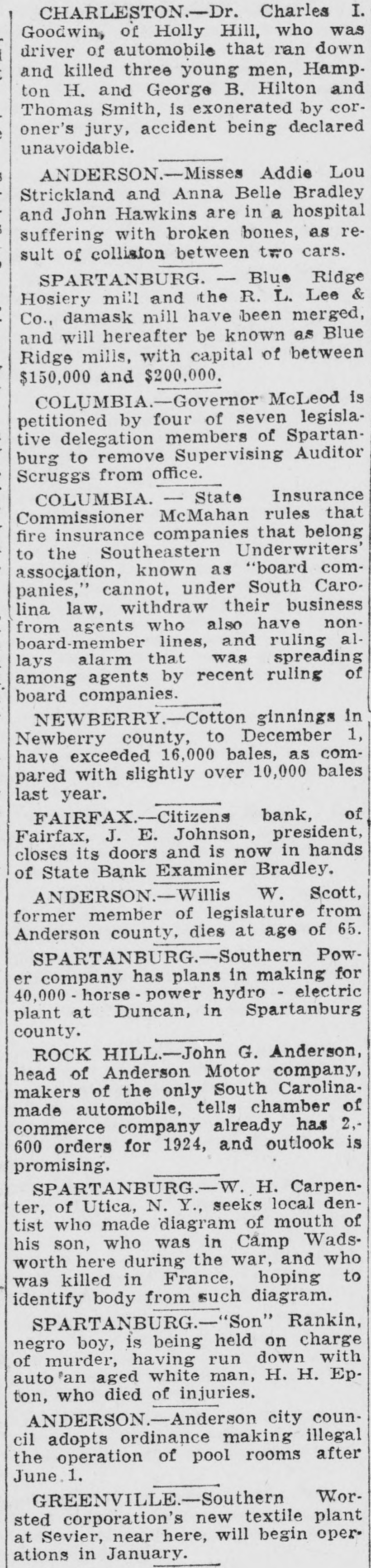 CHARLESTON.-Dr. Charles I. Goodwin, of Holly Hill, who was driver of automobile that ran down and killed three young men, Hamp. ton H. and George B. Hilton and Thomas Smith, is exonerated by coroner's jury, accident being declared unavoidable. ANDERSON.-Misses Addie Lou Strickland and Anna Belle Bradley and John Hawkins are in a hospital suffering with broken bones, as result of collision between two cars. SPARTANBURG. - Blue Ridge Hosiery mill and the R. L. Lee & Co., damask mill have been merged, and will hereafter be known as Blue Ridge mills, with capital of between $150,000 and $200,000. COLUMBIA.-Govermor McLeod is petitioned by four of seven legislative delegation members of Spartanburg to remove Supervising Auditor Scruggs from office. COLUMBIA. - State Insurance Commissioner McMahan rules that fire insurance companies that belong to the Southeastern Underwriters' association, known as "board companies," cannot, under South Carolina law, withdraw their business from agents who also have nonboard-member lines, and ruling allays alarm that was spreading among agents by recent ruling of board companies. NEWBERRY.-Cotton ginnings in Newberry county, to December 1, have exceeded 16,000 bales, as compared with slightly over 10,000 bales last year. FAIRFAX.-Citizens bank, of Fairfax, J. E. Johnson, president, closes its doors and is now in hands of State Bank Examiner Bradley. ANDERSON.-Willis W. Scott, former member of legislature from Anderson county, dies at age of 65. SPARTANBURG.-Southern Power company has plans in making for 40,000 horse power hydro - electric plant at Duncan, in Spartanburg county. ROCK HILL.-John G. Anderson, head of Anderson Motor company, makers of the only South Carolinamade automobile, tells chamber of commerce company already has 2,600 orders for 1924, and outlook is promising. SPARTANBURG.-W. H. Carpenter, of Utica, N. Y., seeks local dentist who made diagram of mouth of his son, who was in Camp Wadsworth here during the war, and who was killed in France, hoping to identify body from such diagram. SPARTANBURG.-"Son" Rankin, negro boy, is being held on charge of murder, having run down with auto'an aged white man, H. H. Epton, who died of injuries. ANDERSON.-Anderson city council adopts ordinance making illegal the operation of pool rooms after June 1. GREENVILLE-Southern Worsted corporation's new textile plant at Sevier, near here, will begin operations in January.
