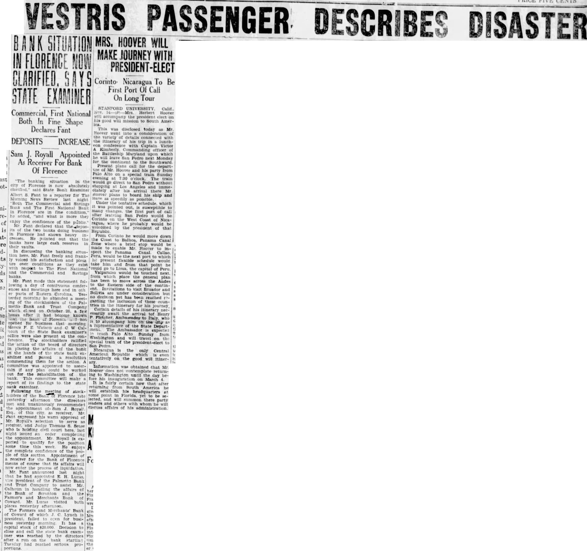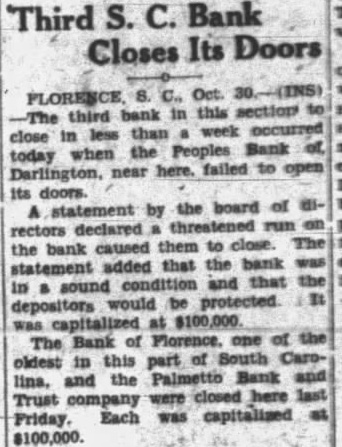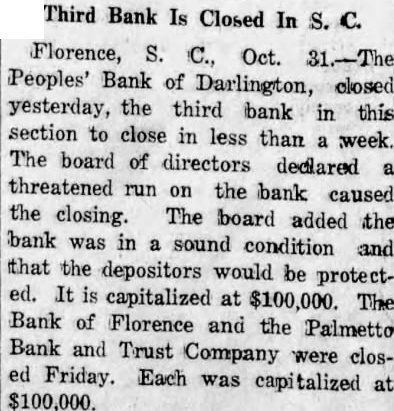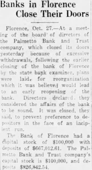 Banks in Florence Close Their Doors Florence, Oct. meetof the board of directors of the Palmetto Bank and Trust company, which closed its doors yesterday because of excessive withdrawals, following the closing of the bank of Florence the state bank examiner, were laid, for reorganization which was believed would lead early reopening the bank. Directors they considered the affairs of the bank sound. It was closed. they to prevent preference to depositors in the face of an incipThe Bank of Florence had capital stock of $100,000 with deposits of $667,012.61. The Bank and Trust company's stock and