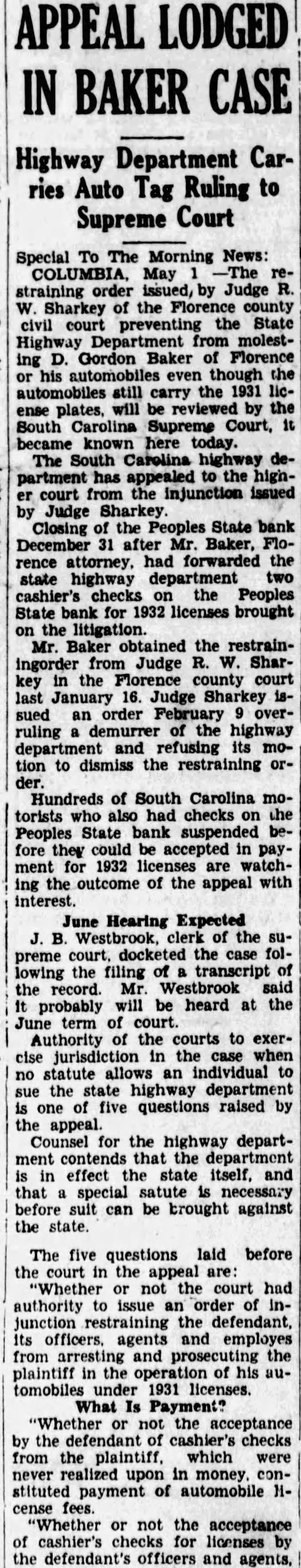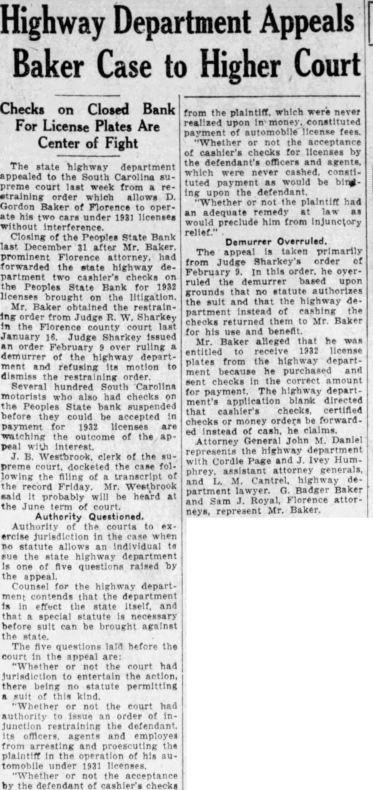 Highway Department Appeals Baker Case to Higher Court Checks on Closed Bank For License Plates Are Center of Fight The state highway department appealed to the South Carolina supreme court last week from restraining order which allows D. Gordon Baker of Florence to operate his two cars under 1931 licenses without interference. Closing of the Peoples State Bank last December 31 after Mr. Baker. prominent Florence attorney, had forwarded the state highway department two cashier's checks on the Peoples State Bank for 1932 licenses brought on the litigation. Mr. Baker obtained the restraining order from Judge R. W. Sharkey in the Florence county court last January 16. Judge Sharkey issued an order February over ruling a demurrer of the highway department and refusing its motion to dismiss the restraining order Several hundred South Carolina motorists who also had checks on the Peoples State bank suspended before they could be accepted in payment for 1932 licenses are watching the outcome of the appeal with interest. J. B. Westbrook, clerk of the supreme court, docketed the case following the filing of transcript of the record Friday. Mr. Westbrook said It probably will be heard at the June term of court. Authority Questioned. Authority of the courts to exercise jurisdiction in the when no statute allows an individual to sue the state highway department is one of five questions raised by the appeal. Counsel for the highway department contends that the department is in effect the state itself, and that special statute is necessary before suit can be brought against the state. The five questions laid before the court in the appeal are: "Whether or not the court had jurisdiction to entertain the action, there being no statute permitting suit of this kind. 'Whether or not the court had authority to issue an order of injunction restraining the defendant. its officers. agents and employes from arresting and proescuting the plaintiff in the operation of his automobile under 1931 licenses. "Whether or not the acceptance by the defendant of cashier's checks from the plaintiff. which were never realized upon in money. constituted payment of automobile license fees. "Whether or not the acceptance of cashier's checks for licenses by the defendant's officers and agents, which were never cashed. constituted payment as would be binding upon the defendant. "Whether or not the plaintiff had an adequate remedy at law as would preclude him from injunctory relief." Demurrer Overruled. The appeal taken primarily from Judge Sharkey's order of February 9. In this order. he overruled the demurrer based upon grounds that no authorizes the suit and that the highway department instead of cashing the checks returned them to Mr. Baker for his use and benefit. Mr. Baker alleged that he was entitled to receive 1932 license plates from the highway department because he purchased and sent checks in the correct amount for payment. The highway department's application blank directed that cashier's checks, certified checks money orders be forwarded instead of cash, he claims. Attorney General John M. Daniel represents the highway department with Cordie Page and Ivey Humphrey, assistant attorney generals, and L. M. Cantrel, highway department lawyer. G. Badger Baker and Sam J. Royal, Florence attorneys, represent Mr. Baker.