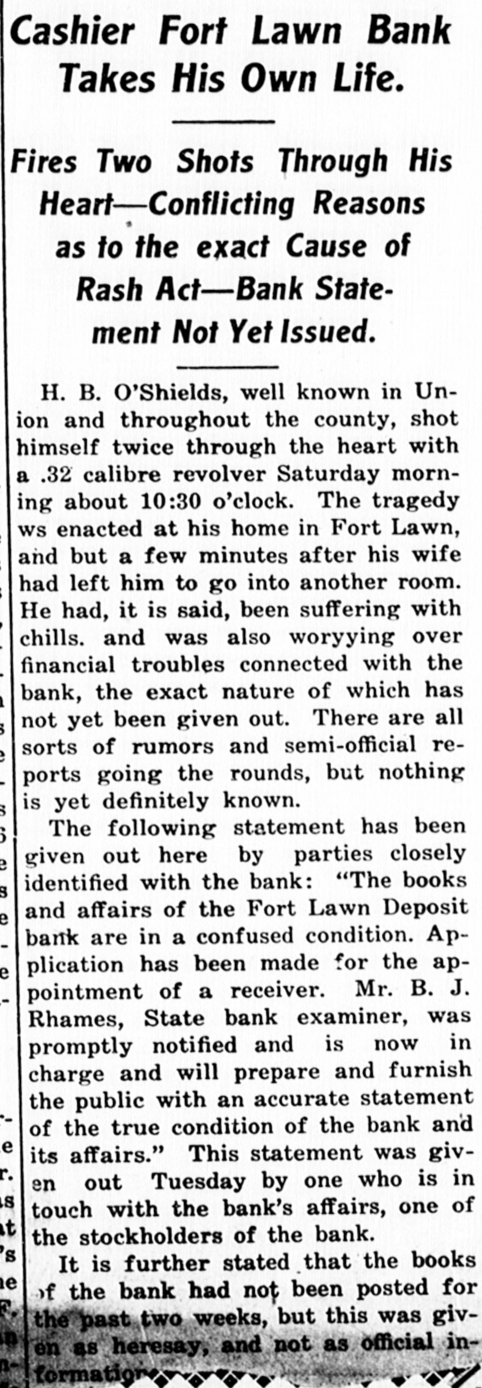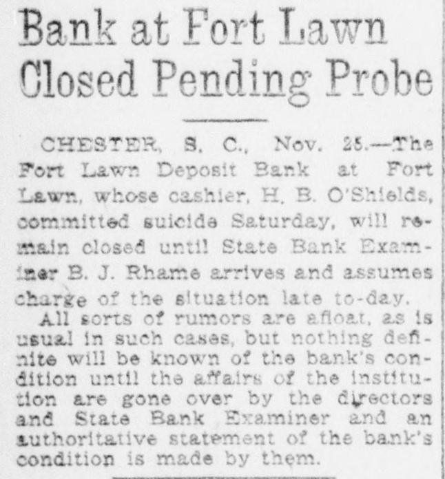 LOCAL LACONICS. The Fort Lawn Bank. Judge Prince on last Saturday, appointed William H. Gist, the president. and D. Ferguson, one of the largest stockholders, receivers of the Fort Lawn bank. There was no opposition to the receivership proceedings. Fire Near Smyrna. The home of Mr. H. M. Shillinglaw of Smyrna No. 1, caught fire last Wednesday while the family was at dinner. A spark from the chimney set the roof ablaze, but a negro man who was passing by discovered the flames in time to prevent the destruction of the building. The damage was confined to an ugly hole in the roof. Death of James White. James White, son of Mr. and Mrs. Lossing B. White, of the Neely cotton mill, Yorkville, died last Friday morning following an illness of fifteen months with tuberculosis. The young man was born on January 3. 1896, and had spent the greater portion of his life around Yorkville where he had many friends. Funeral services were held at the home Saturday afternoon, conducted by Rev. F. A. Sparman of Spartanburg, assisted by Rev. E. E. Gillespie and Rev. J. L. Oates. The interment was in Rose Hill cemetery. Shot at a Hot Supper. Walter Rainey, a negro about 22 years of age, who works for Mr. Pink Allison in Broad River township, was shot and probably fatally wounded, by Pink Wright, another negro, last Thursday night. The shooting took place at the home of a negro named John Byers, where a hot supper had been held. It seems that Rainey was standing on the front porch of Byers' house when Wright came up and asked, "Where is Walter Rainey?" "Here I is," said Rainey, whereupon Wright raised his shotgun and fired, the charge entering Rainey's thigh, breaking the bone and tearing the member partly off. After the shooting Wright went to his home and then took his time about escaping. He has not been arrested. At last reports the injured man was still living.