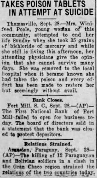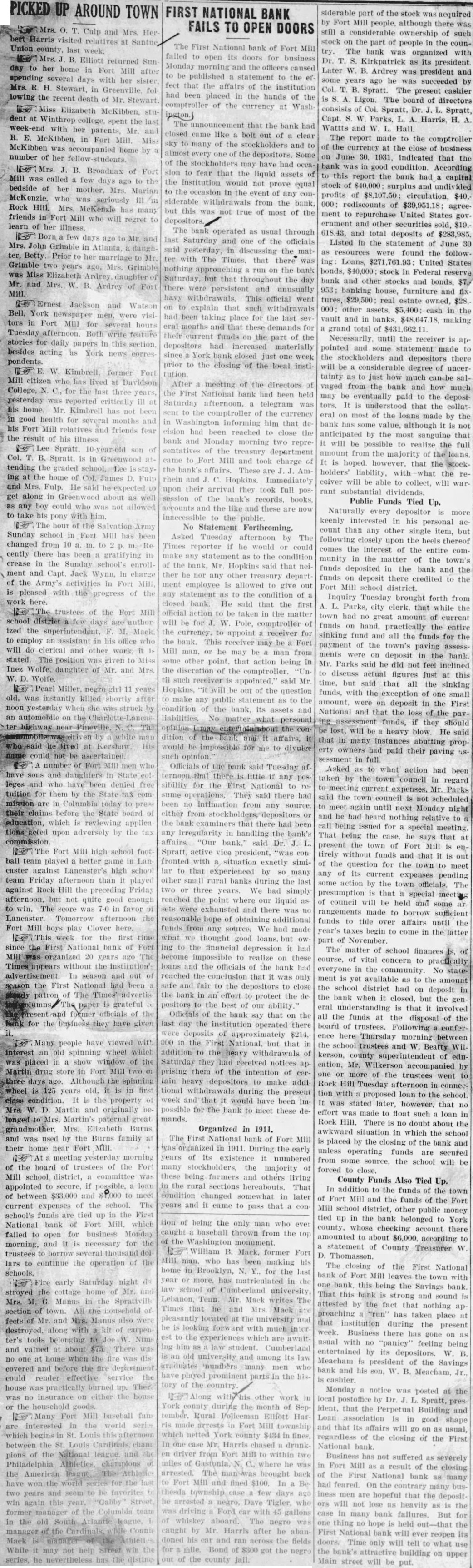 Organized in 1911. The First National bank of Fort Mill was organized in 1911. During the early years of its existence it numbered many stockholders, the majority of these being farmers and others living in the rural sections hereabouts. That condition changed somewhat in later years and It came to pass that a con- tion of being the only man who ever caught baseball thrown from the top the Washington monument. E William B. Mack. former Fort MILL man. who has been making his home in Brooklyn, N. for the last year or more, has matriculated in the law school of Cumberland university, Lebanon, Tenn. Mr. Mack writes The Times that he and Mrs Mack at the university and he is looking forward with much_into est to the experiences which are await. ing him as law student. Cumberland old university and among its law graduates 'nunibers many men who have played prominent parts in the history of the country - Along his other work in York county during the month of September. Hural Ellfott Har ris made arrests in Fort Mill township which netted York county $434 in fines In one case Mr. Harris chased drunk en driver from Fort Mill to within two miles of Gastonia, C., where he was arrested. The brought back to Fort Mill and fined $100. In a Be thesda few days ago he arrested a negro, Dave Tigler, who driving Ford car with 45 gallons whiskey aboard. The negro caught by Mr. Harris after he abandoned his car and ran across the fields for mile. Bond of $300 got the negro of the county jall. siderable part of the stock acquired by Fort Mill people, although there was still a considerable ownership of such stock on the part of people the country. The bank was organized with Dr. T. S. Kirkpatrick as its president Later W. B. Ardrey was president and some years ago he was succeeded by Col. T. B. Spratt. The present cashier is S. A. Ligon. The board of directors consists of Col. Spratt, Dr. J. L. Spratt, Capt. S. W. Parks, L. A. Harris, H. A. Wattts and W. L. Hall. The report made to the comptroller of the currency at the close of business on June 30. 1931, indicated that the bank was in good condition According to this report the bank had capital stock of $40,000 surplus and undivided profits of $8,107.50: circulation, $40,000: rediscounts of $39,951.18: agreement to repurchase United States gov. ernment and other securities sold, $19.and total deposits of $283,985. Listed in the statement of June 30 as resources were found the following Loans, United States bonds, $40,000: stock in Federal reserve bank and other stocks and bonds, $7.953: banking house, furniture and fix tures, $29,500 real estate owned, $28, 000 other assets, $5,400: cash in the vault and in banks, $48,647.1 making grand total of Necessarily, until the receiver is apr pointed and some statement made to the stockholders and depositors there will be considerable degree of uncertainty as to just how much can-be salvaged from the bank and how much may be eventually paid to the depositors. It is understood that the collateral on most of the loans made by the bank has value, although is not anticipated by the most sanguine that it will be possible to realize the full from the majority of the loans. It is hoped. however, that the stockholders' liability, with what the receiver will be able to collect, will warrant Public Funds Tied Up. Naturally every depositor more keenly interested in his personal account than any other single item, but following closely upon the heels thereof comes the interest of the entire com munity in the matter of the town's funds deposited in the bank and the funds on deposit there credited to the Fort Mill school district. Inquiry Tuesday brought forth from A. L. Parks, city clerk, that while the town had no great amount of current funds on hand. practically the entire sinking fund and all the funds for the payment of the town's paving assess ments deposit in the bank. Mr. Parks said he did not feel inclined discuss actual figures just at this time. but said that all the sinking funds, with the exception of one small amount, were on deposit in the First National and that the loss of the paving assessment funds, if they should be lost, will be heavy blow. He said that in many instances abutting prop. erty owners had paid their paving issessment in full Asked as to what action had been taken by the town council in regard to current expenses. Mr. Parks said the town council is not scheduled to meet again until next Monday night and he had heard nothing relative to call being issued for a special meeting. That being the he says that at present the town of Fort Mill is entirely without funds and that it is out of the question for the town to meet any of its current expenses pending some action by the town officials The presumption is that a special meeting of council will be held and some ar rangements made to borrow sufficient funds to tide over affairs until the year's taxes begin to come in the latter part of November The matter of school finances of course, of vital concern to practically everyone in the community No statement is yet available as to the amount the school district had on deposit in the bank when it closed. but the gen eral understanding is that it involved all the funds at the disposal of the board of trustees. Following confer ence here Thursday morning between the trustees and W. Beatty WIL. kerson, county superintendent of education, Mr. Wilkerson accompanied by one or more of the trustees went to Rock Hill Tuesday afternoon in connection with proposed loan to the school. It was stated later, however, that no effort was made to float such loan in Rock Hill. There is no doubt about the awkward situation in which the school is placed by the closing of the bank and unless operating funds are secured from some source, the school will be forced to close. County Funds Also Tied Up. In addition to the funds of the town of Fort Mill and the funds of the Fort Mill school district, other public money tied up in the 