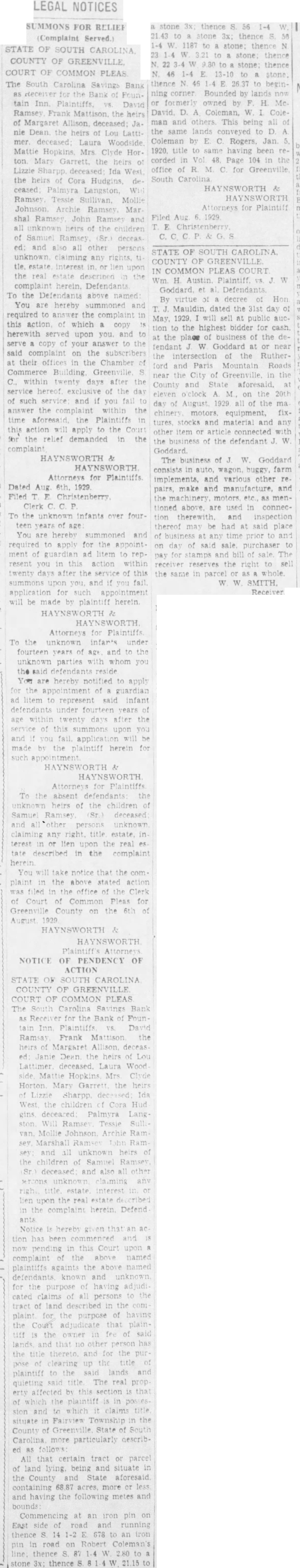 LEGAL NOTICES SUMMONS FOR RELIEF (Complaint Served.) STATE OF SOUTH CAROLINA COUNTY OF GREENVILLE COURT OF PLEAS The South Carolina Savings Bank for the of FounInn. David Ramsey Mattison. the heirs of Margaret Allison deceased: Ja. nie Dean the heirs of Lou Lattimer. deceased: Laura Woodside. Mattie Hopkins. Mrs Clyde HorMary Garrett, the heirs Lizzie Ida West the heirs of Cora Hudgins, deceased Palmyra Langston, Ramsey Tessie Sullivan, Mollie Johnson Archie Ramsey Mar shal Ramsey John Ramsey and all unknown heirs of the children of Samuel Ramsey deceas. ed: and other persons claiming any rights, estate in upon the real estate described the complaint herein. Defendants To the Defendants above named: You are hereby summoned and required to answer the complaint in this action which copy served upon and to serve copy of your answer to the said complaint on the subscribers at their in the Chamber of Commerce Building Greenville within twenty days after the service hereof exclusive of the day of such service and you fail to answer the complaint within the time aforesaid. the Plaintiffs in this action will apply the Court for the relief demanded in the complaint HAYNSWORTH HAYNSWORTH Attorneys for Plaintiffs Dated Aug. 1929 Filed Christenberry Clerk To the unknown infants over fourteen years age You are hereby summoned and required apply for the appoint. ment of guardian ad litem to represent you in this action within twenty after the service of this summons and if you fail application for appointment will be made by plaintiff herein. HAYNSWORTH Attorneys for Plaintiffs To the unknown infarts under fourteen years age and unknown parties whom you the said defendants reside You are hereby notified to apply for the appointment of guardian ad litem to represent said infant defendants under years of within twenty days after the service of summons upon you fail. application will be made the plaintiff herein for such HAYNSWORTH HAYNSWORTH Attorneys Plaintiffs To the absent the unknown heirs of the children Samuel Ramsey Sr.) deceased and persons unknown claiming any right title estate terest or lien upon the real tate described in the complaint You will take notice that the comin the above stated action was filed the office the Clerk of Court Common Pleas for Greenville County on the 6th of August 1929 HAYNSWORTH HAYNSWORTH NOTICE OF PENDENCY OF ACTION STATE OF SOUTH CAROLINA COUNTY OF COURT OF COMMON PLEAS The South Carolina Savings Bank as Receiver for the Bank of Fountain Inn Plaintiffs David Ramsay Frank Mattison the heirs of Margaret Janie Dean the heirs Lou Lattimer deceased. Laura Wood side Mattie Hopkins Mrs Clyde Horton Mary Garrett the heirs Lizzie Ida West children Cora Hud gins Palmyra Mollie Johnson Archie Ram Marshall all unknown the children of Samuel Ramsey deceased and unknown claiming estate interest upon the real estate the complaint Defend ants Notice hereby tion pending this Court complaint the above named plaintiffs againts named known for the having adjudi purpose cated claims persons the land the plaint the purpose of having the Court that the owner fee said lands and other person has the and for the of clearing the title the said lands and plaintiff quieting title The real prop erty affected section that of which the plaintiff in sion and to claims situate Fairview in the County of Greenville State South Carolina more particularly describas follows: All certain tract or parcel of land lying. being and situate in County and State aforesaid containing acres, or less and having the following metes and Commencing at an iron East of road and running thence 678 to an in road on Robert Coleman's thence stone thence stone 3x; thence 56 1-4 stone thence 1-4 1187 to stone: thence to thence stone: thence N. 1-4 13-10 stone. thence N. to beginning corner Bounded by lands or formerly owned by Mc. David. D. A Coleman, Coleman and others. This being all the same lands conveyed to D. Coleman by Rogers, Jan. 1920. title to same having been corded in Page 104 in office of for Greenville South Carolina HAYNSWORTH Attorneys for Plaintiff Filed Aug Christenberry STATE OF SOUTH CAROLINA COUNTY OF GREENVILLE IN COMMON PLEAS COURT Goddard Defendants By virtue decree of Hon Mauldin, dated the 31st day May, 1929, sell at public auc. tion to the highest bidder for cash. at the place business the defendant Goddard at or near the intersection the Rutherford and Paris Mountain Roads near City of Greenville, County aforesaid, eleven o'clock on the day August 1929 of the ma chinery equipment, fixtures. stocks and material any other item article connected with the business of the defendant The business of W. Goddard consists in auto, wagon. buggy farm implements, and various other repairs, and manufacture, and the etc., mentioned above. are connecinspection thereof be had at said place of business any time prior to and on day of said sale. purchaser stamps and bill sale The pay receiver the right to the same in parcel whole Receiver
