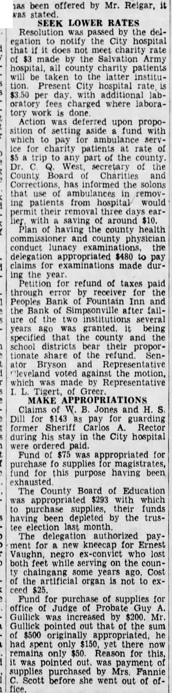 has been offered by Mr. Reigar, it stated. SEEK LOWER RATES Resolution the delnotify the City hospital the Army hospital, charity patients be taken to the latter instituPresent City hospital rate with additional oratory fees charged where laboratory Action was deferred upon propoaside with which servfor charity patients rate of trip any the county. secretary of County Board Charities Corrections, informed the solons that use ambulances removing patients from would with saving around Plan having the county health and county conduct lunacy the appropriated $480 claims for examinations made the refund of taxes paid through error receiver for the Bank Fountain Inn the Bank after failthe two institutions granted. being specified that the county and the school districts bear their proportionate share refund. Senator Bryson Representative "leveland voted against the motion, which Representative MAKE Claims Jones H. $143 pay for guarding former Sheriff Rector during his stay the City hospital paid. Fund appropriated for purchase supplies magistrates, for this purpose having been County Board of Education $293 with which purchase supplies, their funds depleted by the trusdelegation authorized payfor kneecap for Ernest Vaughn, negro ex-convict who while serving on the counchaingang Cost organ is not to ex$25. Fund purchase of supplies for office Judge Gullick by $200. Mr. Gullick pointed out that of the sum $500 originally appropriated, he had spent yet there remains only Reason for this, was pointed out. was payment supplies purchased Mrs. Scott before she went out of office.