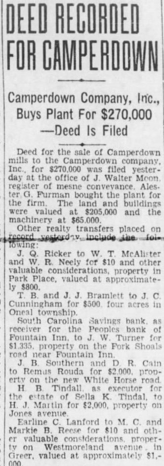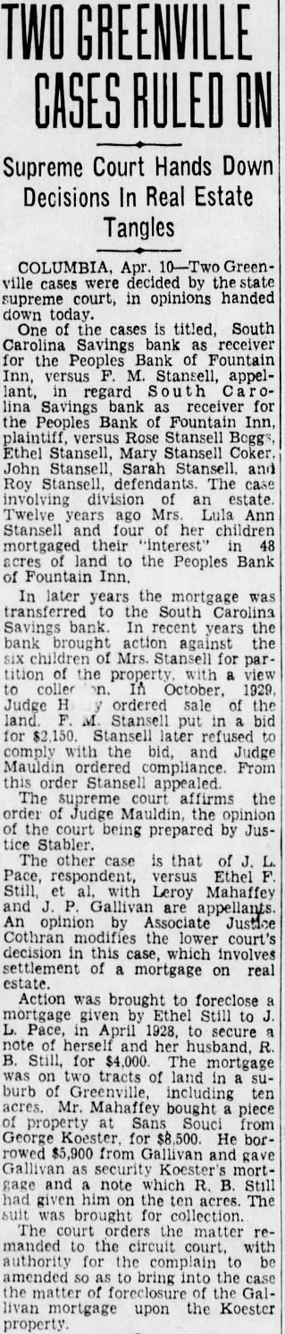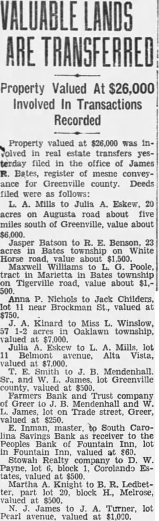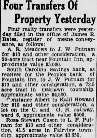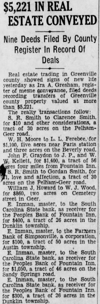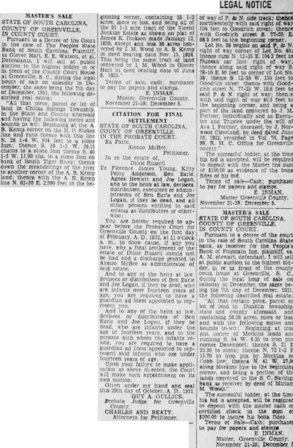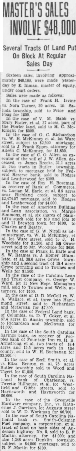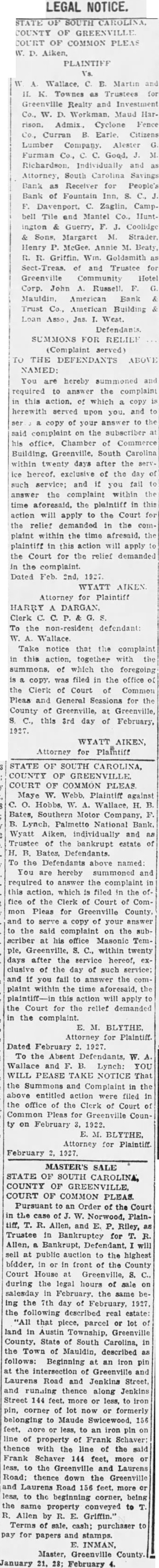 LEGAL NOTICE. STATE SOUTH CAROLINA, COUNTY OF GREENVILLE COURT OF COMMON PLEAS W. D. PLAINTIFF W A. Wallace. B. Martin and 11. K. Townes as Trustees for Realty and Investment Co., W. D. Workman. Maud Harrison, Admix, Cyclone Fence Co., Curran B. Earle. Citizens Lumber Company. Alester G Furman C. Good, M Richardson. Individually and Attorney, South Carolina Savings Bank Receiver for People's Bank of Fountain Inn, S. C., F. C. Zaglin, Camp. bell Tile and Mantel Huntington & Guerry, F. J. Coolidge & Sons, Margaret M. Strader. Henry McGee. Annie M. Beaty, R. R. Griffin. Wm. Goldsmith as and Trustee for Greenville Community Hotel Corp. John Russell F. G. Mauldin, American Bank Trust Co., American Building Loan Asso, Jas. West. Defendants SUMMONS FOR RELIEF (Complaint served) TO THE DEFENDANTS ABOVE NAMED: You are hereby summoned and required to answer the complaint in this action. of which copy herewith served you. and to ser copy of your answer to the said complaint the subscriber his office. Chamber of Commerce Building. Greenville, South Carolina within twenty days after the serv. ice hereof. exclusive of the day of such service; and you fail to answer the complaint within the time aforesaid, the plaintiff in this action will apply to the Court for the relief demanded in the complaint within the time afresaid, the plaintiff in this action will apply to the Court for the relief demanded in complaint. Dated Feb. 2nd, 1927 WYATT AIKEN. Attorney for Plaintiff HARRY A DARGAN. Clerk C. To the non-resident defendant: W. Wallace. Take notice that the complaint in this action, together with the summons, of which the foregoing is a copy, was filed in the office of the Clerk of Court Common Pleas and General Sessions for the County of Greenville, at Greenville, S. C., this 3rd day of February, 1927. WYATT AIKEN, Attorney for Plaintiff STATE SOUTH CAROLINA, COUNTY GREENVILLE COURT OF COMMON PLEAS Maye W. Webb, Plaintiff against C. O. Hobbs, W. Wallace, H. B. Bates, Southern Motor Company, F. B. Lynch, Palmetto National Bank. Wyatt Aiken, individually and as Trustee of the bankrupt estate of H. B. Bates, Defendants. To the Defendants above named: You are hereby summoned and required to answer the complaint in this action, which filed in the of. fice of the Clerk Court of Common Pleas for Greenville County. and to serve copy of your answer to the said complaint on the subscriber at his office Masonic Temple, Greenville, S. C., within twenty days after the service hereof, exclusive of the day of such service: and if you fail to answer the complaint within the time aforesaid, the plaintiff-in this action will apply to the Court for the relief demanded in the complaint. M. BLYTHE Attorney for Plaintiff. Dated February 2. 1927. To Absent Defendants, W. Wallace and F. Lynch: YOU WILL PEASE TAKE NOTICE That the Summons and Complaint the above entitled were filed in the office of the Clerk of Court of Pleas for Greenville County on February 3, 1922. E. M. BLYTHE, Attorney for Plaintiff February 1927. MASTER'S SALE STATE OF SOUTH CAROLINA, COUNTY OF GREENVILLE, COURT OF COMMON PLEAS Pursuant to an Order of the Court in the case of W. Norwood, Plaintiff, T. R. Allen, and E. P. Riley, as Trustee in Bankruptcy for T. R. Allen, Bankrupt, Defendant, will sell at public auction to the highest bidder, in or in front of the County Court House Greenville, S. C., during the legal hours of sale on salesday in February. the same be ing the 7th day of February, 1927. the following described real estate: "All that piece, parcel or lot of land in Austin Township, Greenville County, State of South Carolina, in the Town of Mauldin, described as follows: Beginning at an iron pin at the of Greenville and Laurens Road and Jenkins Street, and runaing thence along Jenkins Street 144 feet. more less to iron pin, corner of lot now or formerly belonging to Maude Swicewood, 156 feet, hore less, to an iron pin on line of property of Frank Schaver thence with the line of the said Frank Schaver 144 feet, more or less, the Greenville and Laurens Road; thence down the Greenville and Laurens Road 156 feet, more or less, to the beginning corner, being the property conveyed to T. R. Allen by R. E. Griffin." Terms of sale, cash; purchaser to pay for papers and stamps. INMAN, Master, Greenville County. January 21, 28; February 4.