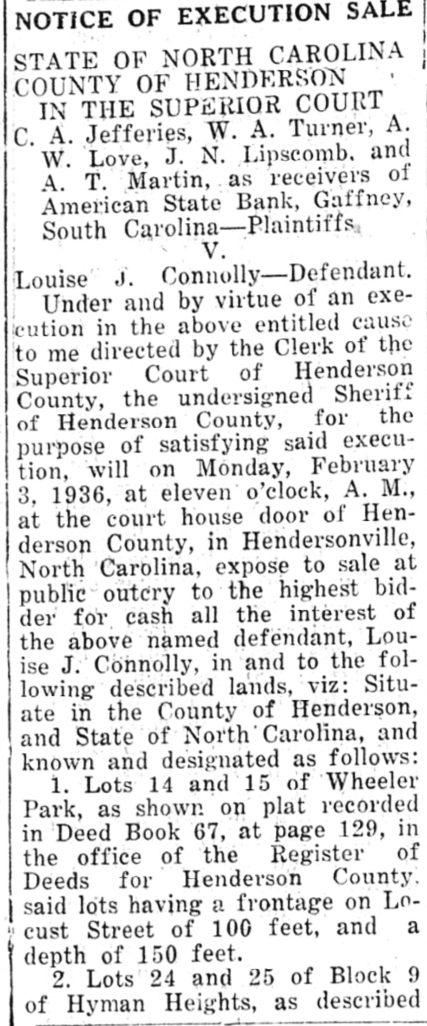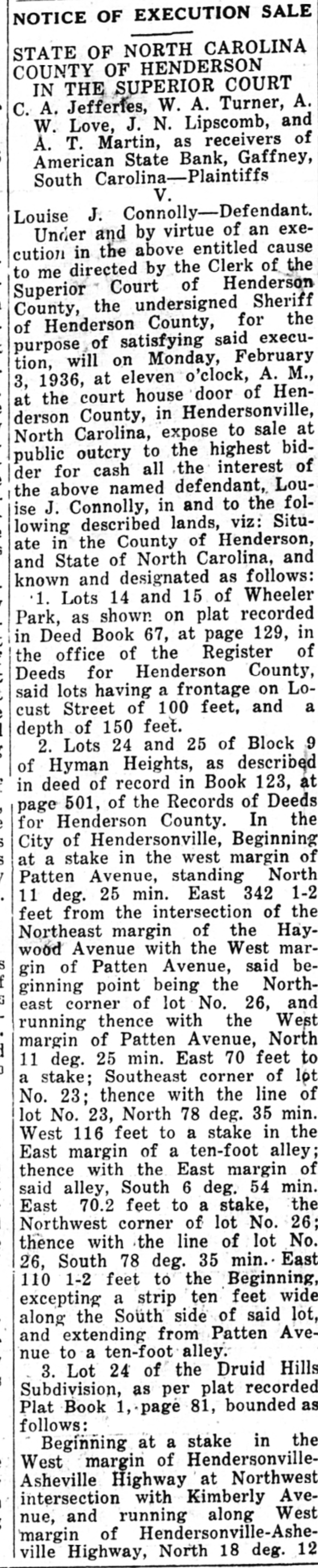 # NOTICE OF EXECUTION SALE STATE OF NORTH CAROLINA COUNTY OF HENDERSON IN THE SUPERIOR COURT C. A. Jefferies, W. A. Turner, A. W. Love, J. N. Lipscomb, and A. T. Martin, as receivers of American State Bank, Gaffney, South Carolina—Plaintiffs V. Louise J. Connolly—Defendant. Under and by virtue of an execution in the above entitled cause to me directed by the Clerk of the Superior Court of Henderson County, the undersigned Sheriff of Henderson County, for the purpose of satisfying said execution, will on Monday, February 3, 1936, at eleven o'clock, A. M., at the court house door of Henderson County, in Hendersonville, North Carolina, expose to sale at public outcry to the highest bidder for cash all the interest of the above named defendant, Louise J. Connolly, in and to the following described lands, viz: Situate in the County of Henderson, and State of North Carolina, and known and designated as follows: 1. Lots 14 and 15 of Wheeler Park, as shown on plat recorded in Deed Book 67, at page 129, in the office of the Register of Deeds for Henderson County, said lots having a frontage on Locust Street of 100 feet, and a depth of 150 feet. 2. Lots 24 and 25 of Block 9 of Hyman Heights, as described in deed of record in Book 123, at page 501, of the Records of Deeds for Henderson County. In the City of Hendersonville, Beginning at a stake in the west margin of Patten Avenue, standing North 11 deg. 25 min. East 342 1-2 feet from the intersection of the Northeast margin of the Haywood Avenue with the West margin of Patten Avenue, said beginning point being the Northeast corner of lot No. 26, and running thence with the West margin of Patten Avenue, North 11 deg. 25 min. East 70 feet to a stake; Southeast corner of lot No. 23; thence with the line of lot No. 23, North 78 deg. 35 min. West 116 feet to a stake in the East margin of a ten-foot alley; thence with the East margin of said alley, South 6 deg. 54 min. East 70.2 feet to a stake, the Northwest corner of lot No. 26; thence with the line of lot No. 26, South 78 deg. 35 min. East 110 1-2 feet to the Beginning, excepting a strip ten feet wide along the South side of said lot, and extending from Patten Avenue to a ten-foot alley. 3. Lot 24 of the Druid Hills Subdivision, as per plat recorded Plat Book 1, page 81, bounded as follows: Beginning at a stake in the West margin of Hendersonville-Asheville Highway at Northwest intersection with Kimberly Avenue, and running along West margin of Hendersonville-Asheville Highway, North 18 deg. 12