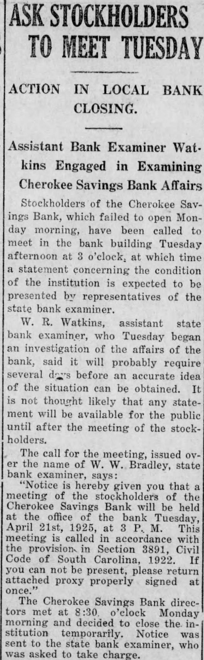 STOCKHOLDERS TO MEET TUESDAY ACTION IN LOCAL BANK CLOSING. Assistant Bank Examiner Watkins Engaged in Examining Cherokee Savings Bank Affairs Stockholders of the Cherokee Savings Bank, which failed to Monopen day morning, have been called meet in the bank building Tuesday afternoon at o'clock, at which time statement concerning the condition of the institution be expected to presented by representatives of the state bank examiner. W. R. Watkins, assistant state bank examiner, who Tuesday began investigation of the affairs of the bank, said will probably require several days before an accurate idea of the situation can be obtained. not thought likely that any statement will be available for the public until after the of the meeting stockholders. The call for the meeting, issued name of Bradley, state bank examiner, is hereby given you that meeting the the Cherokee Savings Bank will be held the office the bank Tuesday, 1925, at This meeting called in accordance with in Section 3891, Civil Code of South Carolina, 1922. If can not be present, please return attached proxy properly signed The Cherokee Savings Bank directors met 8:30 Monday morning decided to close the stitution temporarily. Notice sent the state bank examiner, who asked to take charge.