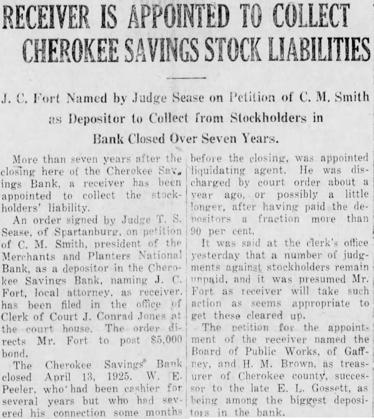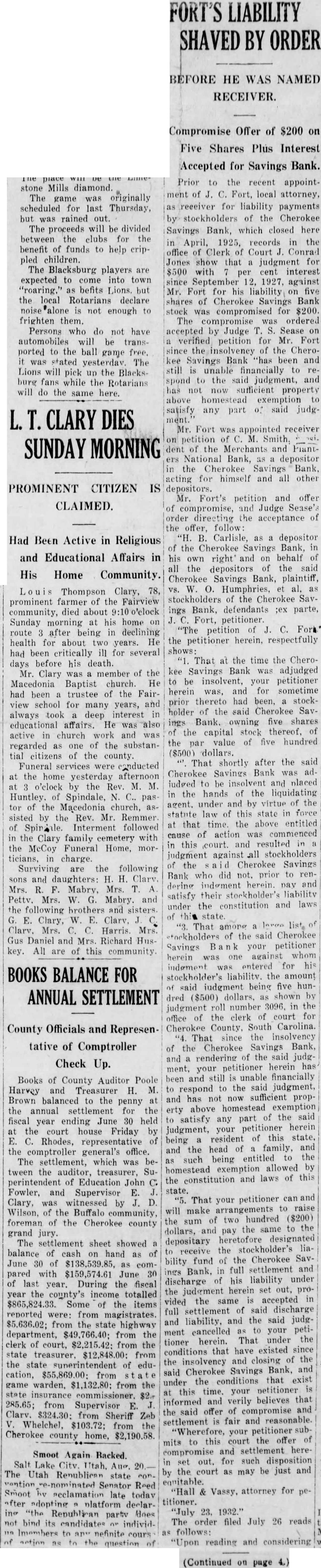 Prior to the recent appointment of Fort, local attorney, receiver for liability payments stockholders of the Cherokee Savings Bank, which closed here April, 1925, records the office Clerk Court Conrad Jones show that judgment for $500 with interest since September 1927, against Mr. Fort for his liability five shares of Cherokee Savings Bank compromised for $200. The ordered accepted by Judge verified petition for Fort since of the CheroSavings Bank been and unable financially spond to the judgment, and not now sufficient property above satisfy any part said judgMr. Fort appointed receiver petition Smith, SUNDAY MORNING of the Merchants and PlantNational Bank, depositor the Savings Bank, for himself and all other PROMINENT CITIZEN IS Mr. Fort's petition and offer CLAIMED. compromise, and Judge Sease's order directing the acceptance the follow: Carlisle, depositor the Cherokee Savings Bank, his right' on behalf all the depositors the Cherokee Savings Bank, plaintiff, Humphries, stockholders of the Cherokee Savings Bank, defendants parte, Fort, petitioner. petition the petitioner respectfully shows: That at the time the Cherokee Savings Bank was adjudged insolvent, your pétitioner herein was, and for sometime thereto had stockprior holder of the said Cherokee Savings Bank. owning five shares the capital stock thereof, the value of five hundred ($500) dollars. That shortly after the said Cherokee Savings Bank indged be insolvent and placed the hands of the liquidating agent. under and by virtue of the law this state force statute that time. the above entitled action commenced cause this court. resulted judgment against all stockholders the Cherokee Savings Bank who did prior to dering herein. stockholder's liability satisfy constitution and laws under the That among stockholders of the said Cherokee Savings your petitioner against whom herein entered for his BOOKS BALANCE FOR stockholder's liability. the amount said judgment being five hunANNUAL SETTLEMENT ($500) shown dred number in judgment of the clerk court for office County, South Carolina. County Officials and RepresenThat since the insolvency tative of Comptroller the Cherokee Savings Bank, rendering the said judgand Check Up. petitioner herein ment, your and still unable financially Books of County Auditor Poole been the judgment, Harvey and Treasurer H. M. respond and has sufficient Brown balanced the penny the annual settlement for the erty above homestead of the said June 30 held satisfy any part fiscal year ending petitioner herein the house Friday judgment, your court resident of this state, Rhodes, representative being family, and and the head the comptroller general's office. entitled the such being The settlement, which homestead exemption allowed tween the auditor, treasurer, Suand laws of this the constitution perintendent of Education John Fowler, and Supervisor That your petitioner Clary, was witnessed by arrangements raise will make Wilson, of the Buffalo of two hundred foreman of the Cherokee the sum county the the dollars, pay grand heretofore designated The settlement sheet showed depositary the stockholder's balance cash hand the Cherokee Savbility fund June of comfull settlement and Bank, pared with $159,574.61 June his liability under discharge last year. During the fiscal the judgment herein set out, year the county's income totalled vided same accepted $865,824.33. Some the items settlement said discharge full reported from magistrates. and the said judgand $5,636.02; from the state highway cancelled your petiment department, from the That under the tioner herein. clerk of court, the have existed since conditions that state from the insolvency and closing the state of eduBank, and Cherokee Savings cation, $55,869.00; from conditions that exist under the game warden, $1,132.80; from the netitioner this your insurance and believes that informed verily from Supervisor the said offer of compromise and Clarv. from Sheriff Zeb settlement fair reasonable. Whelchel, $103.72; from the "Wherefore, your petitioner Cherokee county home, court offer settlement herecompromise and Smoot Again Backed. for such disposition Salt Lake court as may be just The Utah state equitable. Reed "Hall Vassy, attorney for Smoot late todav titioner. platform declar"July 23. 1932." Republican does order filed July 26 reads bind its candidates individImembers follows: nefinite action "Upon reading and considering question