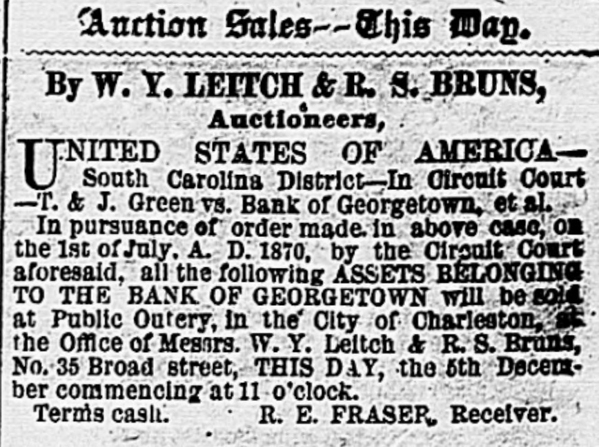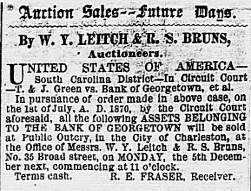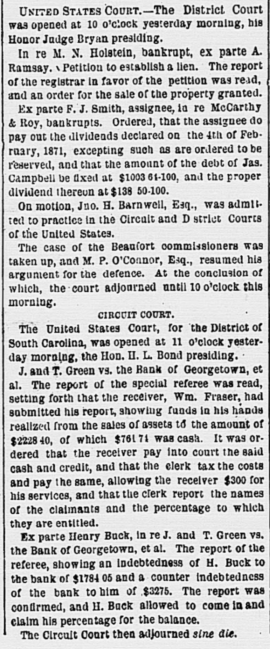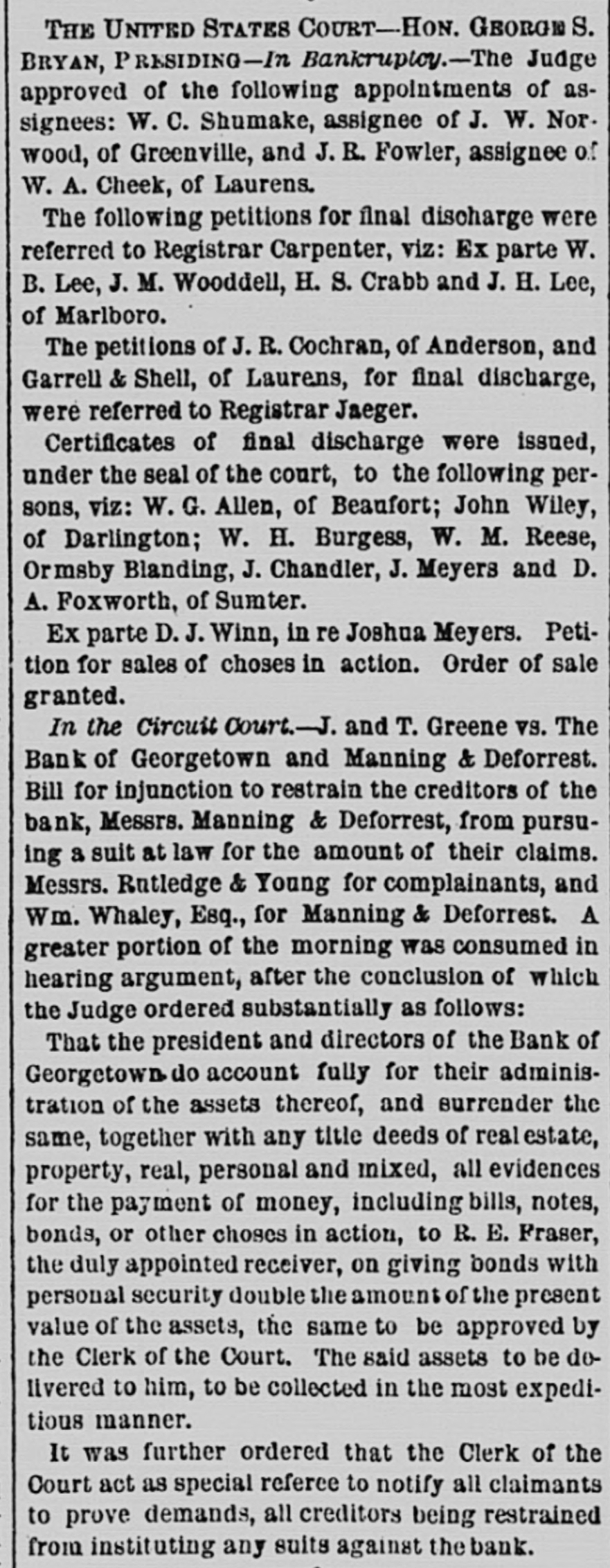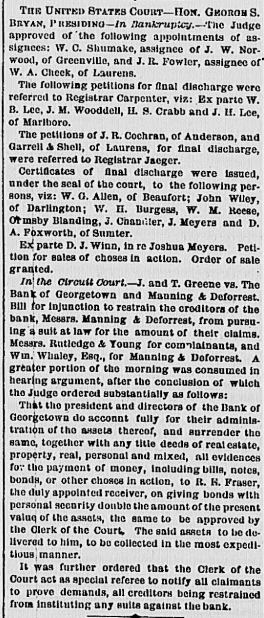 THE UNITED STATES COURT-HON. GEORON S. BRYAN, PRESIDING-In Nankruptcy.-The Judge approved of the following appointments of assignees: W. C. Shumake, assignee of J. W. Norwood, of Greenville, and J. R. Fowler, assignee of W. A. Check, of Laurens. The following petitions for final discharge were referred to Registrar Carpenter, viz: Ex parte W. B. Lee, J. M. Wooddell, H. S. Crabb and J. H. Lee, of Marlboro. The petitions of J.R. Cochran, of Anderson, and Garrell & Shell, of Laurens, for final discharge, were referred to Registrar Jaeger. Certificates of final discharge were issued, under the scal of the court, to the following persons, viz: W. G. Allen, of Beaufort; John Wiley, of Darlington; W. H. Burgess, W. M. Reese, or maby Blanding, 3. Chandler, J. Meyers and D. A. Foxworth, of Sumter. Ex parte D. J. Winn, in re Joshua Meyers. Petition for sales of choses in action. Order of sale granted. In the Circuit Court.-J. and T. Greene VS. The Bank of Georgetown and Manning & Deforrest. Bill for Injunction to restrain the creditors of the bank, Messrs. Manning & Deforrest, from pursuing a suit at law for the amount of their claims. Messrs. Rutledge & Young for complainants, and Wm. Whaley, Esq., for Manning & Deforrest. A greater portion of the morning was consumed in hearing argument, after the conclusion of which the Judge ordered substantially as follows: That the president and directors of the Bank of Georgetown do account fully for their administration of the assets thereof, and surrender the same, together with any title deeds of real estate, property, real, personal and mixed, all evidences for the payment of money, including bills, notes, bonds, or other choscs in action, to R. H. Fraser, the duly appointed receiver, on giving bonds with personal security double the amount of the present valuq of the assets, the same to be approved by the Clerk of the Court, The said assets to be delivered to him, to be collected in the most expeditious manner. It was further ordered that the Clerk of the Court act as special referee to notify all claimants to prove demands, all creditors being restrained from instituting any suits against the bank.
