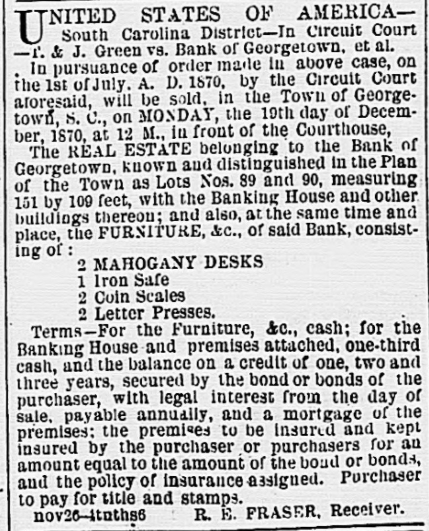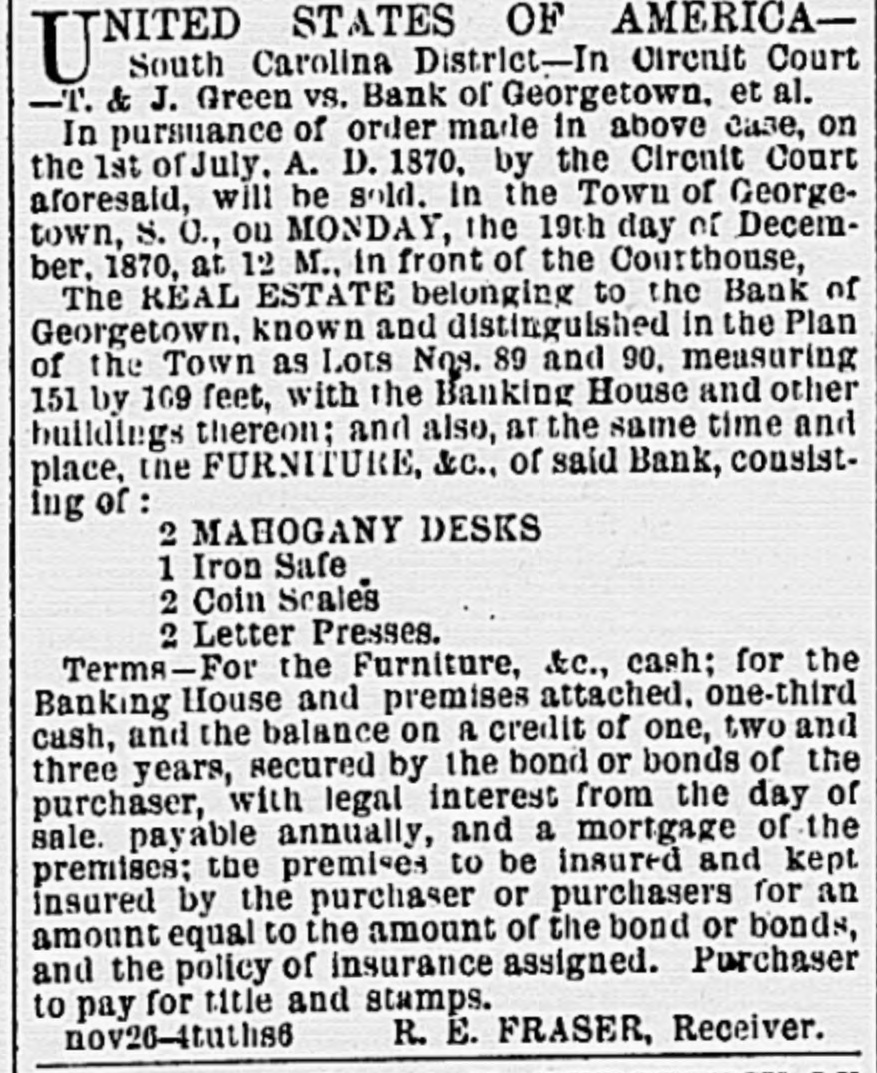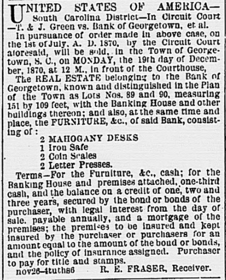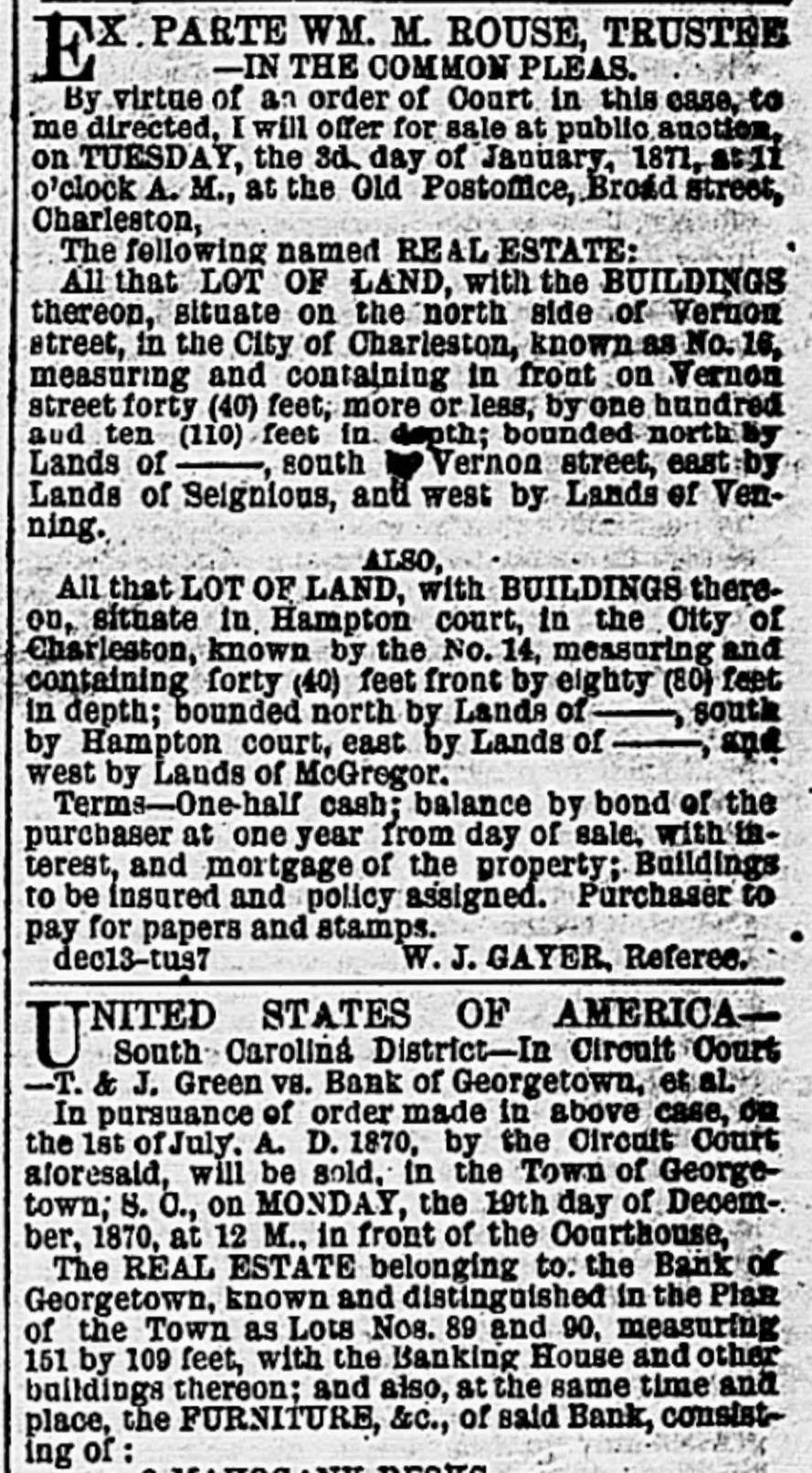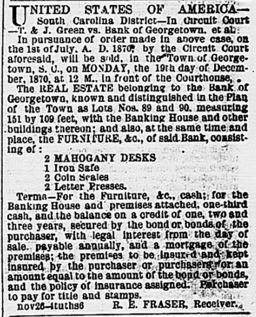 THE UNITED STATES COURT-HON. GEORON S. BRYAN, PRESIDING-In Nankruptcy.-The Judge approved of the following appointments of assignees: W. C. Shumake, assignee of J. W. Norwood, of Greenville, and J. R. Fowler, assignee of W. A. Check, of Laurens. The following petitions for final discharge were referred to Registrar Carpenter, viz: Ex parte W. B. Lee, J. M. Wooddell, H. S. Crabb and J. H. Lee, of Marlboro. The petitions of J.R. Cochran, of Anderson, and Garrell & Shell, of Laurens, for final discharge, were referred to Registrar Jaeger. Certificates of final discharge were issued, under the scal of the court, to the following persons, viz: W. G. Allen, of Beaufort; John Wiley, of Darlington; W. H. Burgess, W. M. Reese, or maby Blanding, 3. Chandler, J. Meyers and D. A. Foxworth, of Sumter. Ex parte D. J. Winn, in re Joshua Meyers. Petition for sales of choses in action. Order of sale granted. In the Circuit Court.-J. and T. Greene VS. The Bank of Georgetown and Manning & Deforrest. Bill for Injunction to restrain the creditors of the bank, Messrs. Manning & Deforrest, from pursuing a suit at law for the amount of their claims. Messrs. Rutledge & Young for complainants, and Wm. Whaley, Esq., for Manning & Deforrest. A greater portion of the morning was consumed in hearing argument, after the conclusion of which the Judge ordered substantially as follows: That the president and directors of the Bank of Georgetown do account fully for their administration of the assets thereof, and surrender the same, together with any title deeds of real estate, property, real, personal and mixed, all evidences for the payment of money, including bills, notes, bonds, or other choscs in action, to R. H. Fraser, the duly appointed receiver, on giving bonds with personal security double the amount of the present valuq of the assets, the same to be approved by the Clerk of the Court, The said assets to be delivered to him, to be collected in the most expeditious manner. It was further ordered that the Clerk of the Court act as special referee to notify all claimants to prove demands, all creditors being restrained from instituting any suits against the bank.
