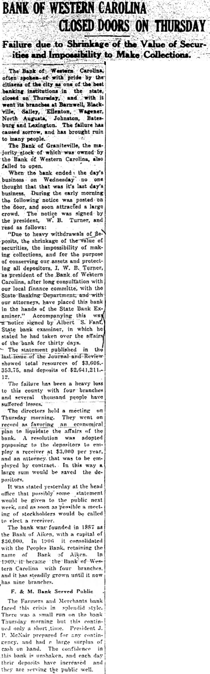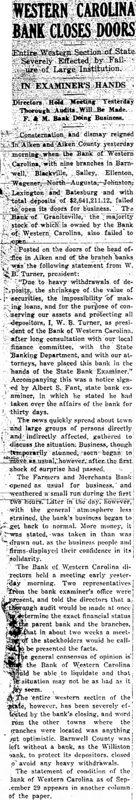 Merger Follows Closing of Three Youngstown Banks Industrial and Commercial Establishments Unite to Aid Youngstown, O., Oct. 15 (P)-Formation of a consolidated bank here to include the First National, the Commercial National and the Mahoning National was under way today following the permanent closing of the City Trust and Savings Bank and Dollar Savings and Trust Company today and the temporary closing of the First National. Closing of the City, Dollar and First, the latter two of which have been under joint management, was necessitated by heavy withdrawals during the last few weeks, officials said. The City Trust had resources of $18,260,000 and the Dollar's resources were $23,242,000 Sept. 29, according to bank statements of that Plans for the consolidated banks are expected to be announced in detail by the end of the week It will be reinforced by $2,000,000 of new capital which has already been subscribed. The Youngstown dis trict's principal and mercantile establishments and many leading citizens joined in the subThe First National will remain closee for two or three days. it was announced. until details of the consolidation worked out. Meanwhile the Commercial National and Mahoning National remain open. As soon as the consolidation plan is completed. all three will continue business under one roof. The Mahoning Savings & Trust Company. affiliated with the Mahoning National. will continue as a separate institution. Resources of the merging banks as of Sept. 29 were given follows: First National. $22,782,000: Mahoning National $7,925,000; Commercial. $9,284,000. Resources of the Mahoning Trust were given as $3,181,000. Jersey Bank Closed Toms River. N. J., Oct. 15 (AP)The Toms River Trust Company did not open its doors today. The notice of the bank's suspension was made public at midnight last night by President A. M. Then who said the heavy withdrawals of State and municipal funds forced the closing. The claims of depositors, President Then declared. would be paid in full. Pennsylvania Bank Fails West Newton, Pa., Oct. 15 (P)The Farmers & Merchants Bank of West Newton was placed in, the hands of the State Banking Department today. John D. Swigart, chief examiner of the department, said the bank was closed because of heavy withdrawa and to protect depositors. He said deposits totaled about $900,000 and were approximately $1,400,000. Small Banks Closed Trenton, N. J., Oct. 15 (P)-G. H. Markley. Deputy Commissioner of Banking and Insurance. announced today the Toms River Trust Company and the Wildwood Trust & Title Company had been taken over by his The Wildwood institution held deposits of $761,141 and the Toms River concern $163,591. Savings Bank Taken Over Tarentum Savings Trust Company was closed today and taken over by the State Banking Department. Examiner John D. Swigart seid the bank had deposits of about $1,800,000 and of $2,300,000. Harrisburg Failure Commercial Trust Company, one of Harrisburg's banks, was taken over today by the State Banking In its last statement the bank listed total resources of $1,606,000 and deposits of $686,000. 12 Southern Failures Columbia. S. C., Oct. 15 (A)Twelve in southwestern South Carolina failed to open their doors today. Albert S. Fant, State Bank Examiner, announced. The banks are the Bank of Western Carolina of Aiken and its nine branches North Augusta, BatesBarnwell, Blackville Lexington and Ellenton and the Bank of Williston and the Bank of Graniteville Assets of the Western Carolina Bank and its branches were placed by Mr Fant at $3,000,000. the Bank of Williston at $350.000 and the Bank of Graniteville at $150,000. Mr. Fant said collections in the banks had been anything but good' and that he advised last night that they not open today. Closing Stock Prices High High. Low High High. High. Close. 38% Fox Film Purity 1700 Un Freeport Tex 313000 Volume to 2:10 000.000 Yesterday's Sales Radio 9300 Gab Snub Low. High. Low. Close. Radio GenAsphalt Abitibi Baking Raybes 1.60 71% Adams Ex 600 Bronze Reading 22% Adams 100 Cigar Real 26 Wabash Rumely Elec Rem Rand 109% 2100 spl 60 Mot Walworth 10% Foods 10600 Ward Alaska 40 10900 GG&E 1800 Warner 2400 GG&E Reyn Met Warren Alleg Mills Reynolds WarrenF&P Allied Ch 9300 Mot ReynoldsTB 3814 Wesson Oil Allis Chalm 103% Mot Richfield West Amal Leather. 1200 Dairy Amerada 29% Western Pac AmBkNote GenR&U Rutland West Pac West Union C&Fdy Gillette Safeway WestghseAB Tiling Gimbel 30% Westgh AmEurope GimbelBr Weston E1 Glidden WestvacoCh Gobel Adolf Southw. Wheel AmHide&L GoldDust Schulte White Goodrich Seabd A WhiteRk Internat Goodyear Goodyr 2½ Wilson AmM&F Gould Nat In Wilson Co Servel Inc Woolwth Grand-Sil Worthington 24 AmP&L Grand Shatt 80% 50% Wrigley Grant Shell Un GtNorth Shubert Thea Am Republics 3% Yellow Truck. 600 6% 1% Grigsby Gru. Simmons 78 19 Youngstown 100 22 22 22 Simms Pet Saf Hackn Sinclair 1% 14 Zonite Pr 1300 Helme SkelO Smelt Sales later edition Hershey Hollnd Dividend. Ex-Rights. And Extras. And Extras AmSol&C Homestake7.80 able Stock. Including Payable Cash Stock Paid year Houdail-H rate. Lows close. South Dividend and Ex Rights deducted carried from net change. HouseF Houston Howe Snd Spaiding Hudson Spencer DAILY MARKET MOVEMENT 13½ 3½ Hupp Mot Spicer 132 112 Spiegel 1/2 ON N. Y. STOCK EXCHANGE 80% 10000 89 Central 1300 1/2 79 Std Indian Ref Wool Indust 1/2 The following table shows the number of advances, 8% 2% StdOCal Ingersoll 50 12% Anaconda StdOExp declines 1931 and the issues unchanged. together with new Inland Stl highs 36 2.40 and lows: Anchor Inspiration Archer Un- New New Sterling Armour Gain Loss changed Total Sterling High 2% Armour Oct. 21% Stewart 84 409 92 585 Interlake 14 29% Asso Stone&Web 98 AssoDG Studebak Oct. 10 203% Atchison Carrier 40% Superht Atchison IntHarvst 23% Oct. 9½ 2% Tenn Corp Powd IntMatch Texas Corp AuburnAut IntNickCa 193 Aviation Paper Tex Paper 27% Baldwin Third Balt 410400 10500 ThirdN1 Barnsdall 398 Interst 81 Beatrice 326 Investors Eq