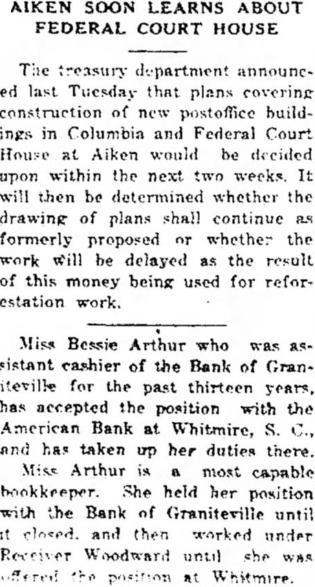 AIKEN SOON LEARNS ABOUT FEDERAL COURT HOUSE The treasury department announced last Tuesday that plans covering construction of new postoffice buildings in Columbia and Federal Court House at Aiken would be decided upon within the next two weeks. It will then be determined whether the drawing of plans shall continue as formerly proposed or whether the work will be delayed as the result of this money being used for reforestation work. Miss Bessie Arthur who was 85sistant cashier of the Bank of Graniteville for the past thirteen years, has accepted the with the position and has taken up her duties there. Miss Arthur is a most capable with the Bank of Graniteville until it closed. and then worked under Receiver Woodward until she offered the position at