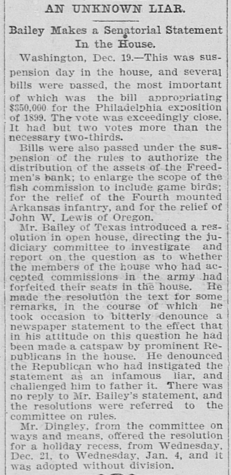 AN UNKNOWN LIAR. Bailey Makes a Senatorial Statement In the House. Washington, Dec. 19.-This was suspension day in the house, and several bills were passed, the most important of which was the bill appropriating $350,000 for the Philadelphia exposition of 1899. The vote was exceedingly close. It had but two votes more than the necessary two-thirds. Bills were also passed under the suspension of the rules to authorize the distribution of the assets of the Freedmen's bank; to enlarge the scope of the fish commission to include game birds; for the relief of the Fourth mounted Arkansas infantry, and for the relief of John W. Lewis of Oregon. Mr. Bailey of Texas introduced a resolution in open house, directing the judiciary committee to investigate and report on the question as to whether the members of the house who had accepted commissions in the army had forfeited their seats in the house. He made the resolution the text for some remarks, in the course of which he took occasion to bitterly denounce a newspaper statement to the effect that in his attitude on this question he had been made a catspaw by prominent Republicans in the house. He denounced the Republican who had instigated the statement as an infamous liar, and challenged him to father it. There was no reply to Mr. Bailey's statement, and the resolutions were referred to the committee on rules. Mr. Dingley, from the committee on ways and means, offered the resolution for a holiday recess, from Wednesday, Dec. 21, to Wednesday, Jan. 4, and it was adopted without division.