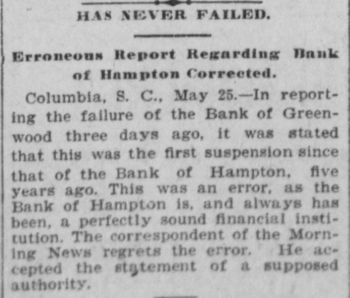 HAS NEVER FAILED. Erroneous Report Regarding Bank of Hampton Corrected. Columbia, S. C., May 25.-In reporting the failure of the Bank of Greenwood three days ago, it was stated that this was the first suspension since that of the Bank of Hampton, five years ago. This was an error, as the Bank of Hampton is, and always has been, a perfectly sound financial institution. The correspondent of the Morning News regrets the error. He accepted the statement of a supposed authority.