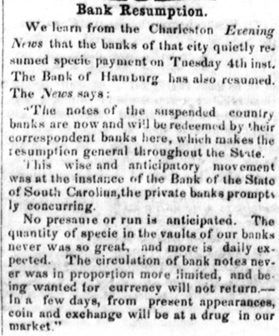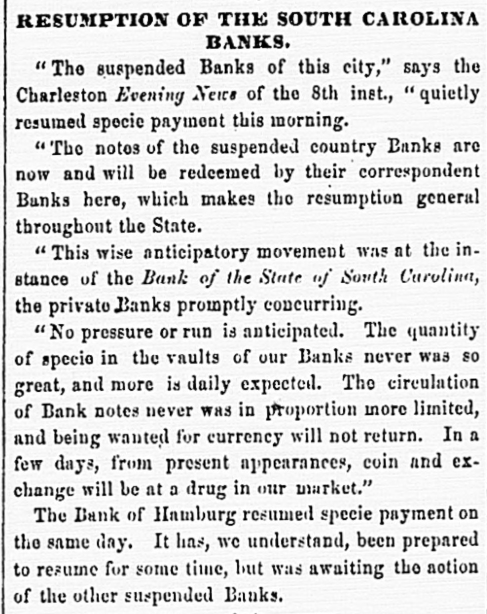 Scraps & Facts. A singular marriage lately took place in Wilkes county, N. C. A man named Holloway married his step mother, the second wife, the widow of his own father ! She had six children, three of them by his father, and three by himself; and having nine children of his own, the couple set up housekeeping with 15 children. The Carolinian in a paragraph in regard to the Methodist College, says This edifice is nearly completed. It will furnish, educational facilities which many, no doubt, will immediately avail themselve of. Under the patronage of the large and influential body of Methodists, it must succeed as an institution of learning. It is stated, "by authority," that a new fashion is about to be introduced by the ladies of Buffalo-no less in fact than an immense calash, which is to be attached to the waists of the dear creatures, to be raised and lowered at pleasure, like the top of a buggy. Buffalopapers frantically ask, "what next ?" The Carolinian says that the work on the State House is progressing with all possible rapidity under its present efficient management. The basement story is nearly completed, and makes a beautiful appearance. The masonry within-the bricks being. very fine-is unusually firm and substantial in appearance. When completed, it will be a most imposing structure. - L. F. Fowler, who was recently tried at Union Court, on a charge of negro stealing, and acquitted, and also charged with felony in Georgia, made his escape from Mr. Washington, who had him in charge on way to Georgia, on the 12th ult., by jumping out of the car window, at Lewisville, on the S. C. Rail Road, leaving his handcuffs and chain in the car. The band-bill states that it is believed he received assistance in Columbia which enabled him to escape. The Postmaster General has made an order that all Postmasters whose compensation exceeds twelve dollars and fifty cents per quarters shall be supplied with wrapping paper, twine and sealing wax for the use of their offices by the Post Offices Department, and the rule adopted March 12, 1855, has been repealed. All Postmasters whose com pensation is less than twelve dollars and fifty cents per quarter can purchase, for the use of their offices, a reasonable amount of these articles, provided the net proceeds is not less than twenty dollars per year. We have a few further particulars of Brigham Young's threat. Capt. Van Vlieat, Government Agent at Palmetto, Kansas, has just returned from Salt Lake. He reports that the Mormons refused to permit the United States troops to enter the city, and that Gov. Young publicly declares that he will burn the prairies, and thus deprive the animals of the expedition of subsistence, and burn his own city, if necessary, before he will submit to demand of the government. The report of the murder of surveying companies by Indians are contradicted.-Charleston Standard. We learn from the Charleston papers, that the following only are the suspended Banks. Bank of the State of South Carolina, Branch Bank of the State at Columbia, Planters' Bank of Fairfield, Branch Bank of the State at Camden, South Western Rail Road Bank, Planters' and Mechanics' Bank, Bank of South Carolina, Farmers' and Exchange Bank of Charleston, Bank of Hamburg, Bank of Newberry, Exchange Bank of Columbia, Peoples' Bank of Charleston. And we learn from the same source that the following are the Banks paying specie: Union Bank of Charleston, State Bank of South Carolina, Bank of Charleston, Commercial Bank of Columbia, Merchants' Bank of Cheraw, Bank of Chester, Bank of Camden, Bank of Georgetown. The steamer Baltic brought from Liverpool £72,000, (363,465.) The day before the Baltic sailed, it had been ascertained that £270,000 more, (1,350,000,) just received by the Red Jacket, from Australia, had been taken up for the United States. This amount has, it is said, arrived by the Persia. The California steamer now due will add $1,500,000, making the large aggregate of $3,213,495. When the hoarders, large and small, perceive that English capitalists are sending gold in large amounts to be invested in our low-priced, well secured, paying stocks, and in the purchase of our equally depressed produce, the firmness of their grasp on their money bags will become relaxed, and they will hasten to place their hoarded treasure again in the keeping of the Charleston Evening News. We saw yesterday a letter from the eminent house of Cuddy, Brown and Co., of New Orleans, to one of their correspondents in this county, proposing to send a cargo of cotton direct to Liverpool, for account of the producers. We understand that Mr. Shepherd Brown, the head of the house, proposes to go to Liverpool himself for the