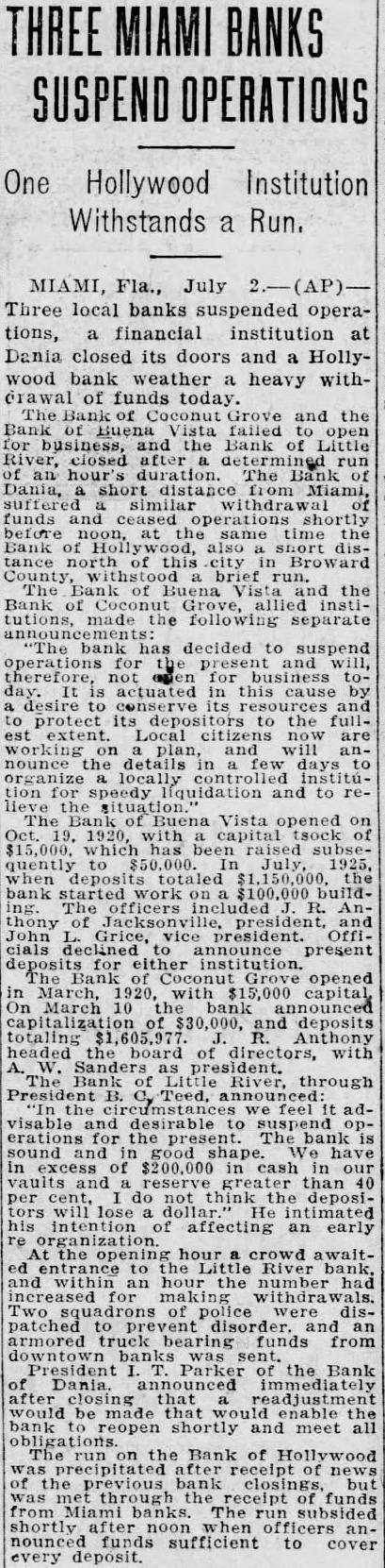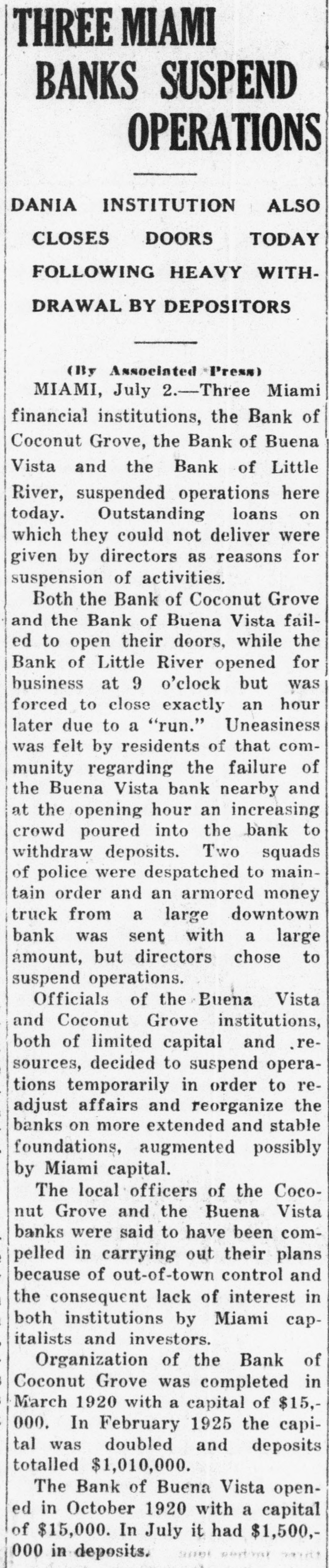 THREE MIAMI BANKS SUSPEND OPERATIONS DANIA INSTITUTION ALSO CLOSES DOORS TODAY FOLLOWING HEAVY WITHDRAWAL BY DEPOSITORS (By Associated Press) MIAMI, July 2.-Three Miami financial institutions, the Bank of Coconut Grove, the Bank of Buena Vista and the Bank of Little River, suspended operations here today. Outstanding loans on which they could not deliver were given by directors as reasons for suspension of activities. Both the Bank of Coconut Grove and the Bank of Buena Vista failed to open their doors, while the Bank of Little River opened for business at 9 o'clock but was forced to close exactly an hour later due to a "run." Uneasiness was felt by residents of that community regarding the failure of the Buena Vista bank nearby and at the opening hour an increasing crowd poured into the bank to withdraw deposits. Two squads of police were despatched to maintain order and an armored money truck from a large downtown bank was sent with a large amount, but directors chose to suspend operations. Officials of the Buena Vista and Coconut Grove institutions, both of limited capital and .resources, decided to suspend operations temporarily in order to readjust affairs and reorganize the banks on more extended and stable foundations, augmented possibly by Miami capital. The local officers of the Coconut Grove and the Buena Vista banks were said to have been compelled in carrying out their plans because of out-of-town control and the consequent lack of interest in both institutions by Miami capitalists and investors. Organization of the Bank of Coconut Grove was completed in March 1920 with a capital of $15,000. In February 1925 the capital was doubled and deposits totalled $1,010,000. The Bank of Buena Vista opened in October 1920 with a capital of $15,000. In July it had $1,500,31101 and 000 in deposits.