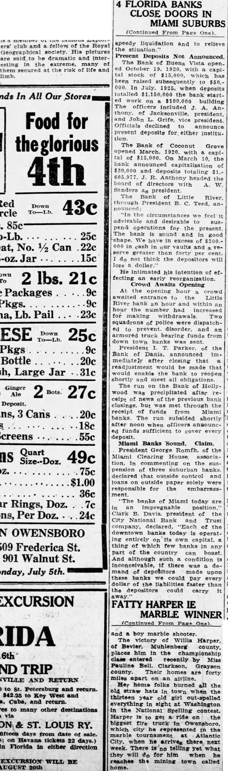 (Continued From Page One) speedy liquidation and to relieve the stiuation." Present Deposits Not Announced. The Bank of Buena Vista open. ed October 19, 1920. with capital stock of $15,000. which has been raised subsequently to $50,000. In July, 1925, when deposits totalled $1,150,000 the bank started work on $100,000 building The officers included J. A. Anthony. of Jacksonville, president, Food for and John L. Grife, vice president. Officials declined to announce present deposits for either institution. The Bank of Coconut Grove opened March. 1920. with a capital of $15,000. On March 10, the bank announced capitalization of 4th $30,000 and deposits totaling $1,605,977. R. Anthony headed the board of directors with A. W. Sanders as president. The Bank of Little River, through President B. C. Teed, anDown 43c nounced: To-Lb. the circumstances we feel it advisable and desirable to suspend operations for the present The bank is sound and in good 25c shape. We have in excess of $200.000 in cash in our vaults and serve greater than forty per cent. 15c do not think the depositors will lose dollar." He intimated his intention of ef2 lbs. 21c fecting an early reorganization. To Crowd Awaits Opening 9c At the opening hour a crowd awaited to the Little 9c River bank an hour and within an hour the number had increased 23c for making withdrawals Two squadrons of police were dispatched to prevent. disorder. and an Down 25c armored truck bearing funds from To-Lb. down town banks was sent. President T. Parker, of the 9c Bank of Dania. announced im20c mediately after closing that readjustment would be made that would enable the bank to reopen shortly and meet all obligations. The run on the Bank of HollyGinger 2 Bots. 27c wood was precipitated after reAle ceipt of news of the previous bank Deposit. closings, but was met through the receipt of funds from Miami 20c banks. The run subsided shortly after noon when officers announc18c ed funds sufficient to cover every 55c deposit. Miami Banks Sound. Claim. President George Romfh, of the 49c Miami Clearing House associaSize--Doz. tion. in commenting on the suspension of three suburban banks. 75c declared that outside control and $1.00 loans on outside paper solely were responsible for the embarrass36c ment. "The banks of Miami today are 7c in an impregnable position,' Clark B. Davis, president of the 24c City National Bank and Trust company, declared, "Each of the downtown banks today is operating entirely on its own capital, a thing of which few banks in any part of the country boast. And although such condition is inconceivable, if there was demand of depositors made upon these banks we could pay every dollar of the liabilities faster than the depositors could carry it FATTY HARPER IE MARBLE WINNER