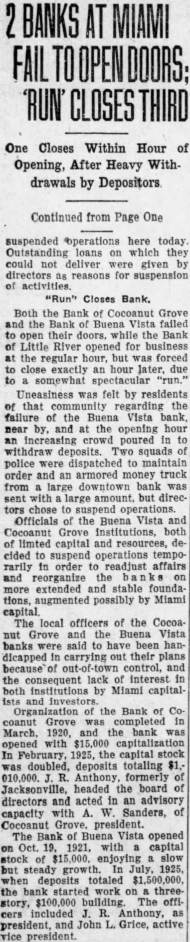 Both the Bank of Cocoanut Grove and the Bank of Buena Vista failed open their doors. while the Bank of Little River opened for business at the regular hour, but was forced to close exactly an hour later, due to somewhat spectacular "run." Uneasiness was felt by residents of that regarding the failure of the Buena Vista bank, near by, and at the opening hour an increasing crowd poured in to withdraw deposits. Two squads of police were dispatched to maintain order and an armored money truck from a large downtown bank was sent with large amount. but directors chose to suspend operations. Officials of the Buena Vista and Cocoanut Grove institutions, both of limted capital and resources, decided to suspend operations temporarily in order to readjust affairs and reorganize the on more extended and stable foundations, augmented possibly by Miami The local officers of the Cocoanut Grove and the Buena Vista banks were said to have been handicapped in carrying out their plans because of town control, and the consequent lack of interest in both institutions by Miami capitalists and investors. Organization of the Bank of Cocoanut Grove was completed in March. 1920, and the bank was opened with $15,000 capitalization In February, 1925, the capital stock was doubled, deposits totaling $1,010.000. J. R. Anthony, formerly of Jacksonville, headed the board of directors and acted in an advisory capacity with A. W. Sanders, of Cocoanut Grove. president. The Bank of Buena Vista opened on Oct. 19, 1921, with a capital stock of $15,000. enjoying a slow but steady growth. In July, 1925, when deposits totaled $1,500,000, the bank started work on threestory, $100,000 building. The officers included J. R. Anthony, as president, and John L. Grice, active vice president.