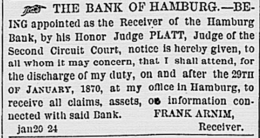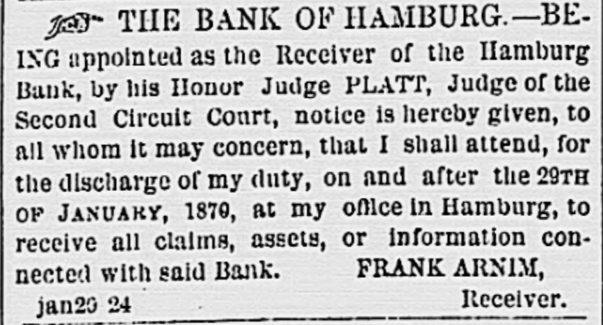 ING appointed as the Receiver of the Hamburg Bank, by his Honor Judge PLATT, Judge of the Second Circuit Court, notice is hereby given, to all whom it may concern, that I shall attend, for the discharge of my duty, on and after the 29TH OF JANUARY, 1870, at my office in Hamburg, to receive all claims, assets, or information connected with said Bank.