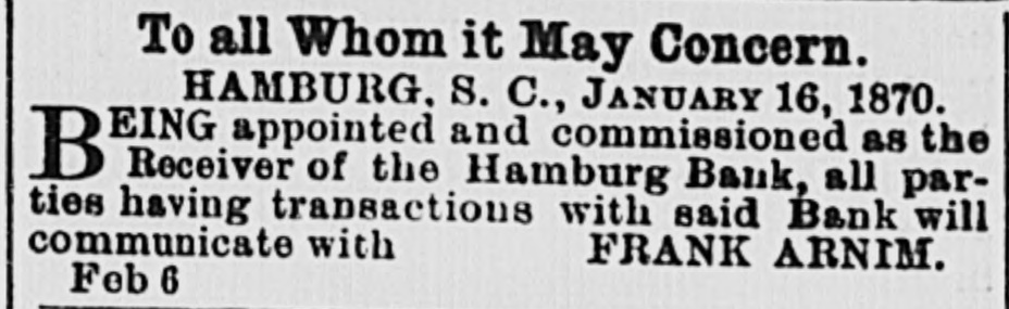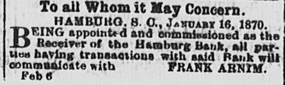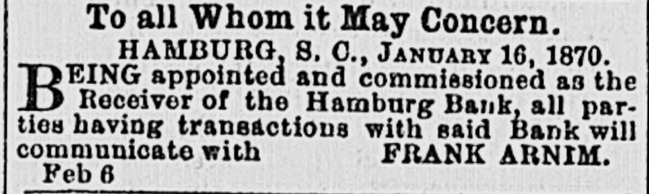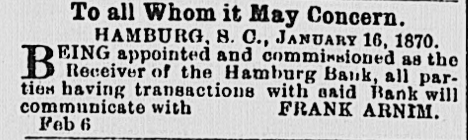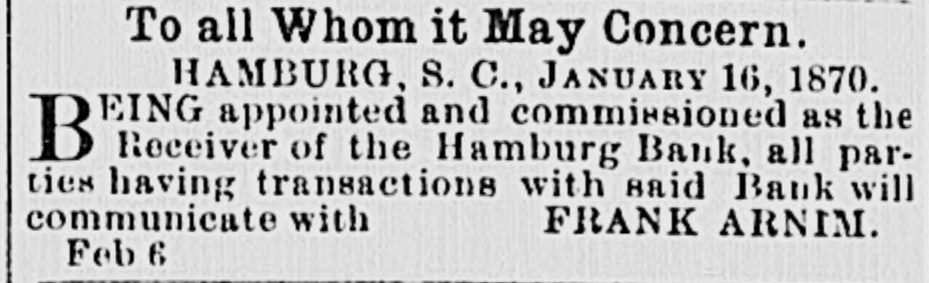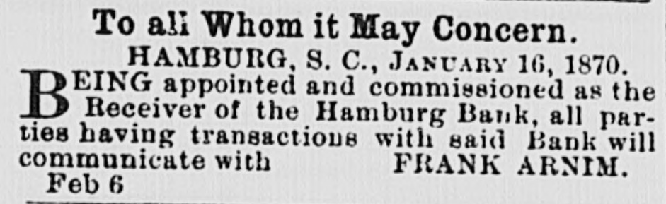 To all Whom it May Concern. HAMBURG, S. C., JANUARY 16, 1870. B EING appointed and commissioned as the Receiver of the Hamburg Bank, all parties having transactions with said Bank will communicate with FRANK ARNIM. Feb 6
