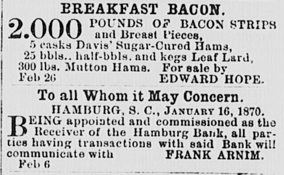 BREAKFAST BACON. POUNDS OF BACON STRIPS 2.000 and Breast Pieces, 5 casks Davis' Sugar-Cured Hams, 25 bbls.. half-bbls. and kegs Leaf Lard, 300 lbs. Mutton Hams. For sale by Feb 26 EDWARD HOPE. To all Whom it May Concern. HAMBURG, S. C., JANUARY 16, 1870. EING appointed and commissioned as the B Receiver of the Hamburg Bank, all parties having transactions with said Bank will communicate with FRANK ARNIM. Feb 6