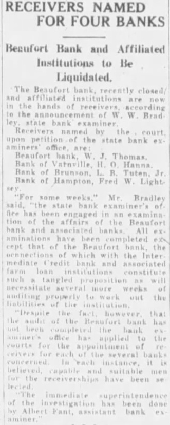 RECEIVERS NAMED FOR FOUR BANKS Beaufort Bank and Affiliated Institutions to Be Liquidated. The Beaufort closed the hands the W. Brad bank the upon of the state bank Hanna Bank of Bank of Hampton, Fred W Light For some weeks." Mr Bradley examiner's has been tion the affairs Beaufort bank All the the which the and associated constitute : auditing the that he has of for the immediate the has