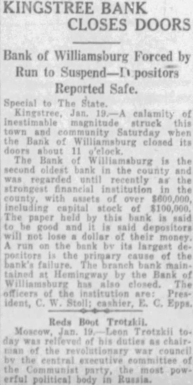 KINGSTREE BANK CLOSES DOORS Bank of Williamsburg Forced by Run to Suspend- positors Reported Safe. Special State Kingstree, calamity of inestimable magnitude struck this and the Bank of its Bank illiamsburg is the oldest bank in the was regarded until recently strongest financial institution the county over stock paper this bank said and will dollar money. run the its largest the cause of the The main by the has The officers the institution ident, Epps. Reds Boot Trotzkii. day relieved his the council by the executive most erful political body Russia.