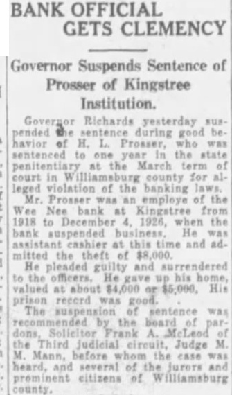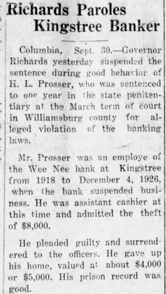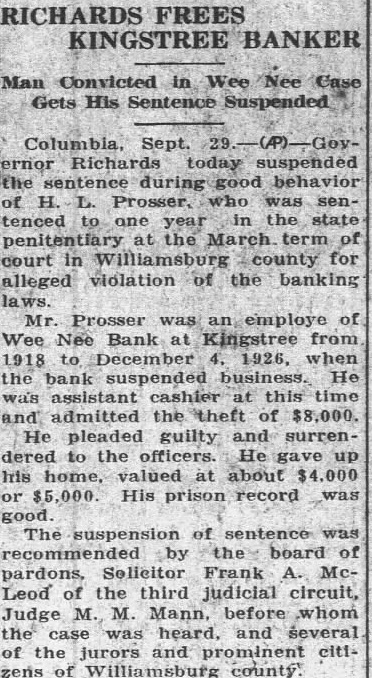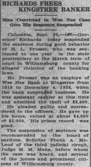 Suspends Bankers Sentence COLUMBIA, Sept. 30. Governor Richards yesterday SUSpended the sentence during good bebavior of H. L. Prosser, who was sentenced to one year in the state penitentiary at the March term of court in Williamsburg county for alleged violation of the banking laws. Mr. Prosger was an employe of the Wee Nee bank at Kingstree from 1918 to December 4. 1926. when the bank suspended business. He was assistant cashier at this time and admitted the theft of $8,000 He pleaded guilty and surrendered to the officers. He gave up his home, valued at about $4,000 or $5,000. His prison record was good. The suspension of sentence was recommended by the board of pardons. Solicitor Frank A. McLeod of the Third julicial circuit. Judge M. M. Mann. before whom the case was heard. and several of the jurors and prominent citizens of Williamsburg