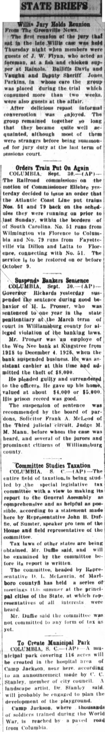Willis Jury Holds Reunion From The Greenville News. The first reunton of the jury that sat in the late Willis case was held Thursday night when members were guests of J. W. Flynn, who acted as foreman, at a fish and chicken supper at Rainola. Bailiffs Davis and Vaughn and Deputy Sheriff Jones Parkins, in whose care the group was placed during the trial which consumed more than two weeks. were also guests at the affair. After delicious repast informal conversation was enjoyed. The group remained together so long that they became quite well aequainted, although most of them were strangrs before being summoned for jury duty at the last term of sessions court.