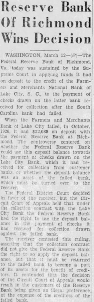 Reserve Bank Of Richmond Wins Decision WASHINGTON March 12-(P)-The Federal Reserve Bank of Richmond, Va., today was sustained by the Supreme Court in applying funds it had on deposit to the credit of the Farmers and National Bank of Lake City, S. C., to the payment of checks drawn on the latter bank recelved for collection after the South Carolina bank had failed. When the Farmers and Merchants Bank of Lake City failed in October 1926, had $22,088 on with the Federal Reserve Bank at RichThe on whether the Federal Reserve Bank could use this deposit balance towards the payment checks drawn on the Lake City Bank, which it had recelved for collection from customer banks, whether the deposit balance was an the failed bank which must be turned over to the The Federal District Court decided in but Circuit Court of Appeals held that under the contract with the Lake Cit: Bank the Federal Reserve Bank had the to use the deposit balance in payment checks it had received for collection drawn against the failed bank The receiver contested this ruling that the collection contract did not give the Federal Reserve Bank the apply the deposit balbut that returned must be the failed become part the decision of the Circuit Court of would result of the Reserve Bank being given at the expense of the creditors of the failed bank