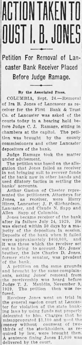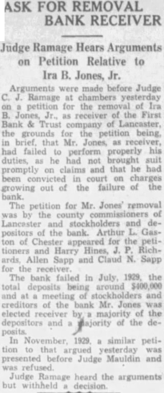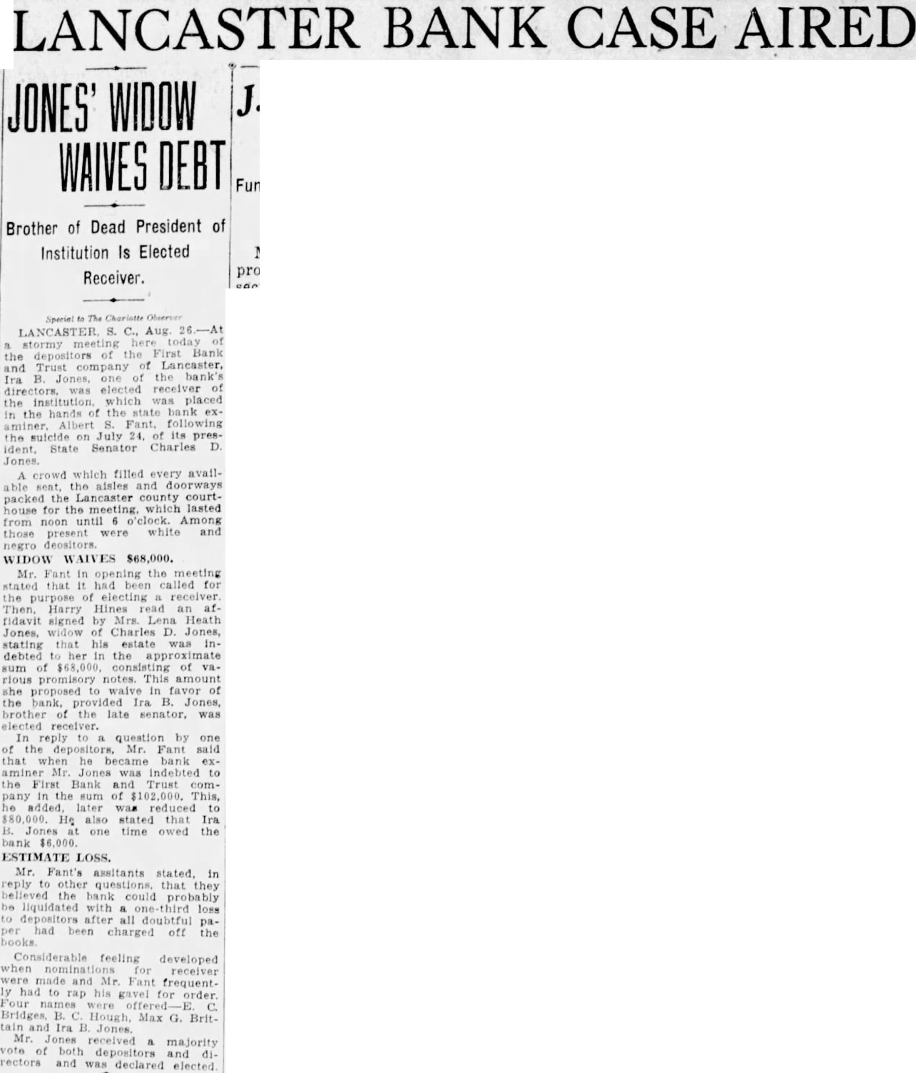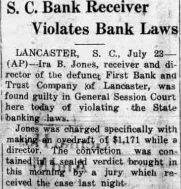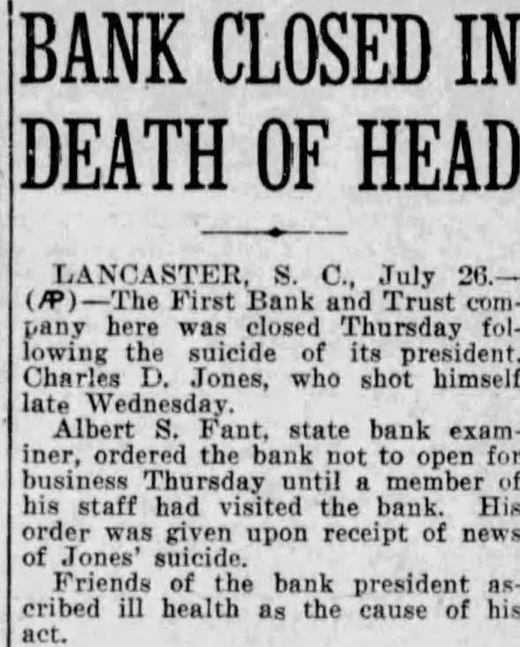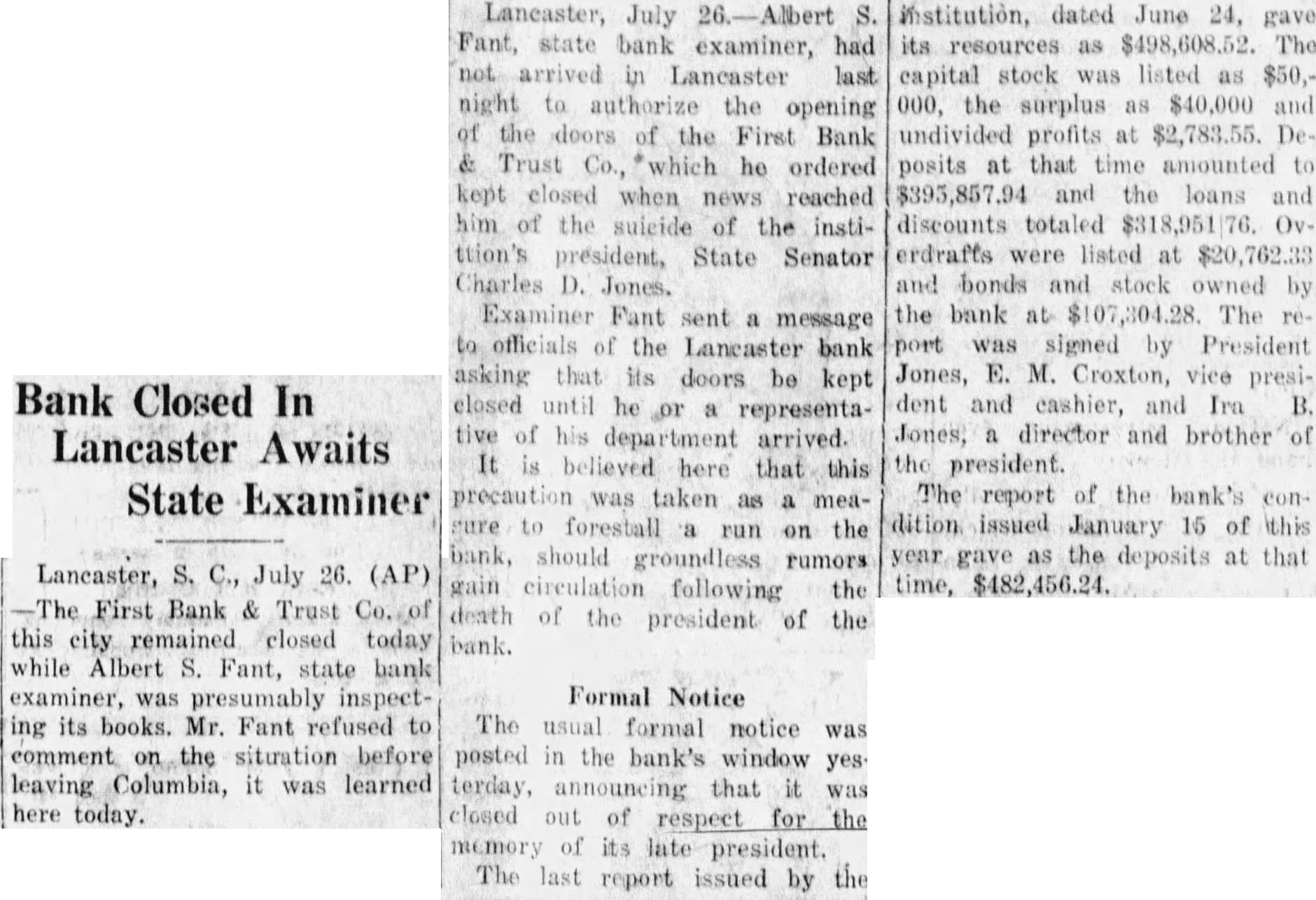 The usual formal notice was posted in the bank's window yesterday, announcing that it was closed out of respect for the memory of its late president. The last report issued by the institution, dated June 24, gave its resources as $498,608.52. The capital stock was listed as $50,000, the surplus as $40,000 and undivided profits at $2,783.55. Deposits at that time amounted to $395,857.94 and the loans and discounts totaled $318,951.76 Overdraffs were listed at $20,762.33 and bonds and stock owned by the bank at $107,304.28. The report was signed by President Jones, E. M. Croxton, vice president and cashier, and Ira B. Jones, a director and brother of the president. The report of the bank's condition issued January 16 of this year gave as the deposits at that time, $482,456.24.