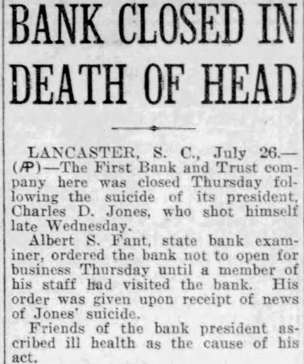 Laneaster, July 26.-Albert S. Fant, state bank examiner, had not arrived in Lancaster last night to authorize the opening of the doors of the First Bank & Trust Co., *which he ordered kept closed when news reached him of the suicide of the instittion's president, State Senator Charles D. Jones. Examiner Fant sent a message to officials of the Laneaster bank asking that its doors be kept closed until he or a representative of his department arrived. It is believed here that this precaution was taken as a measure to forestall a run on the bank, should groundless rumors gain circulation following the death of the president of the bank.