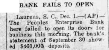 BANK FAILS TO OPEN Laurens, S. Dec. The Peoples Enterprise Bank here failed to open its doors for business this morning. The bank's statement of September 30 showed $460,000 deposits.