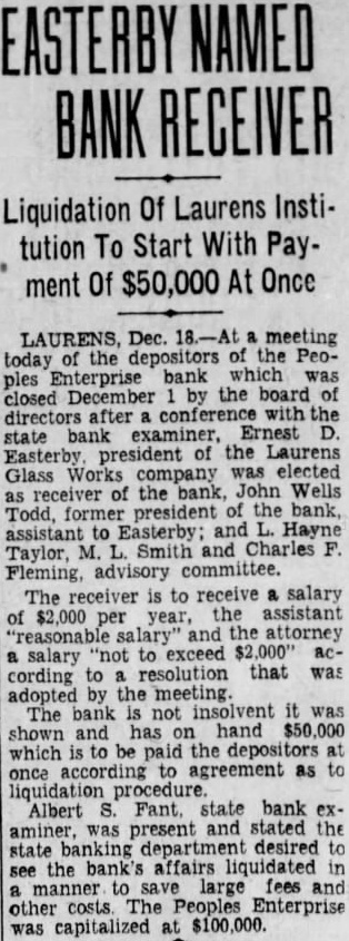 EASTERBY BANK RECEIVER Liquidation Of Laurens Institution To Start With Pay$50,000 At Once ment LAURENS, Dec. meeting today of the depositors of the Peoples Enterprise bank which was closed December the board directors after conference with the state bank examiner, Ernest Easterby president of the Laurens Glass Works company was elected receiver of the bank, John Wells as Todd, former president of the bank, assistant to Easterby; and Hayne Taylor, M. Smith and Charles F. Fleming, advisory The receiver is to receive salary $2,000 year, the assistant per "reasonable and the attorney "not to exceed acsalary to resolution that was cording adopted by the meeting. The bank not insolvent was shown and has on hand $50,000 which be paid the depositors once according to agreement as to liquidation procedure. Albert Fant. state bank examiner, was present and stated state desired to see the bank's affairs liquidated large fees costs was capitalized at $100,000.