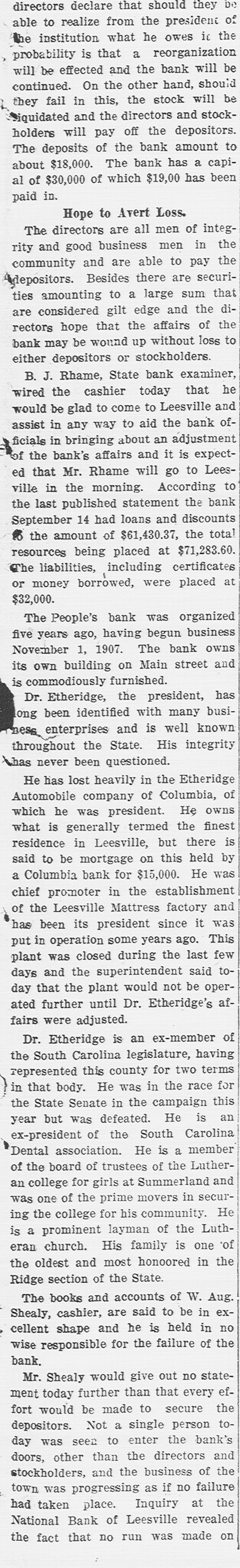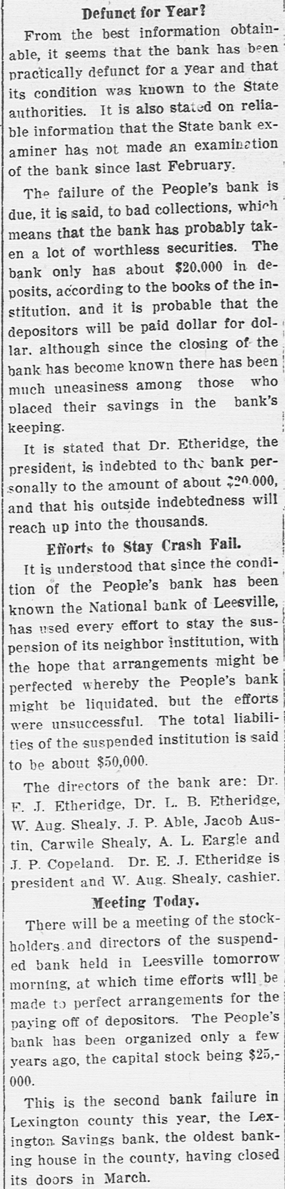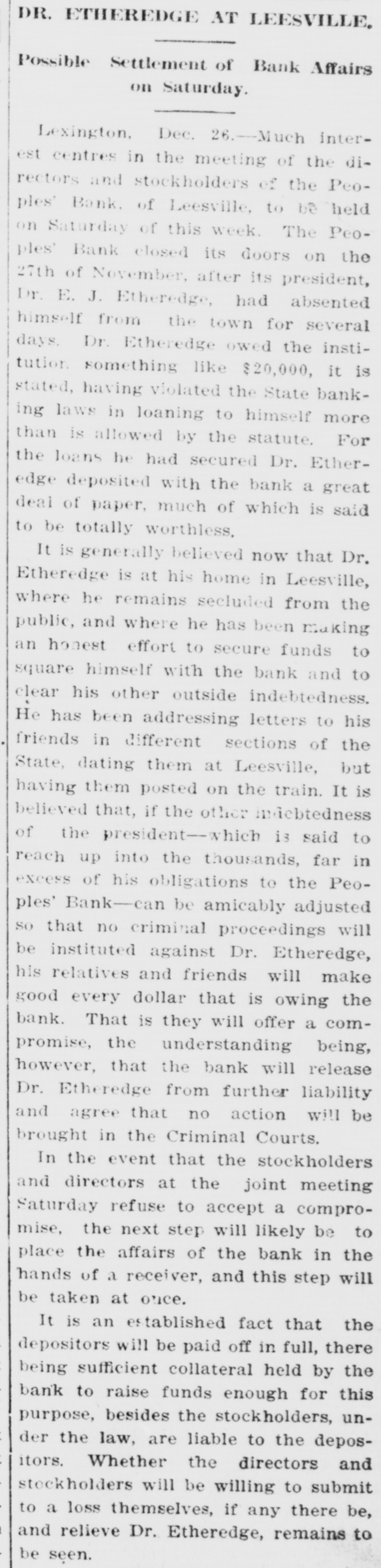 COMPROMISE PLANS FAIL. Affairs of Closed Leesville Bank More Muddled. Lexington, Jan. 11.-Contrary to all expectations no settlement was reached yesterday between the stockholders and directors of the defunct People's Bank, of Leesville, and its president, Dr. E. J. Etheridge, whose indebtedness to the bank is said to have caused the institution to close its doors on November 27 last. At a joint meeting of the stockholders and directors of the bank, held on December 28, a committee of three-J. Lee Etheridge, of Augusta; John P. Able, of Leesville, and W. E. Bodie, of Batesburg-was appointed to make a full and complete settlement of the bank's affairs. They were given until January to make their report. It developed yesterday, it is said, that the closed institution i. indebted to the National Loan and Exchange Bank, of Columbia, its correspondent, to the amount of about $15,000. Alleged Offer of Compromise. The relatives of Dr. Etheridge, it is said, have raised the sum of $8,000 and have offered this amount in the way of a compromise for his indebtedness to the institution, which, it is understood, amounts to approximately $18,000. It appears now, also, that the depositors cannot hope to realize more than 50 per cent. any time soon, and to do this it will be necessary for a compromise to be effected with the National Loan and Exchange Bank, of Columbia, which compromise is now being considered. While the stockholders are liable to the depositors to the amount of the stock held by each individual stockholder, under the State banking law, it is not believed that more than $5,000 from this source could be raised. The bank holds a great deal of gilt-edge collateral, but hardly enough to pay off the depositors and the other creditors, too. Receiver Possible. In the event that the compromise can be agreed upon, it is probable that the next step will be to place the affairs of the institution in the hands of a receiver, but this course, it is admitted, will prove disastrous to all parties concerned. Attorneys representing the bank and Dr. Etheridge held a conference in Columbia to-day, but the result of their efforts toward an amicable adjustment could not be learned. F. E. Dreher, of the Lexington law firm of Efird & Dreher, who has been retained by Dr. Etheridge's family, when seen to-day, stated that he had nothing to make public at this time. Dr. Etheridge, the president of the defunct bank, who absented himself from his home for several weeks, is now at Leesville and consulted with his counsel yesterday and is doing all in his power, it is stated, to raise sufficient funds to meet his obligations, not only to the bank, but to his other creditors.