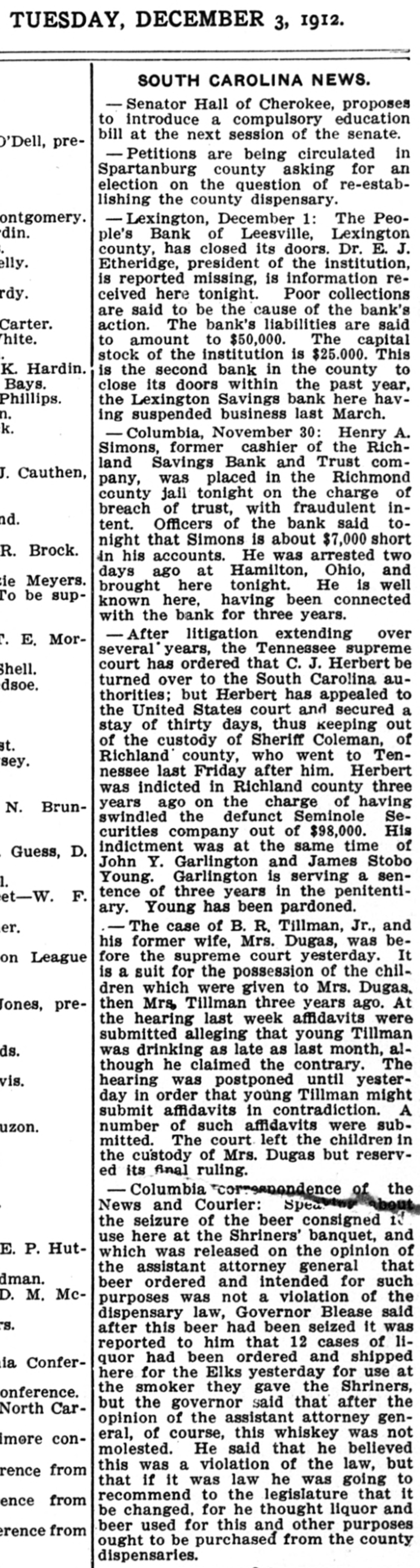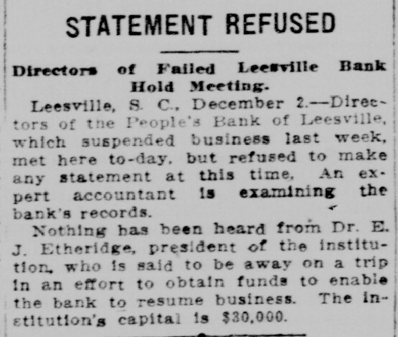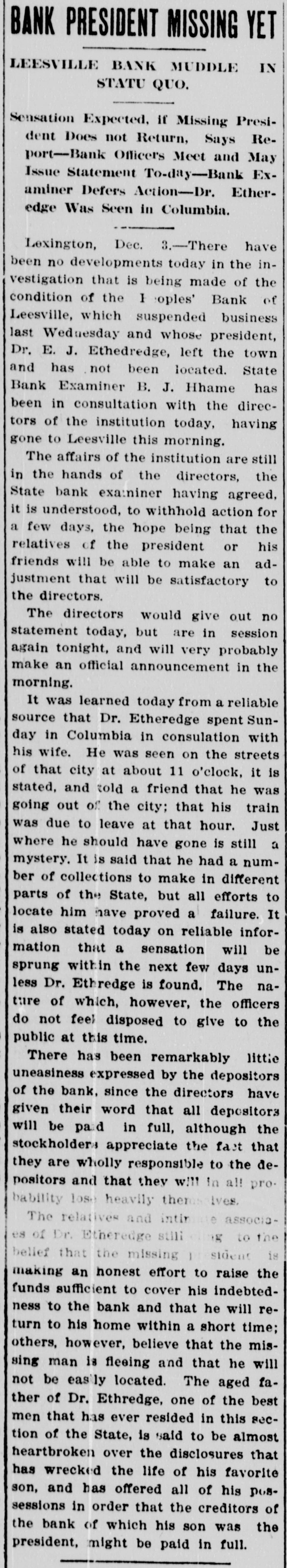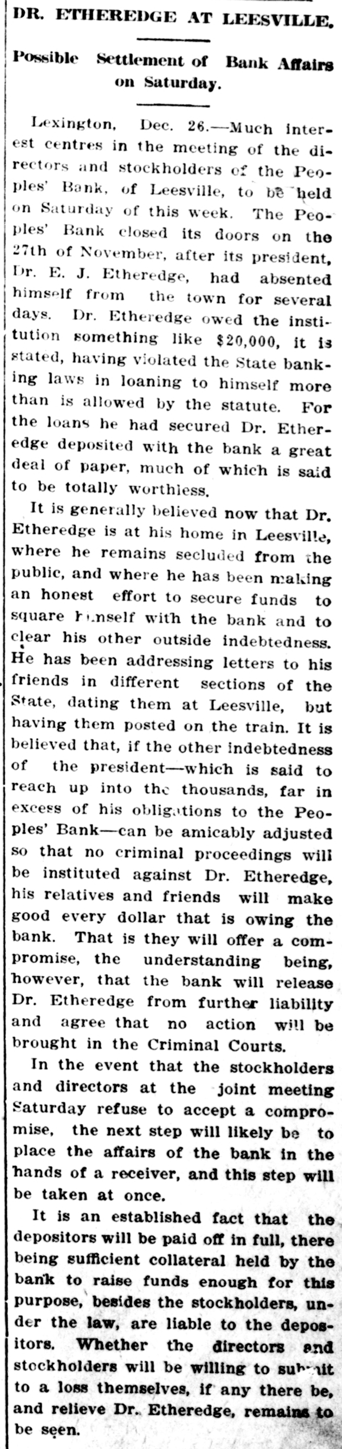 COMPROMISE PLANS FAIL. Affairs of Closed Leesville Bank More Muddled. Lexington, Jan. 11.-Contrary to all expectations no settlement was reached yesterday between the stockholders and directors of the defunct People's Bank, of Leesville, and its president, Dr. E. J. Etheridge, whose indebtedness to the bank is said to have caused the institution to close its doors on November 27 last. At a joint meeting of the stockholders and directors of the bank, held on December 28, a committee of three-J. Lee Etheridge, of Augusta; John P. Able, of Leesville, and W. E. Bodie, of Batesburg-was appointed to make a full and complete settlement of the bank's affairs. They were given until January to make their report. It developed yesterday, it is said, that the closed institution i. indebted to the National Loan and Exchange Bank, of Columbia, its correspondent, to the amount of about $15,000. Alleged Offer of Compromise. The relatives of Dr. Etheridge, it is said, have raised the sum of $8,000 and have offered this amount in the way of a compromise for his indebtedness to the institution, which, it is understood, amounts to approximately $18,000. It appears now, also, that the depositors cannot hope to realize more than 50 per cent. any time soon, and to do this it will be necessary for a compromise to be effected with the National Loan and Exchange Bank, of Columbia, which compromise is now being considered. While the stockholders are liable to the depositors to the amount of the stock held by each individual stockholder, under the State banking law, it is not believed that more than $5,000 from this source could be raised. The bank holds a great deal of gilt-edge collateral, but hardly enough to pay off the depositors and the other creditors, too. Receiver Possible. In the event that the compromise can be agreed upon, it is probable that the next step will be to place the affairs of the institution in the hands of a receiver, but this course, it is admitted, will prove disastrous to all parties concerned. Attorneys representing the bank and Dr. Etheridge held a conference in Columbia to-day, but the result of their efforts toward an amicable adjustment could not be learned. F. E. Dreher, of the Lexington law firm of Efird & Dreher, who has been retained by Dr. Etheridge's family, when seen to-day, stated that he had nothing to make public at this time. Dr. Etheridge, the president of the defunct bank, who absented himself from his home for several weeks, is now at Leesville and consulted with his counsel yesterday and is doing all in his power, it is stated, to raise sufficient funds to meet his obligations, not only to the bank, but to his other creditors.