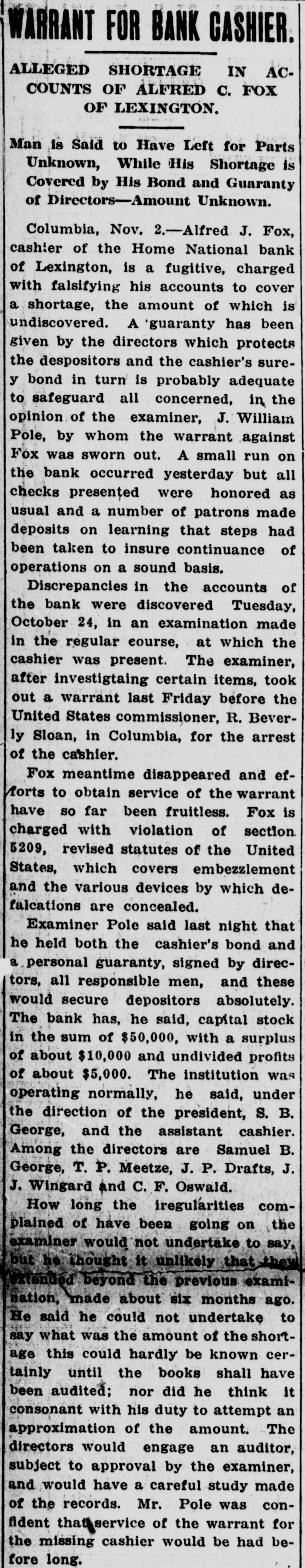 WARRANT FOR BANK CASHIER. ALLEGED SHORTAGE IN ACCOUNTS OF ALFRED C. FOX OF LEXINGTON. Man is Said to Have Left for Parts Unknown, While His Shortage is Covered by His Bond and Guaranty of Directors-Amount Unknown. Columbia, Nov. 2.-Alfred J. Fox, cashier of the Home National bank of Lexington, is a fugitive, charged with falsifying his accounts to cover a shortage, the amount of which is undiscovered. A 'guaranty has been given by the directors which protects the despositors and the cashier's surey bond in turn is probably adequate to safeguard all concerned, in the opinion of the examiner, J. William Pole, by whom the warrant against Fox was sworn out. A small run on the bank occurred yesterday but all checks presented were honored as usual and a number of patrons made deposits on learning that steps had been taken to insure continuance of operations on a sound basis. Discrepancies in the accounts of the bank were discovered Tuesday, October 24, in an examination made in the regular eourse, at which the cashier was present. The examiner, after investigtaing certain items, took out a warrant last Friday before the United States commissioner, R. Beverly Sloan, in Columbia, for the arrest of the cashier. Fox meantime disappeared and efforts to obtain service of the warrant have so far been fruitless. Fox is charged with violation of section 5209, revised statutes of the United States, which covers embezzlement and the various devices by which defalcations are concealed. Examiner Pole said last night that he held both the cashier's bond and a personal guaranty, signed by directors, all responsible men, and these would secure depositors absolutely. The bank has, he said, capital stock in the sum of $50,000, with a surplus of about $10,000 and undivided profits of about $5,000. The institution was operating normally, he said, under the direction of the president, S. B. George, and the assistant cashier. Among the directors are Samuel B. George, T. P. Meetze, J. P. Drafts, J. J. Wingard and C. F. Oswald. How long the iregularities complained of have been going on the examiner would not undertake to say, but he thought it unlikely that they extended beyond the previous examination, made about six months ago. He said he could not undertake to say what was the amount of the shortage this could hardly be known certainly until the books shall have been audited; nor did he think it consonant with his duty to attempt an approximation of the amount. The directors would engage an auditor, subject to approval by the examiner, and would have a careful study made of the records. Mr. Pole was confident that service of the warrant for the missing cashier would be had before long.