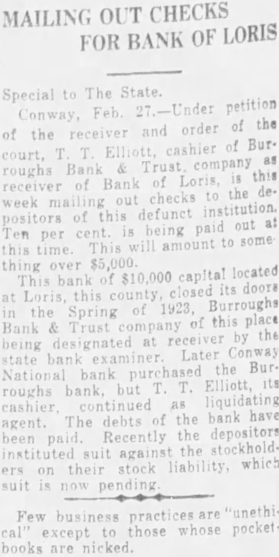 MAILING OUT CHECKS FOR BANK OF LORIS Special to The State. petition Feb of the receiver and order of the cashier of Elliott, Trust company roughs this of Bank of Loris, receiver the out checks week mailing defunct institution. this out at being paid Ten some this thing capital located $10,000 This this Burroughs the Spring 1923, this place Bank & by the receiver being Later Conway state bank the BurNational bank purchased its roughs bank, but liquidating continued the bank have agent. The debts the depositors Recently the suit which their stock is now Few business pract except books nicked