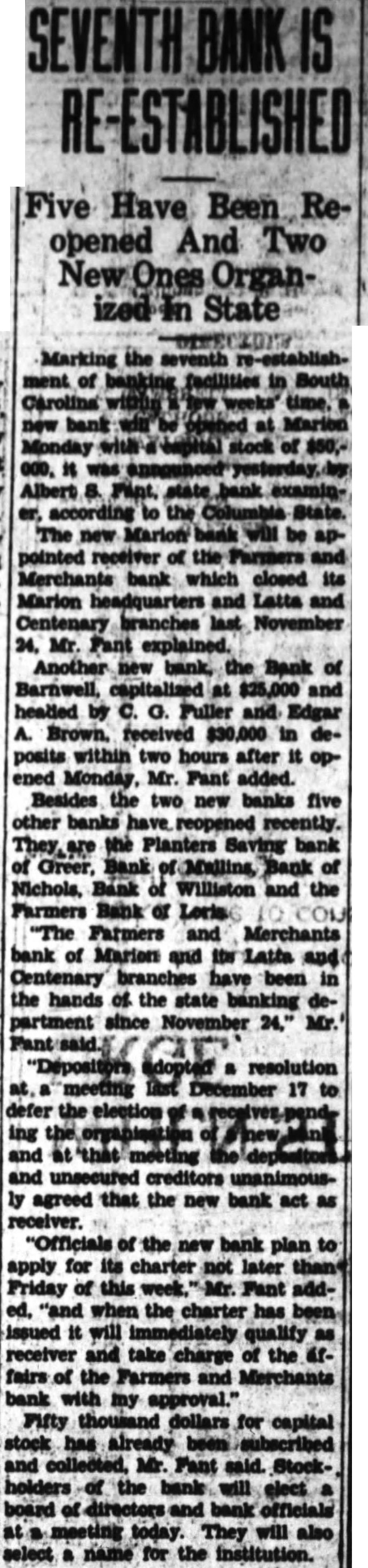 Five Have Been Reopened And Two New Ones OrganState Marking the seventh ment of banking facilities in Carolina within weeks' new bank at Marion Monday stock of $50,000, it was Albert state according to the Columbia State. The new Marion bank will be appointed receiver of the Parmers and Merchants bank which closed its Marion headquarters and Latta and Centenary branches last November 24, Mr. Fant explained. Another new bank, the Bank of Barnwell, capitalized at $25,000 and headed by c. Fuller and Edgar A. Brown. received $30,000 in deposits within two hours after it opened Monday, Mr. Fant added. Besides the two new banks five other banks have reopened recently. the Planters Saving bank of Greer, Bank Bank of Nichols, Bank of Williston and the Farmers Bank or Loris "The Farmers and Merchants bank of Marion and the Latta and Centenary branches have been in the hands of the state banking department since November 24," Mr. Depositors resolution meeting December 17 to defer the election ing and at that meeting and unsecured creditors unanimously agreed that the new bank act as receiver. "Officials of the new bank plan to apply for its charter not later Friday of this week. Fant added. "and when the charter has been issued it will immediately qualify as receiver and take charge of the arfairs of the Farmers and Merchants bank with my approval." Fifty thousand dollars for capital stock has already been subscribed and collected, Mr. Fant said. Stockholders of the bank will elect board of directors and bank officials at a meeting today. They will also select a name for the institution.